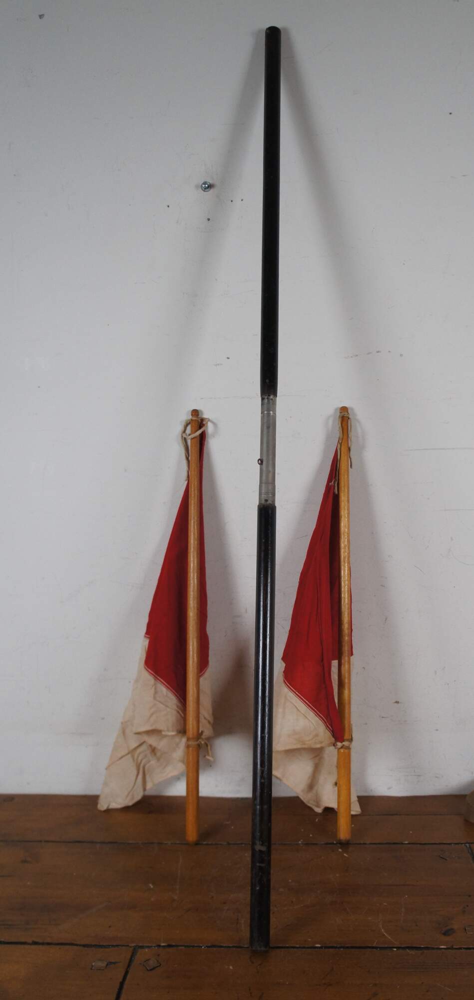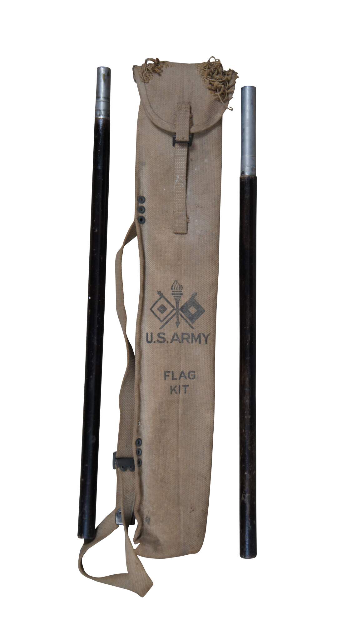 Antique World War I era US Army Signal Corps Flag Kit. Kit is nearly complete and includes: khaki canvas storage bag, two red and white Semaphore flags with wooden poles, one Wigwag flag (white square on red field), and a two-piece black painted wood pole with metal connector.