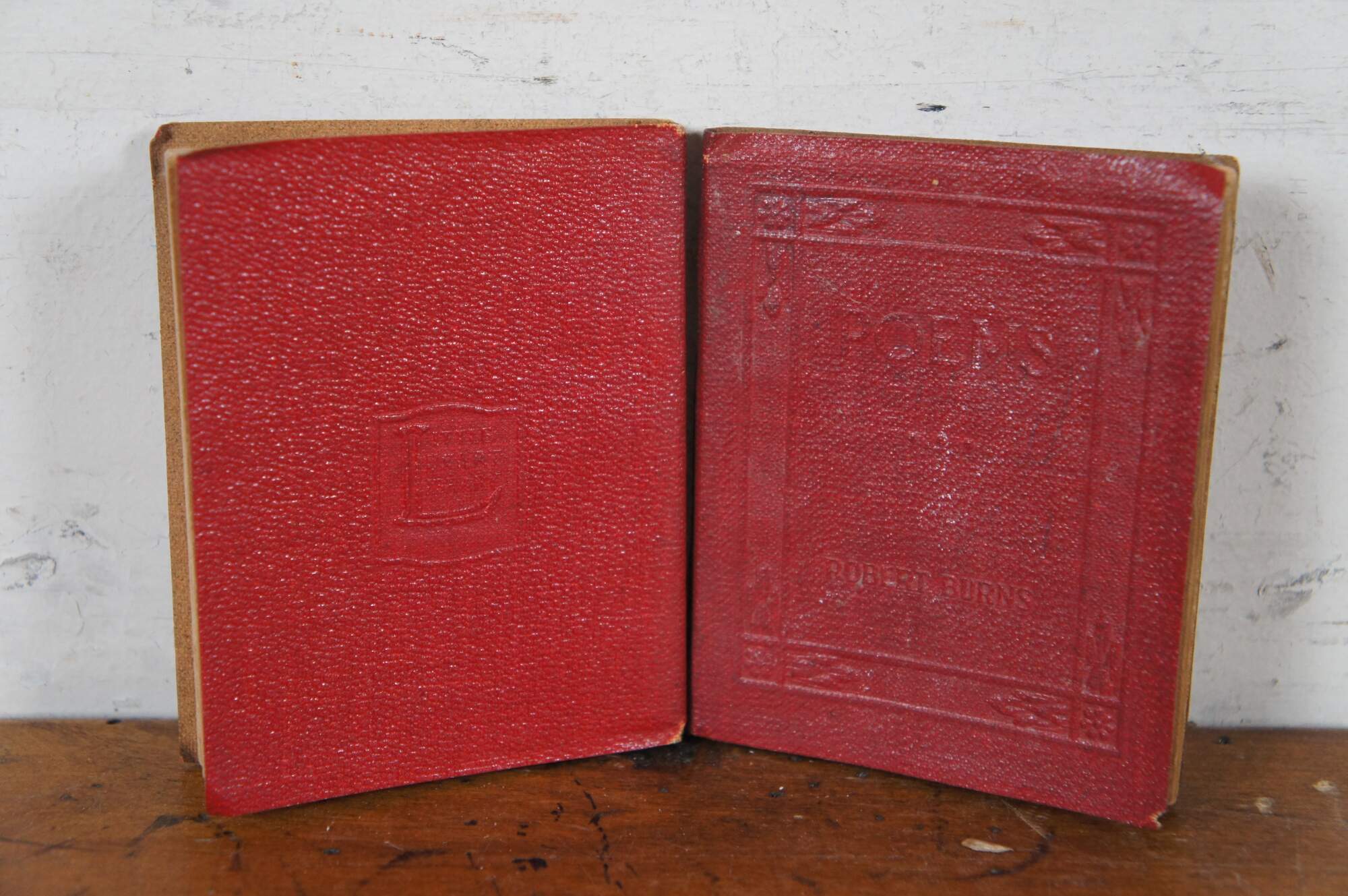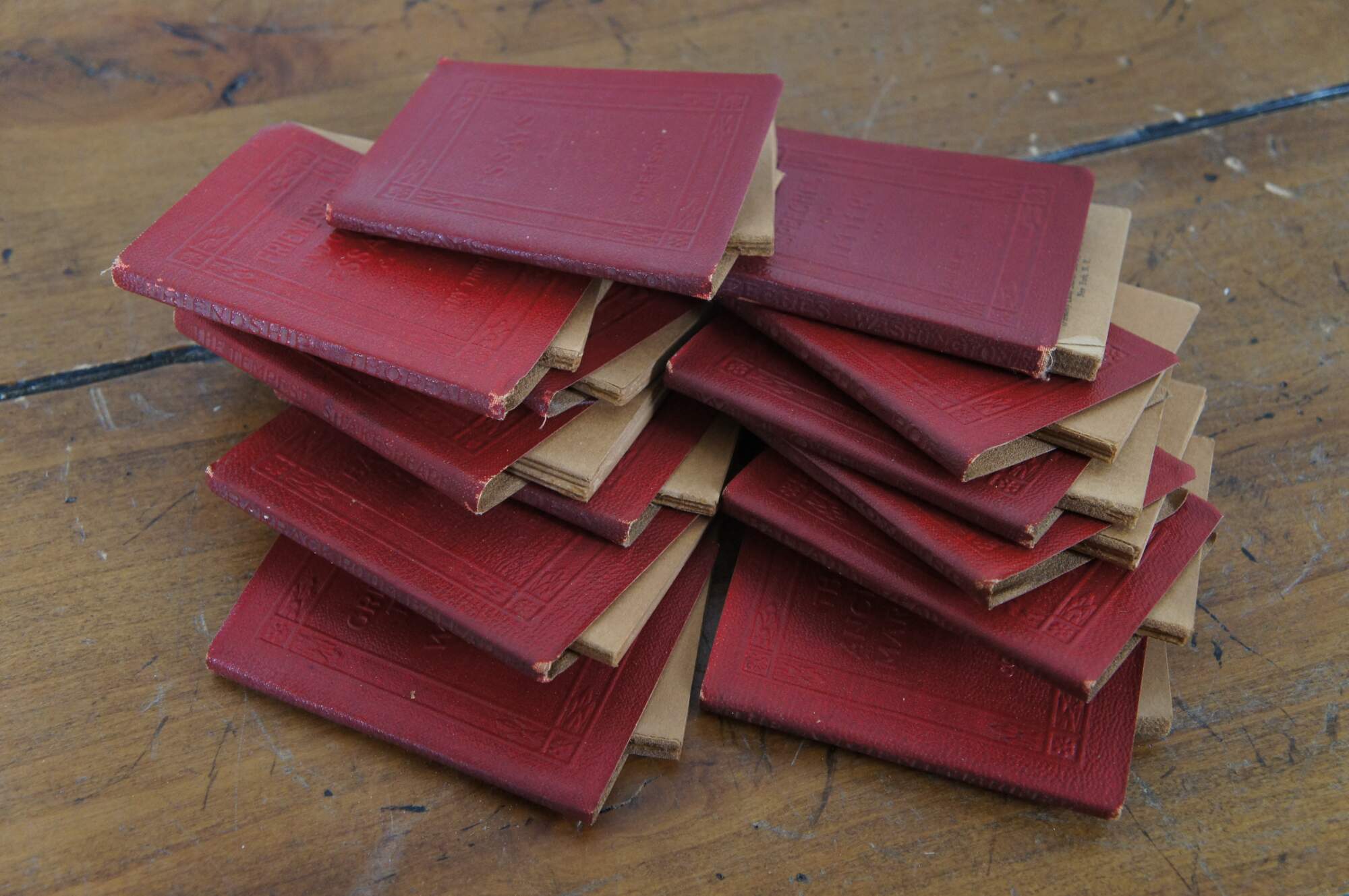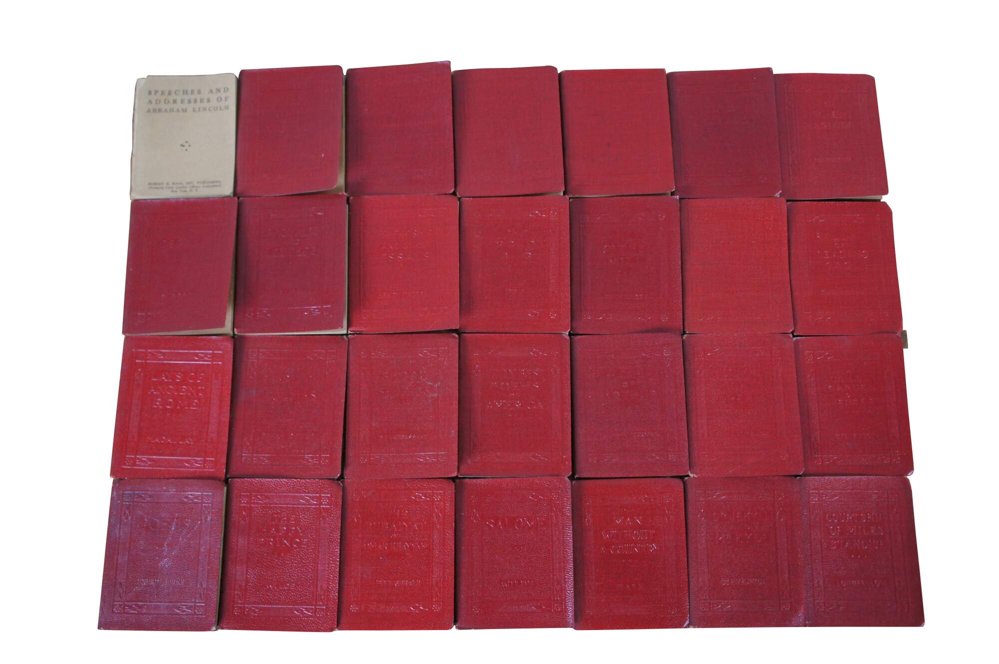 28 Antique Victorian Little Library Books. Feature embossed read leather covers from various famous works / authors.