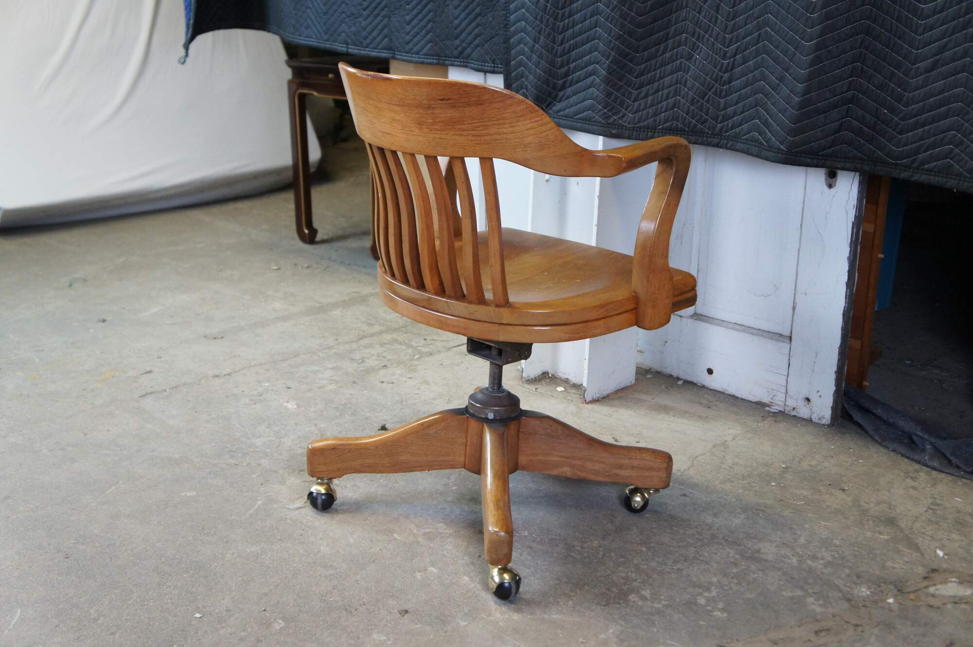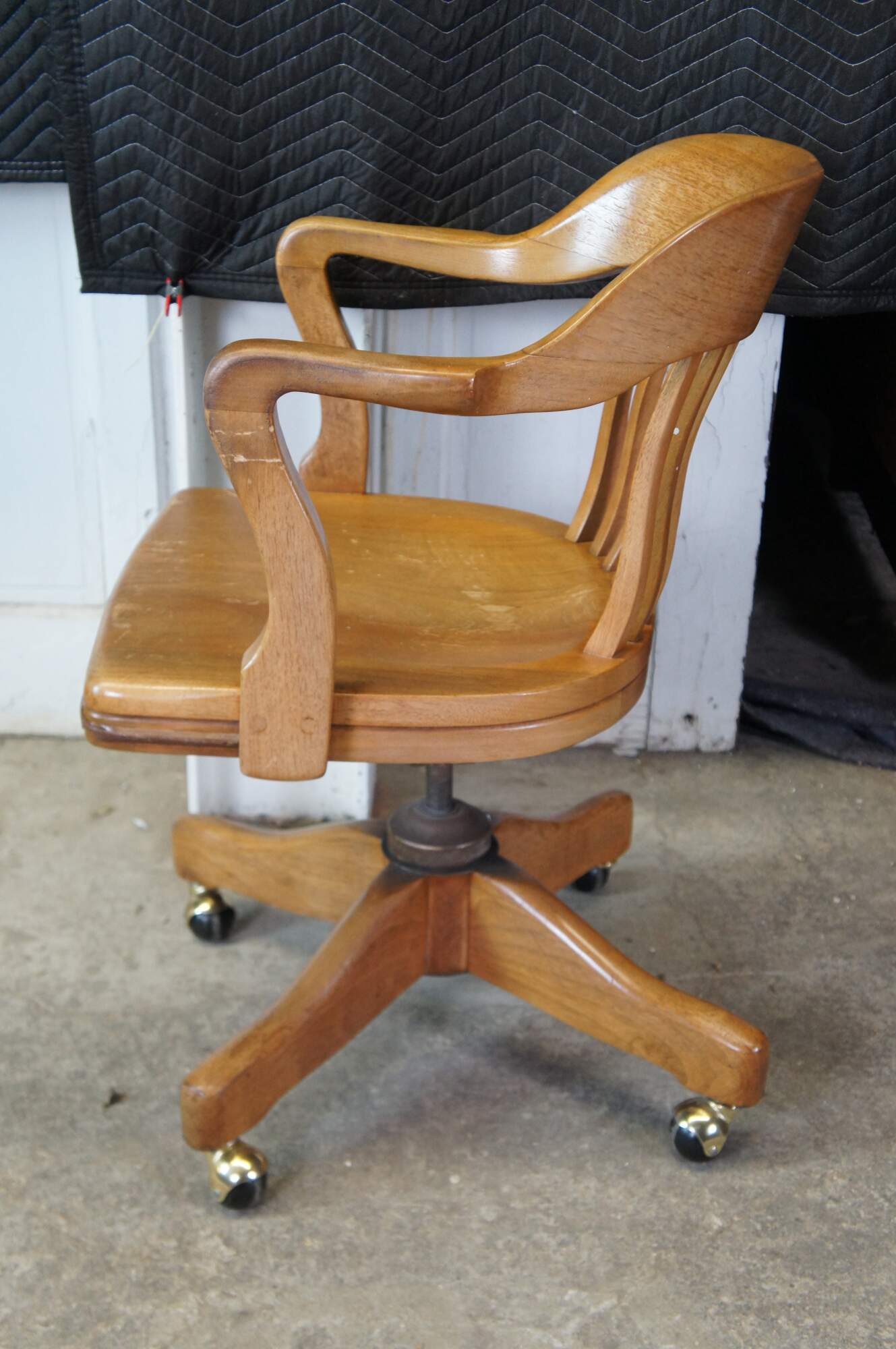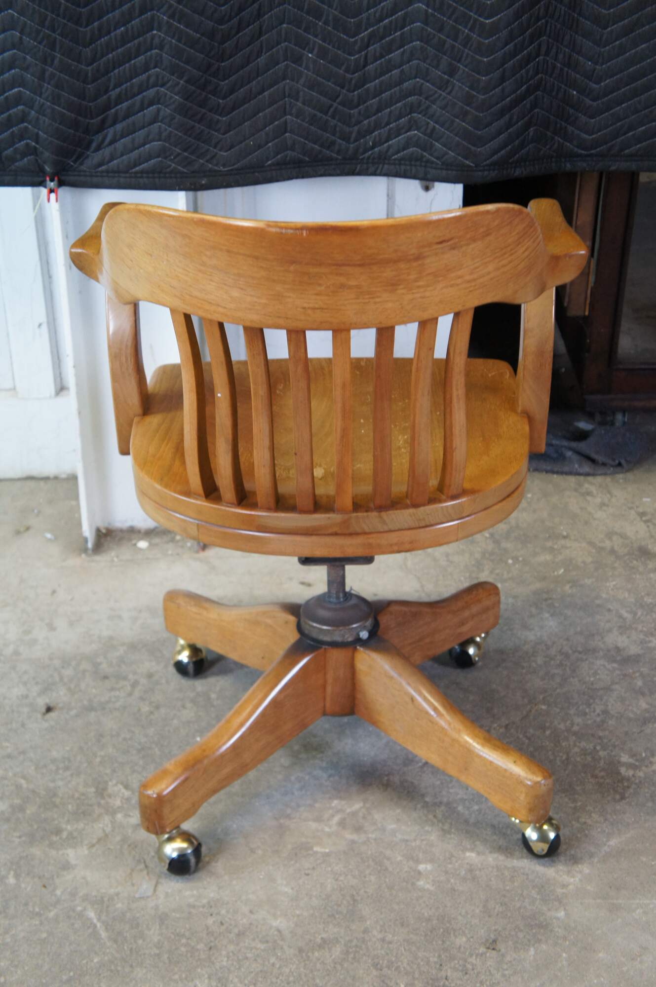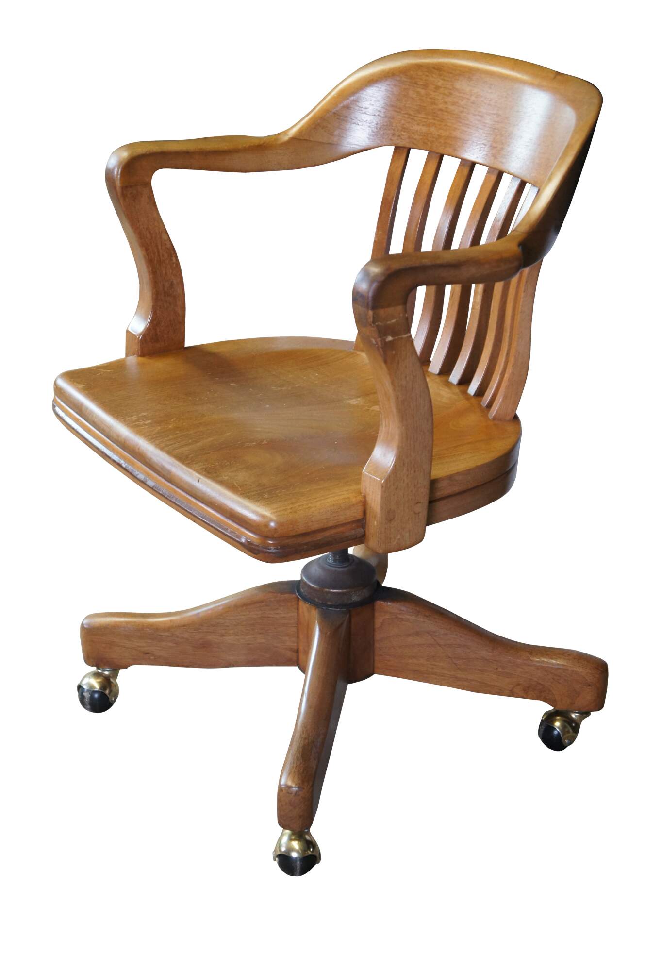 Early 20th Century Antique American Walnut Library Lawyers Desk Chair, circa 1930s. Features a curved back, contoured seat, swivel / leaning mechanism and wheels for ease of moving. The chair is meant to have an adjustable height but currently has a wire in place to keep it from moving.