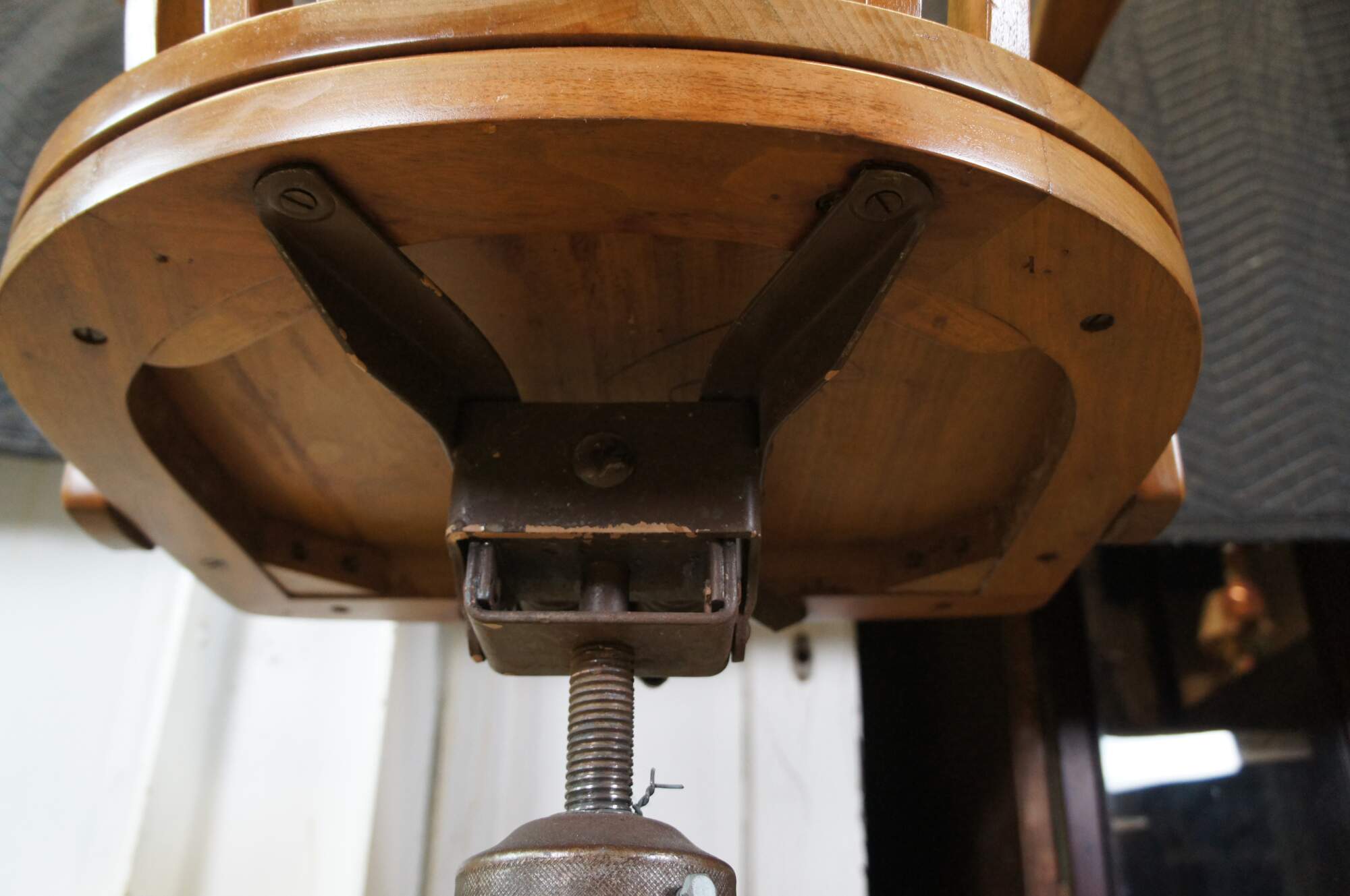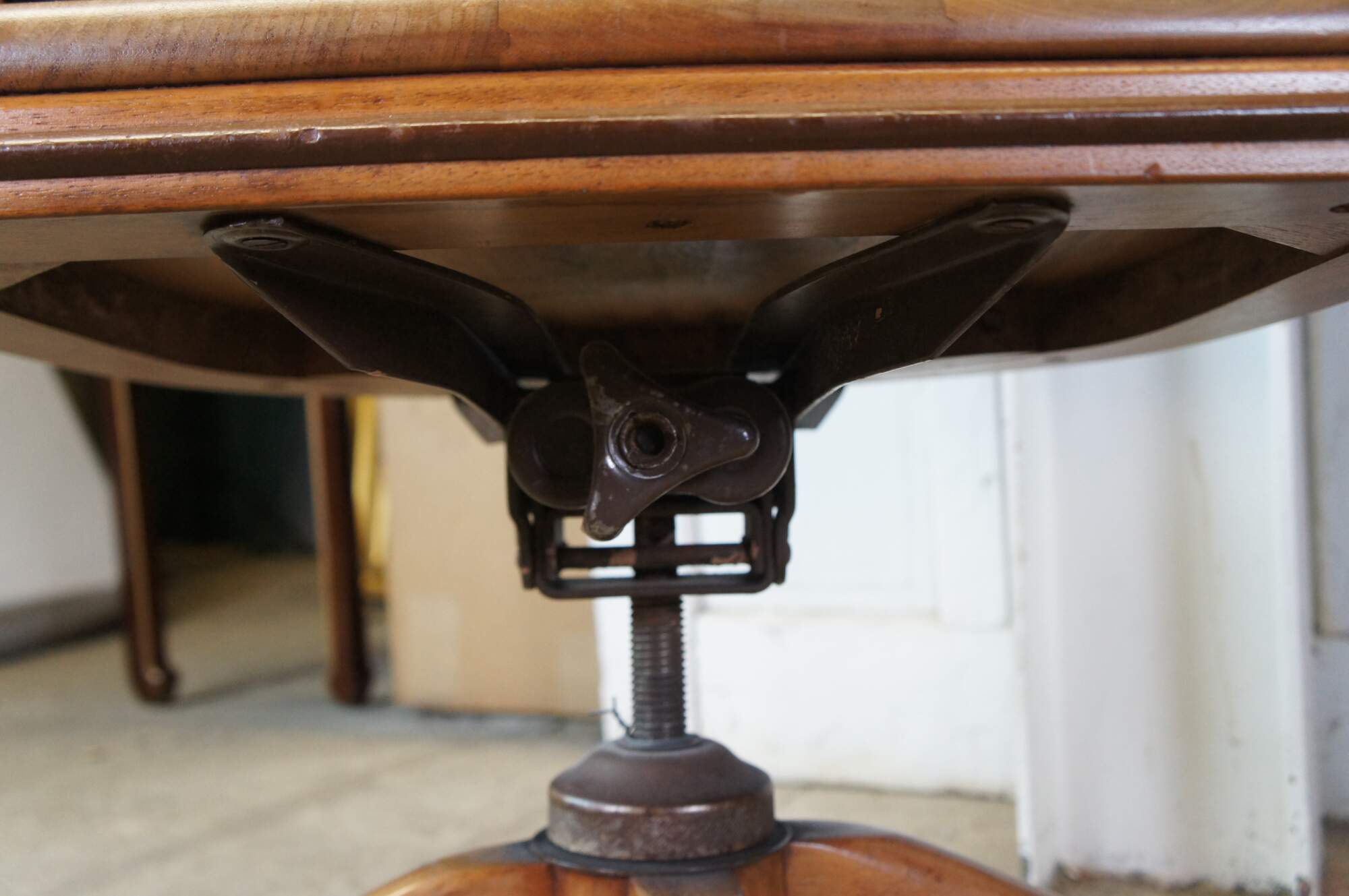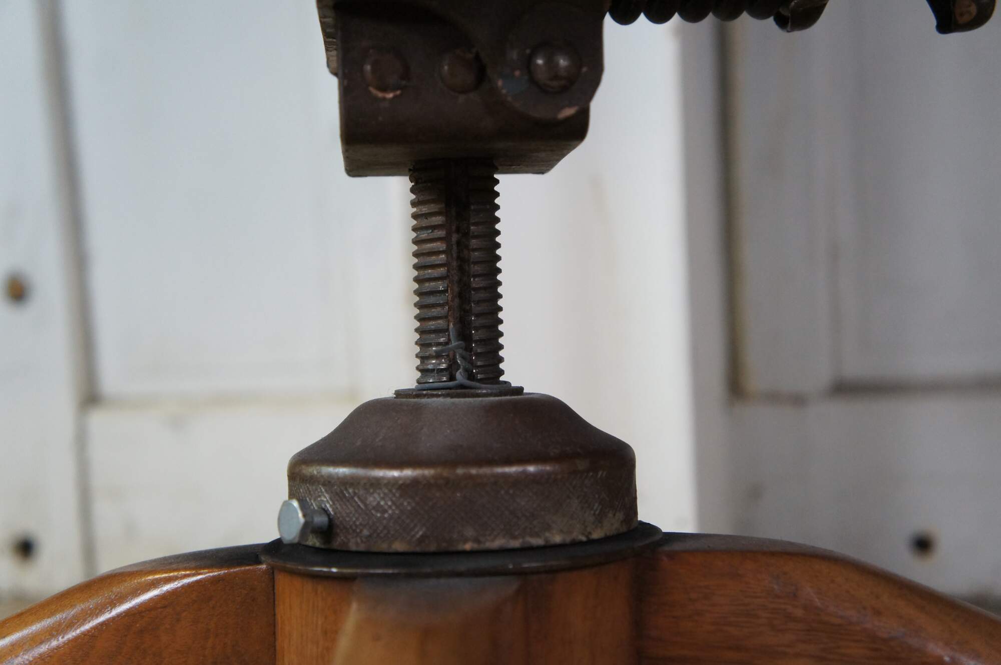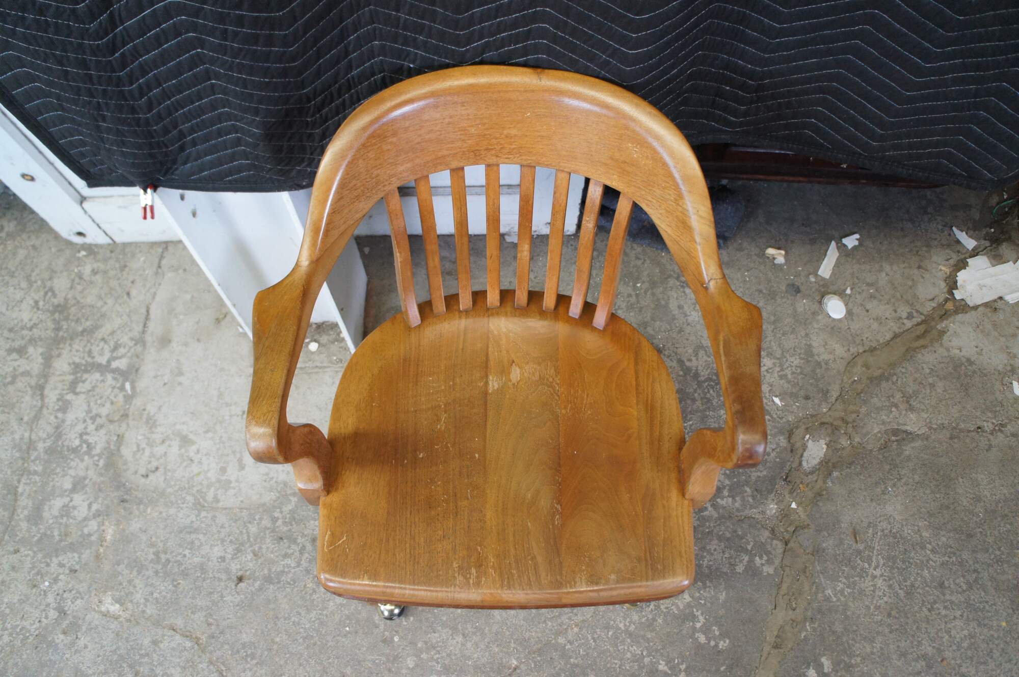 Early 20th Century Antique American Walnut Library Lawyers Desk Chair, circa 1930s. Features a curved back, contoured seat, swivel / leaning mechanism and wheels for ease of moving. The chair is meant to have an adjustable height but currently has a wire in place to keep it from moving.