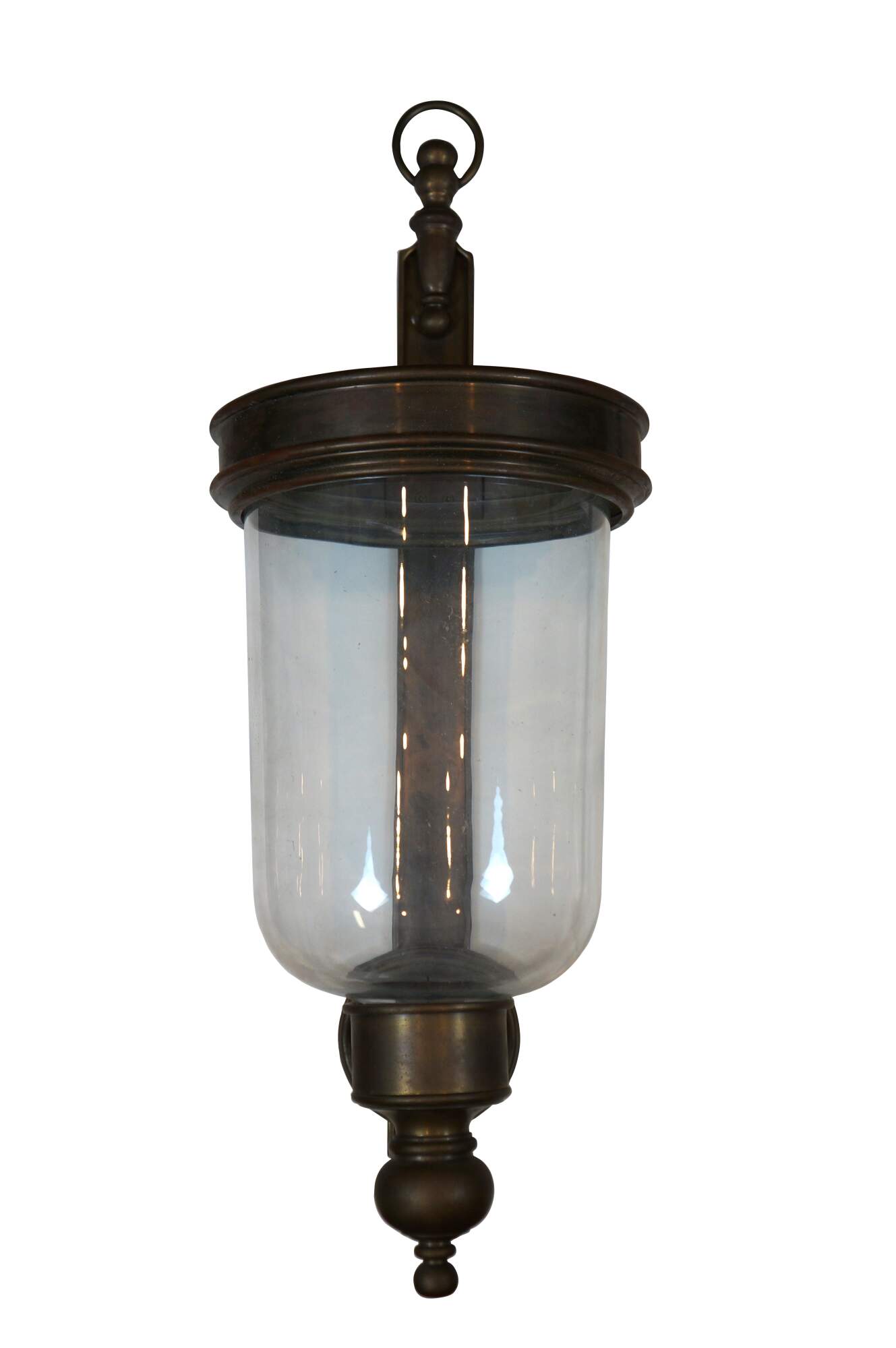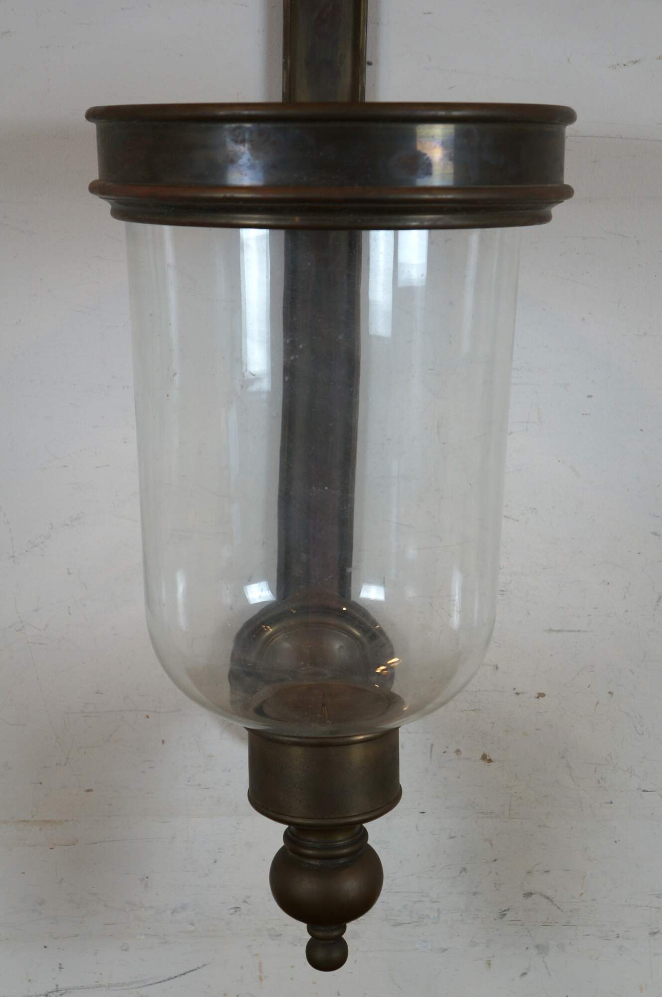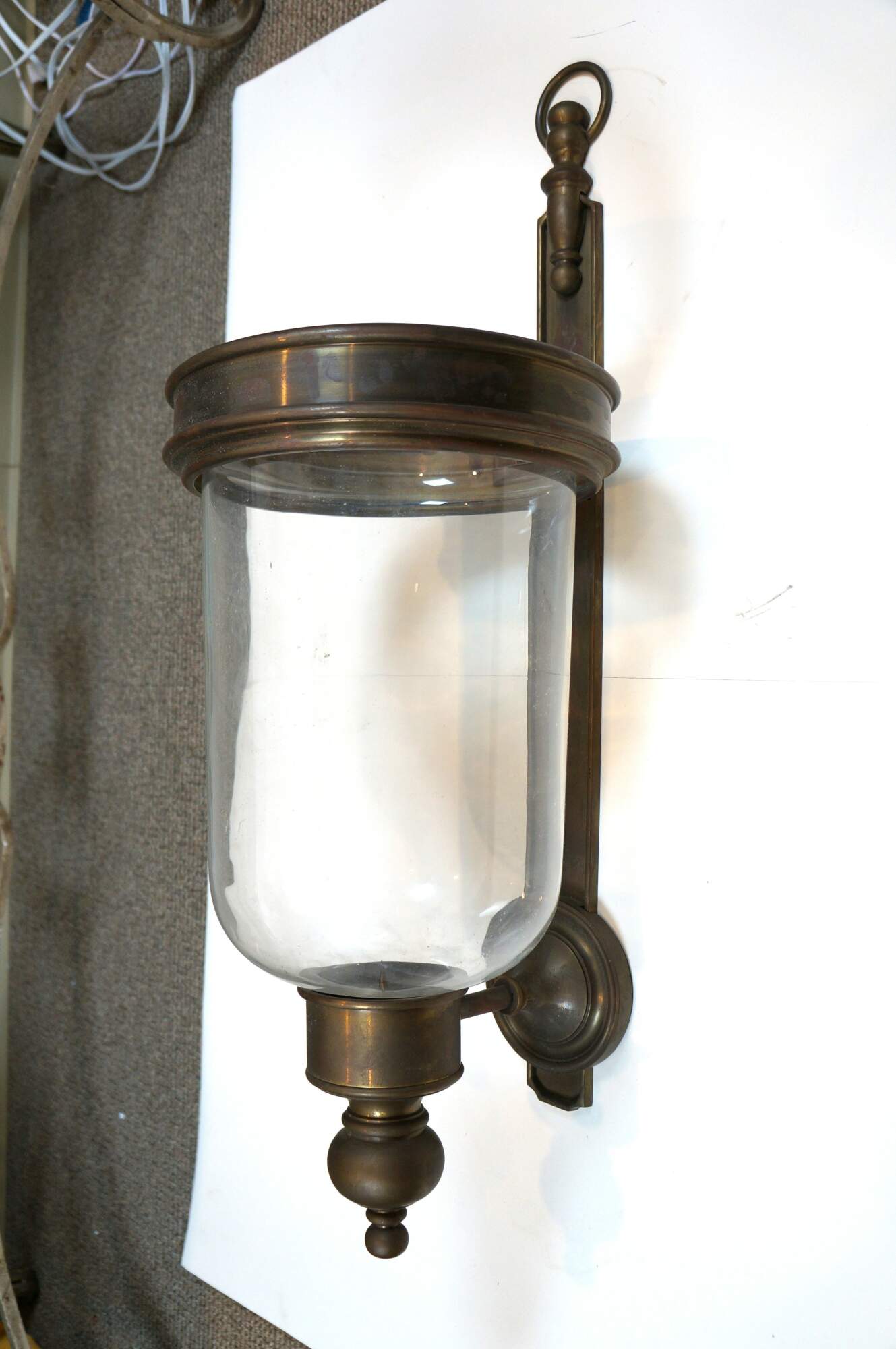 Pair of EF Chapman Visual Comfort Georgian style wall hanging candle sconces - brass finish with clear glass hurricane. Holds one pillar candle; not electrified.
