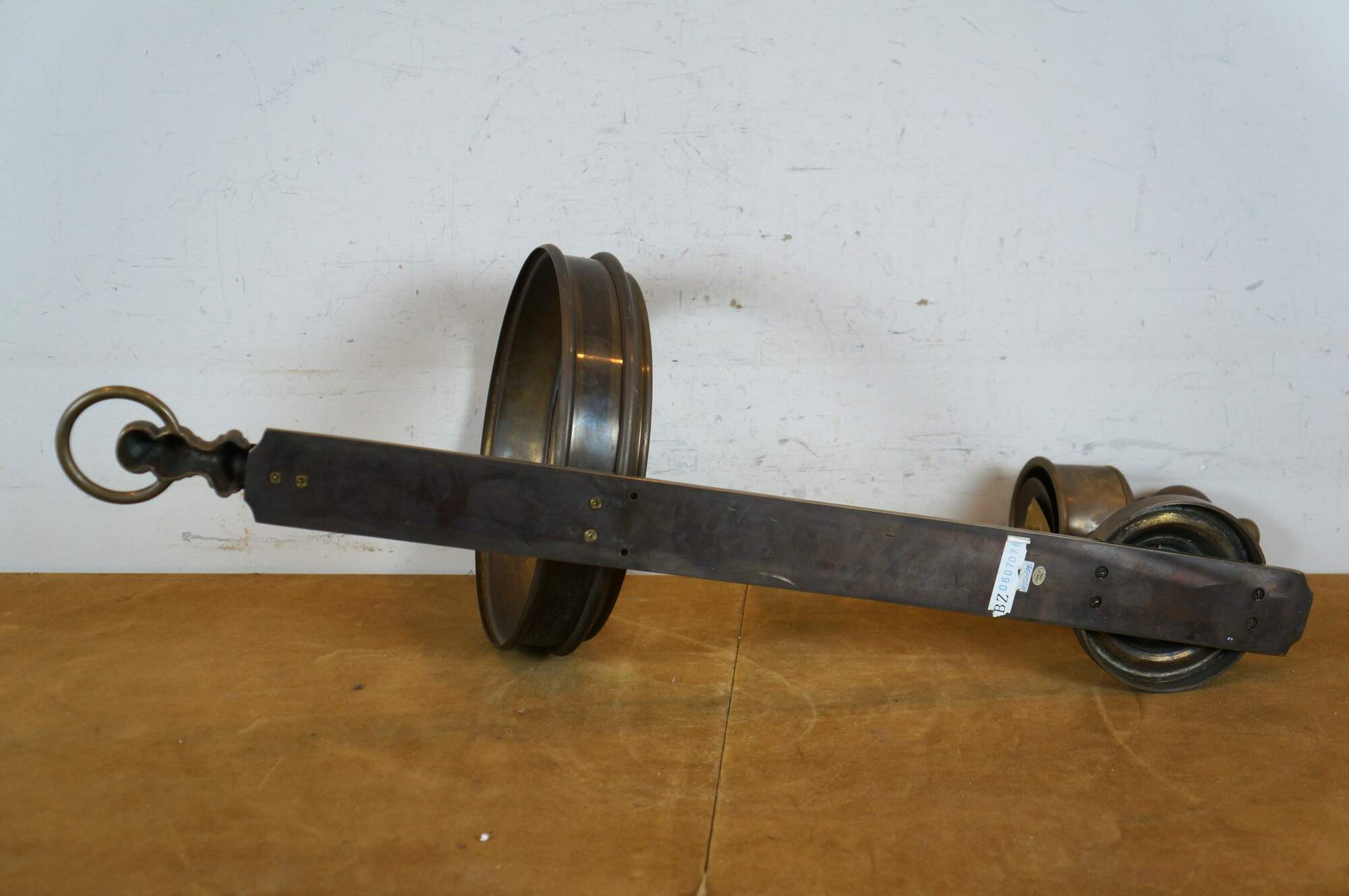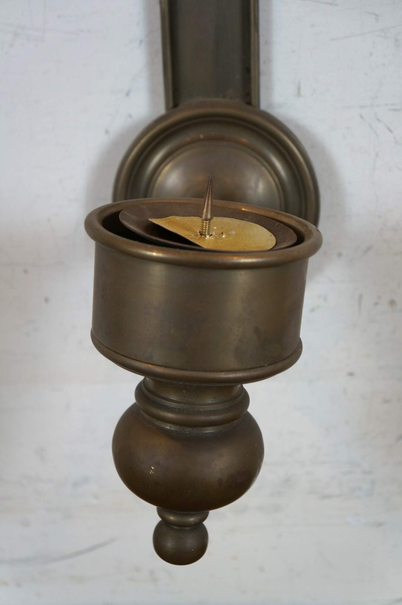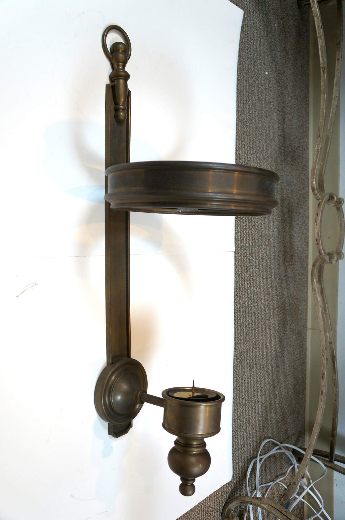 Pair of EF Chapman Visual Comfort Georgian style wall hanging candle sconces - brass finish with clear glass hurricane. Holds one pillar candle; not electrified.