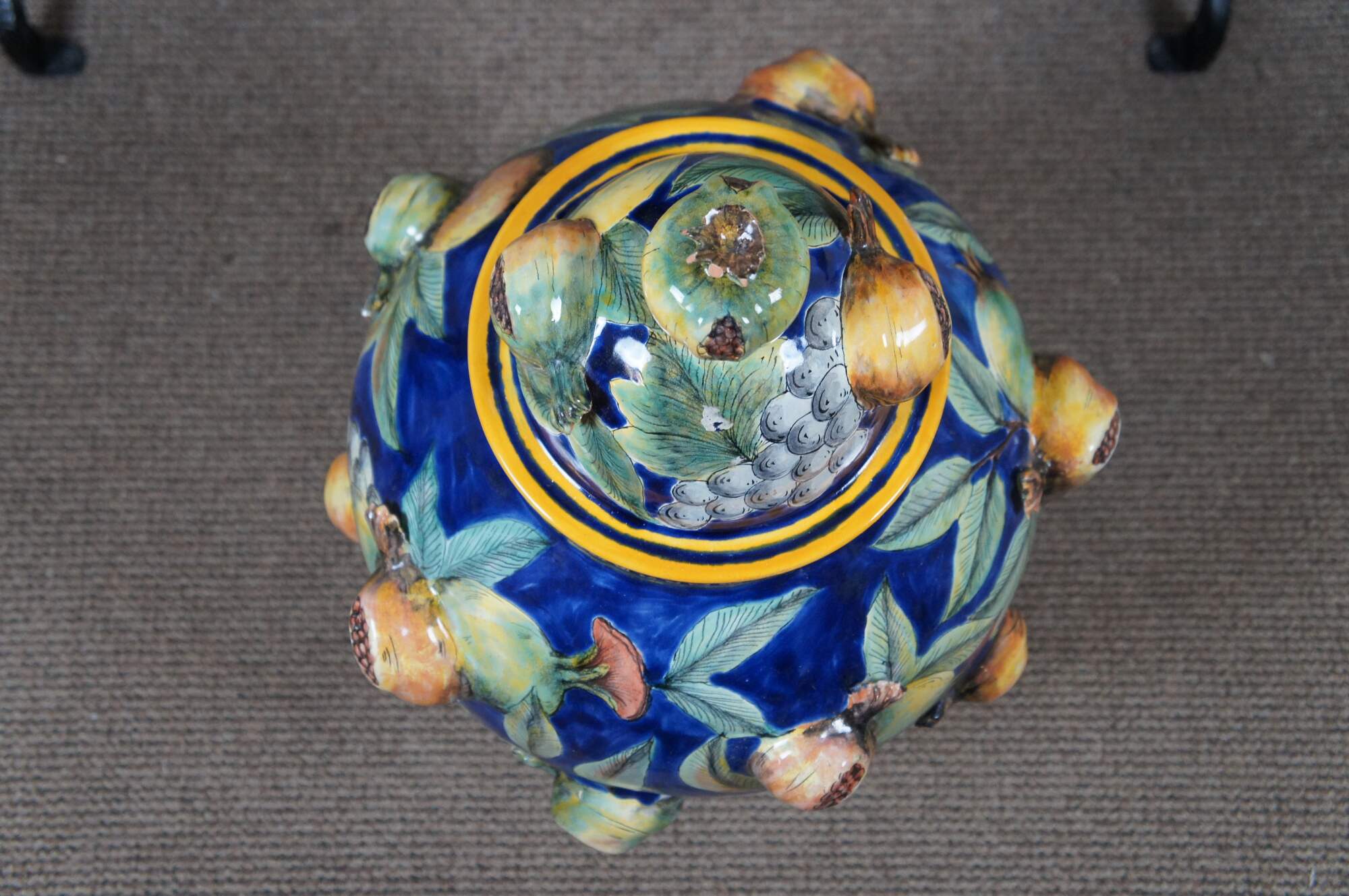 Vintage 20th century Mayolica Santa Rosa lidded pottery urn / floor vase featuring a design of three dimensional hand painted pomegranates over green and brown leaves and grapes on a blue background with yellow trim. Made in Mexico.
