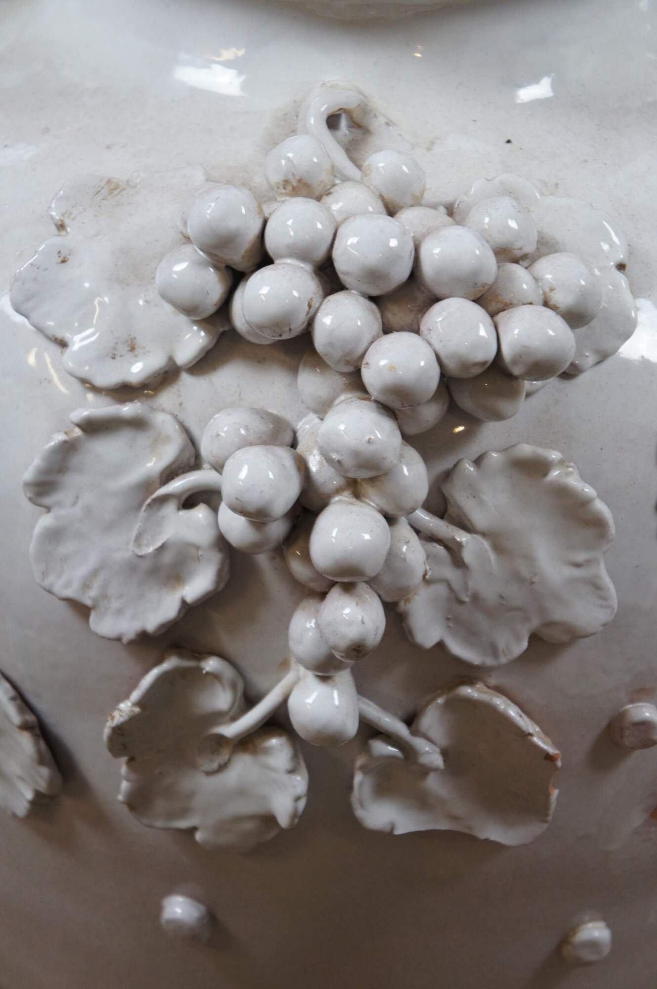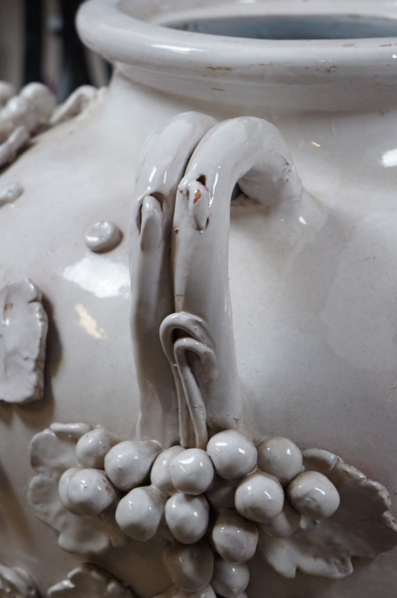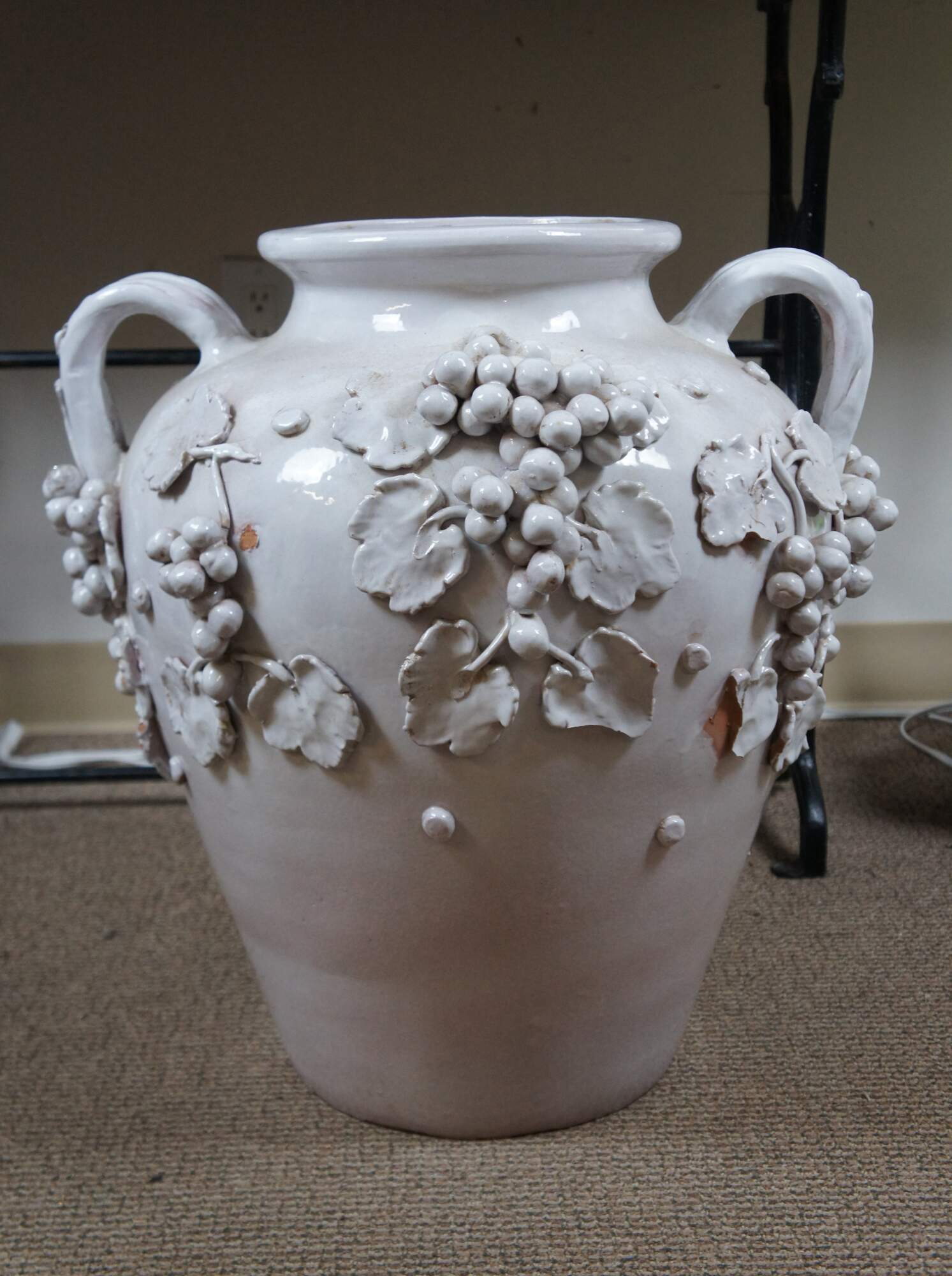 Very large vintage 20th century Italian Dolfi Otello Cottura white glazed terracotta urn / floor vase featuring two handles and applied bunches of high relief grapes and leaves. Pale blue glazed interior. Made in Italy for Cottura by Dolfi Otello.