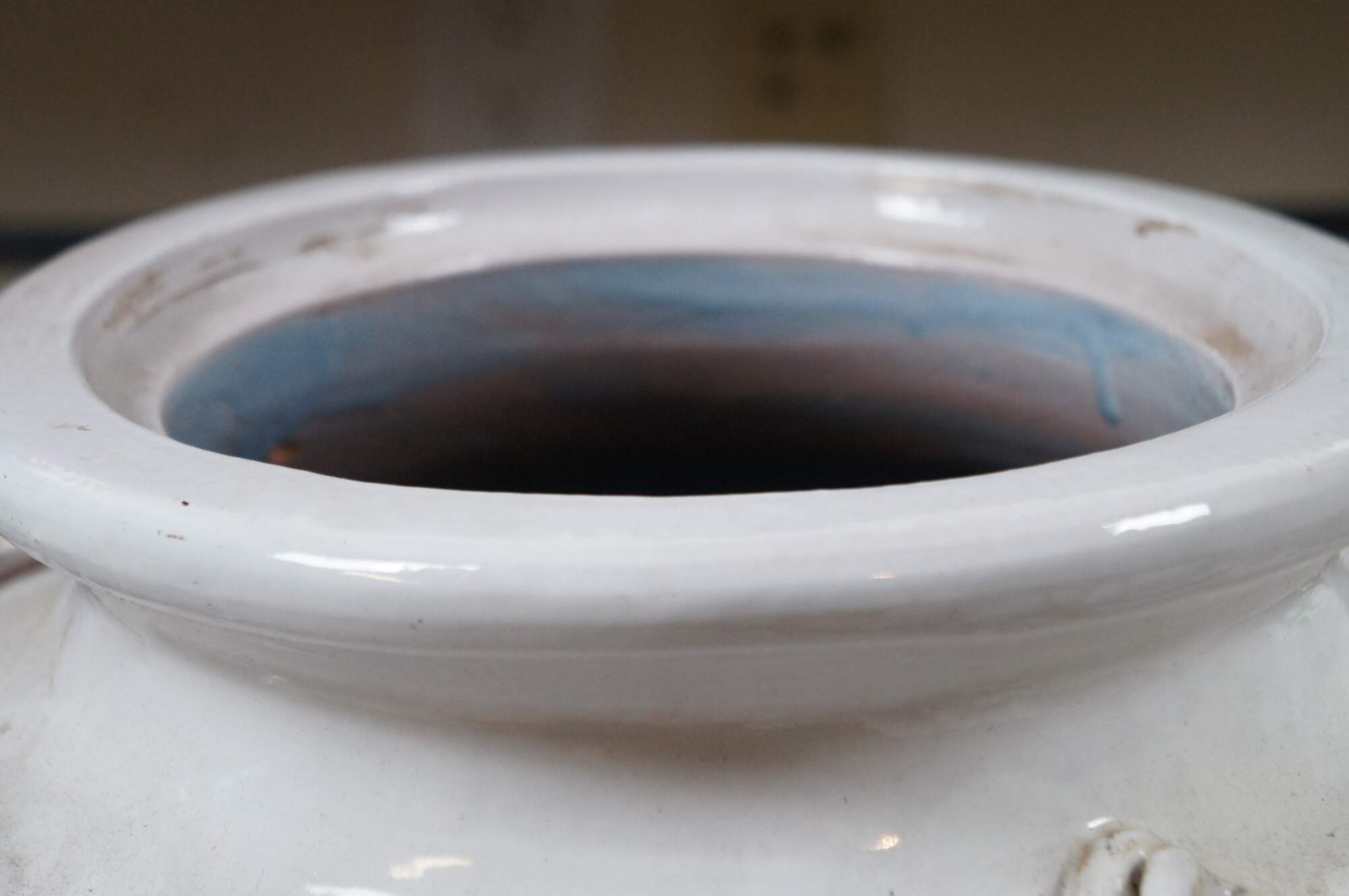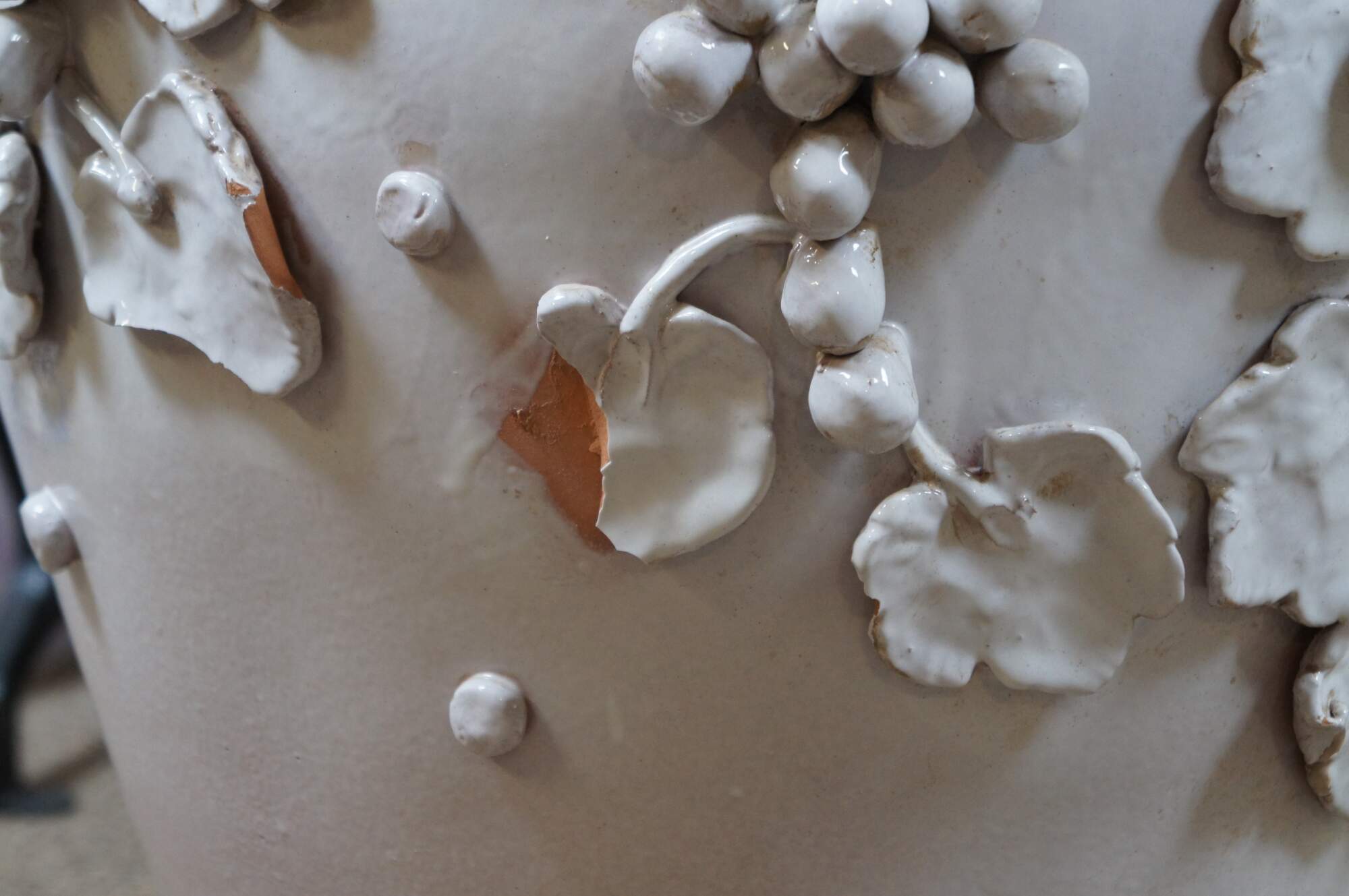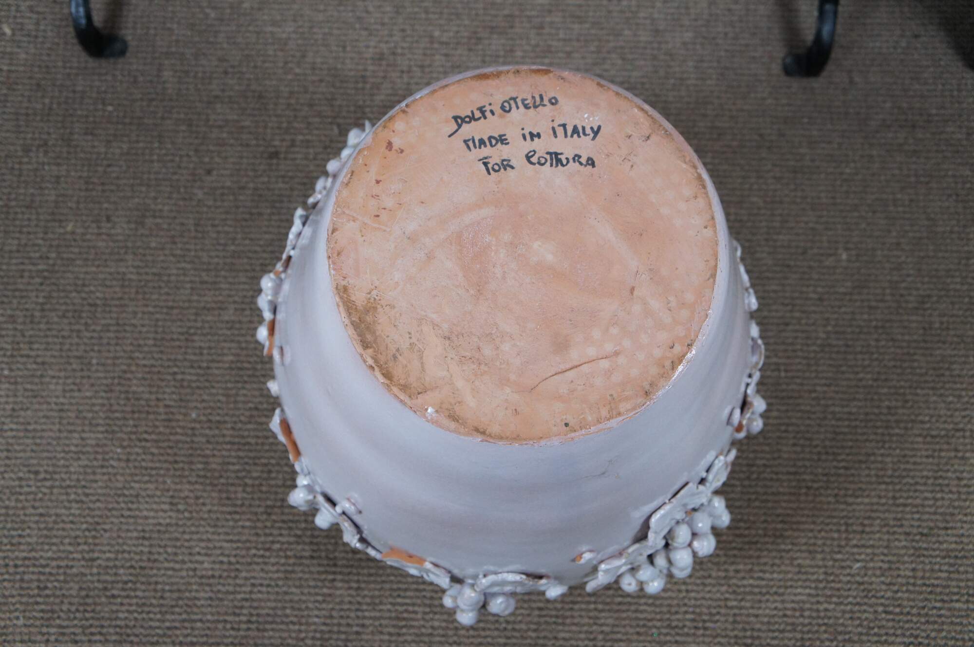 Very large vintage 20th century Italian Dolfi Otello Cottura white glazed terracotta urn / floor vase featuring two handles and applied bunches of high relief grapes and leaves. Pale blue glazed interior. Made in Italy for Cottura by Dolfi Otello.