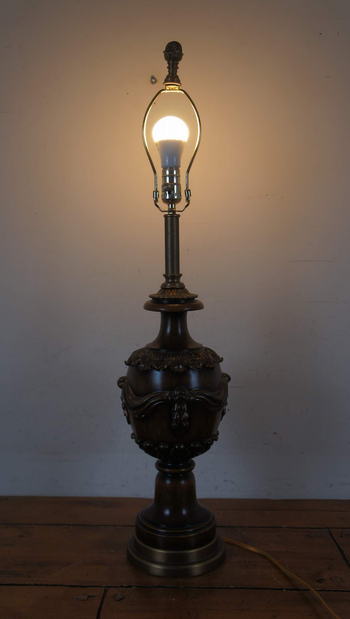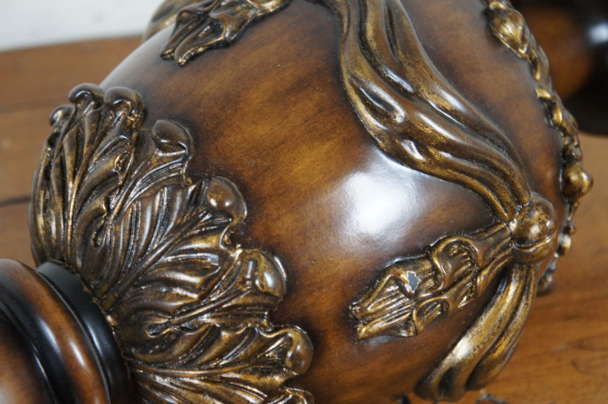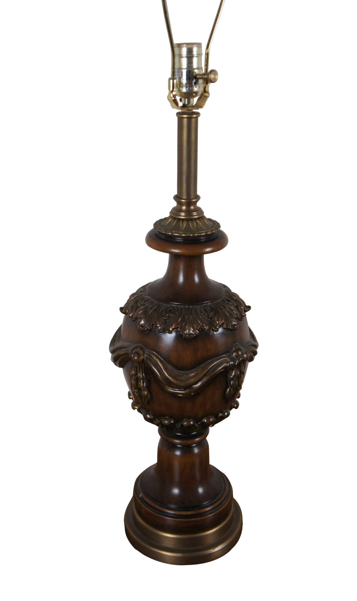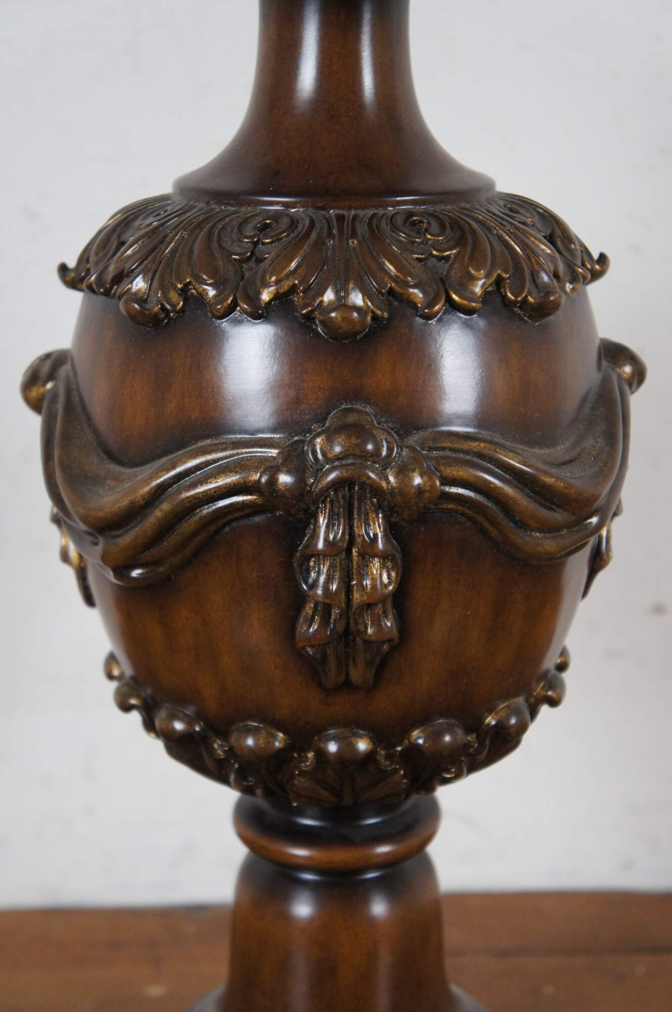 Two late 20th century Theodore Alexander mahogany finished table lamp with brass base. Shaped like a neoclassical urn trimmed with acanthus leaves and sweeping curtain swag. Includes harp and pineapple finial.