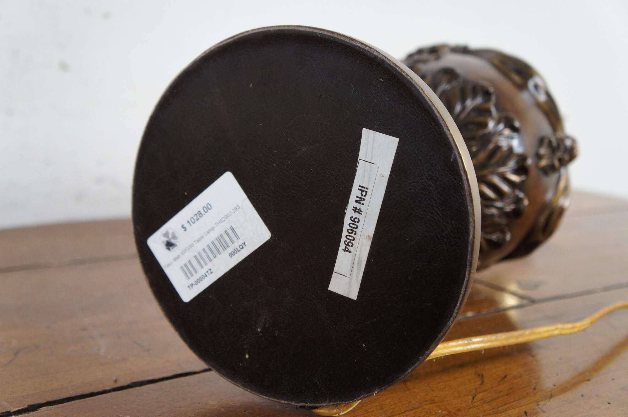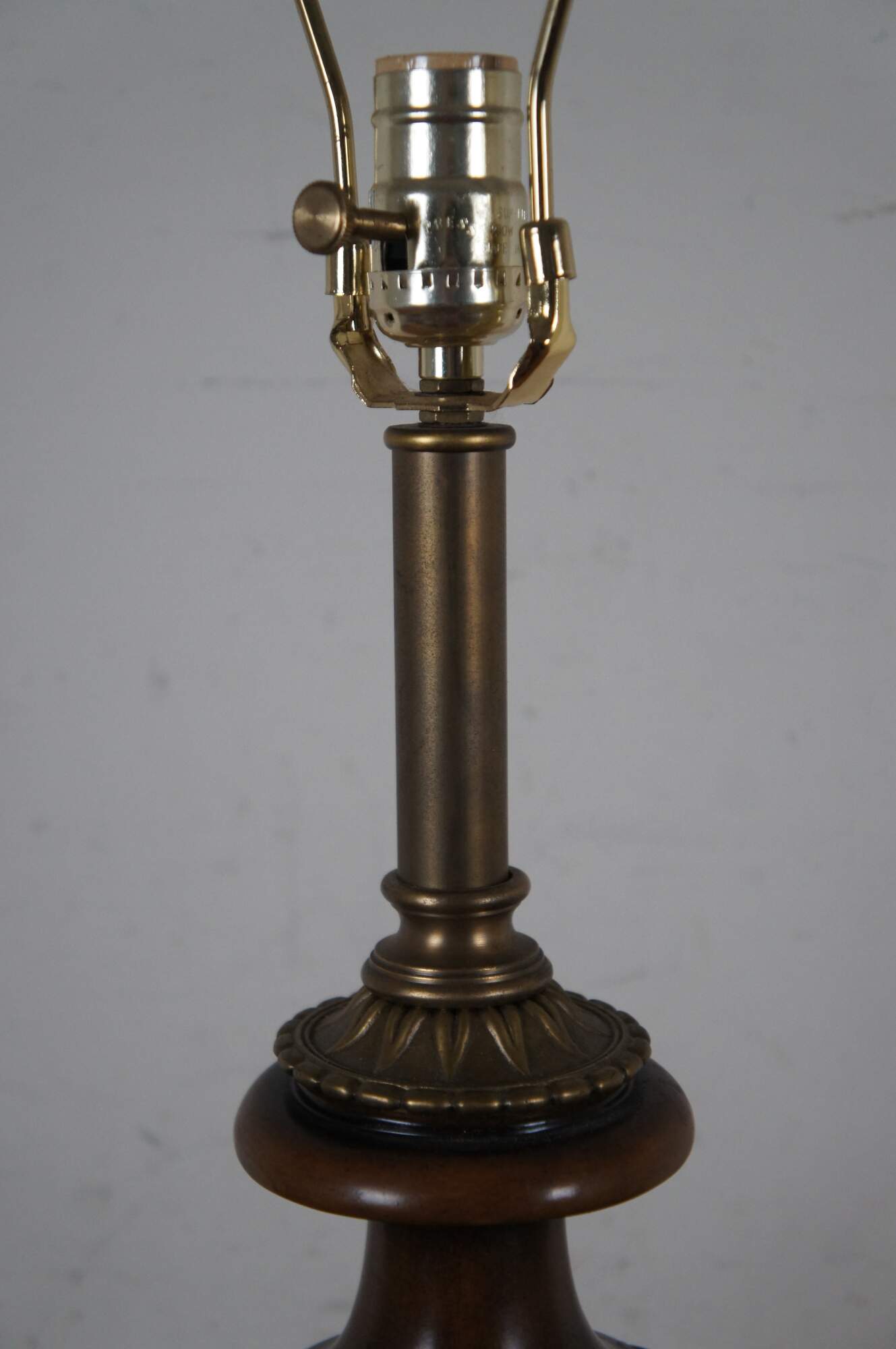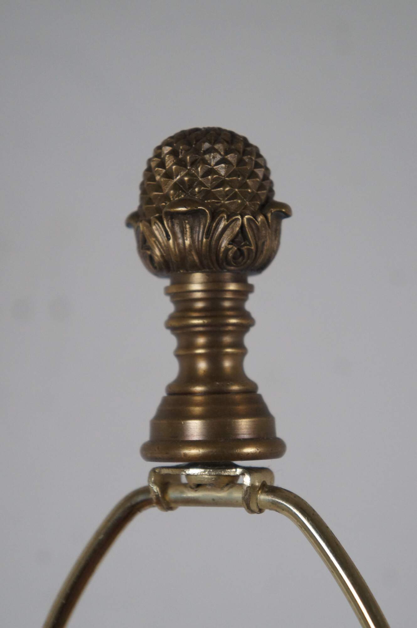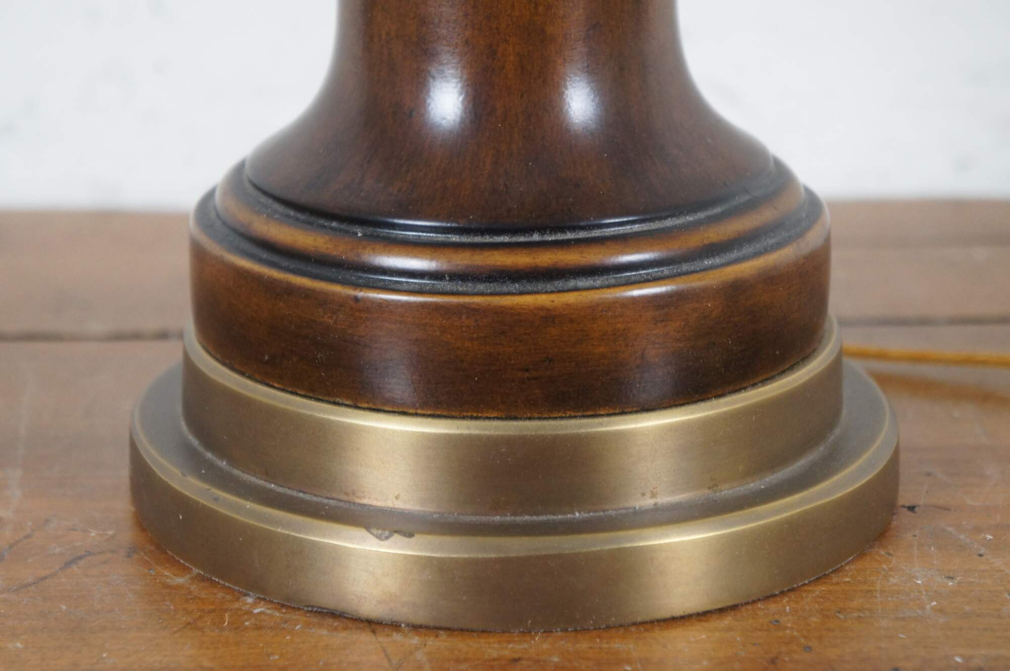Two late 20th century Theodore Alexander mahogany finished table lamp with brass base. Shaped like a neoclassical urn trimmed with acanthus leaves and sweeping curtain swag. Includes harp and pineapple finial.
