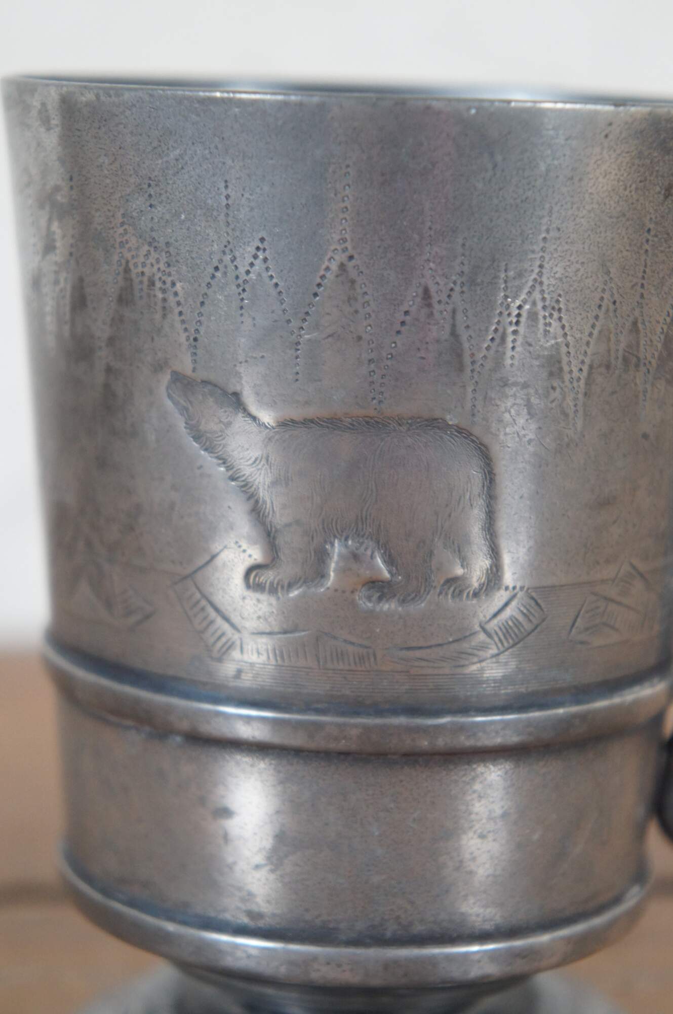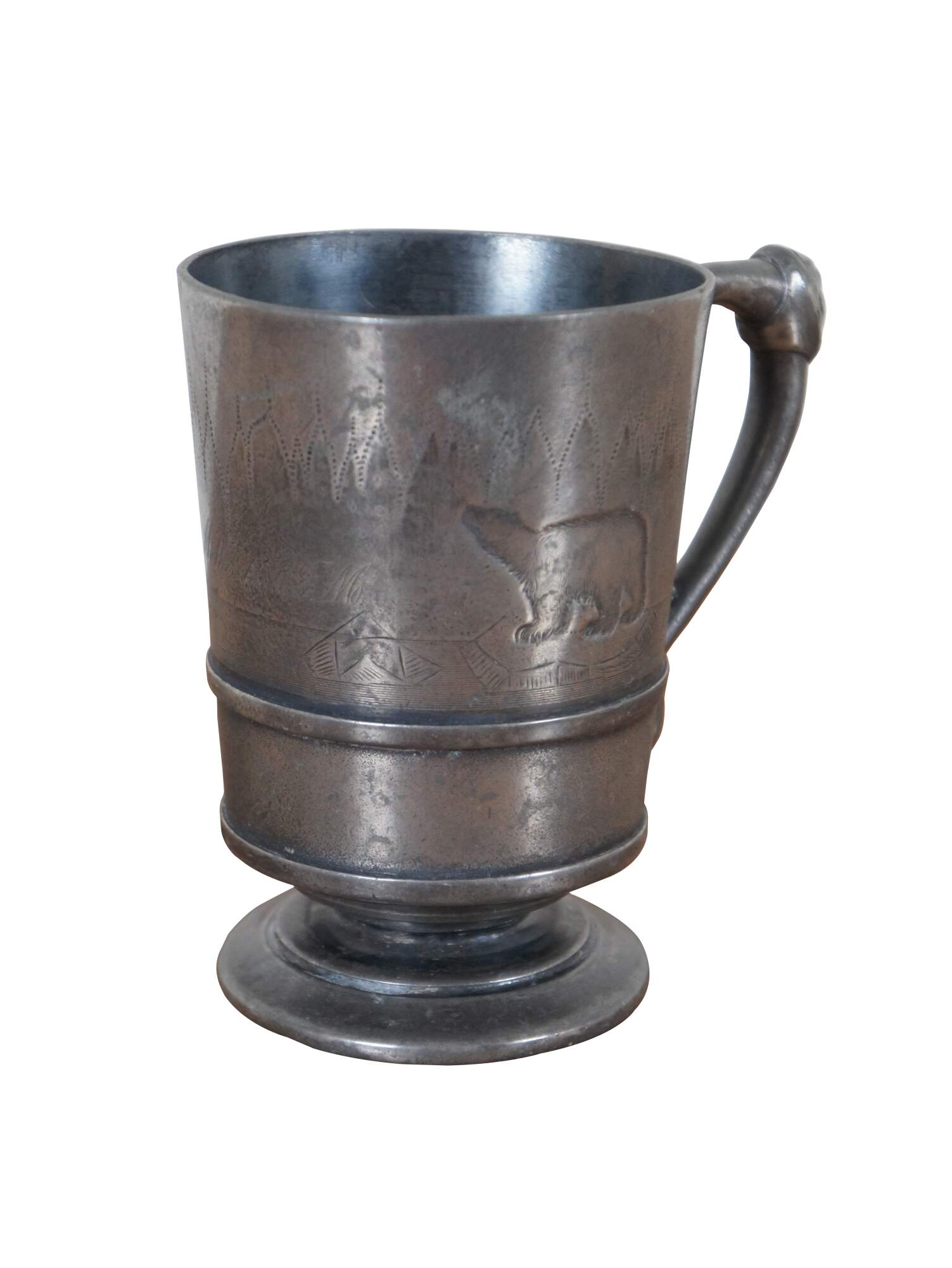 Circa 1860s silverplate cup / mug / goblet by Rogers, smith & Co of New Haven, Connecticut. Features a footed design with rat tail handle accented with a bearded wizard or monk face, body etched with a bear in a pine tree lined landscape.