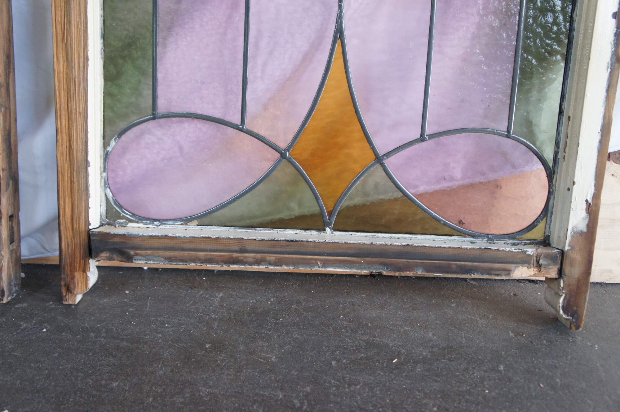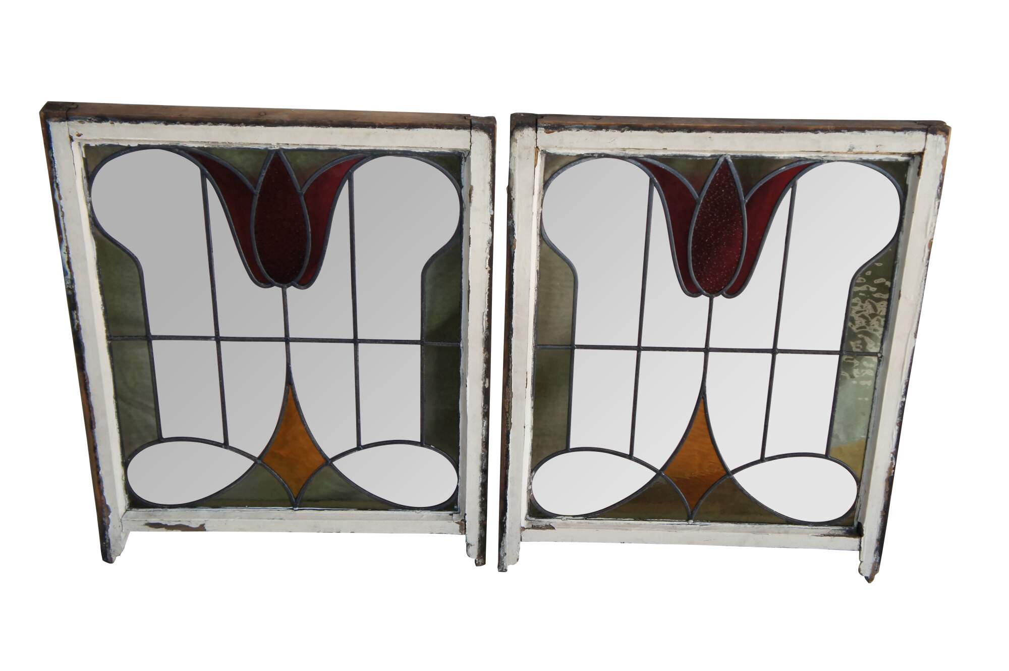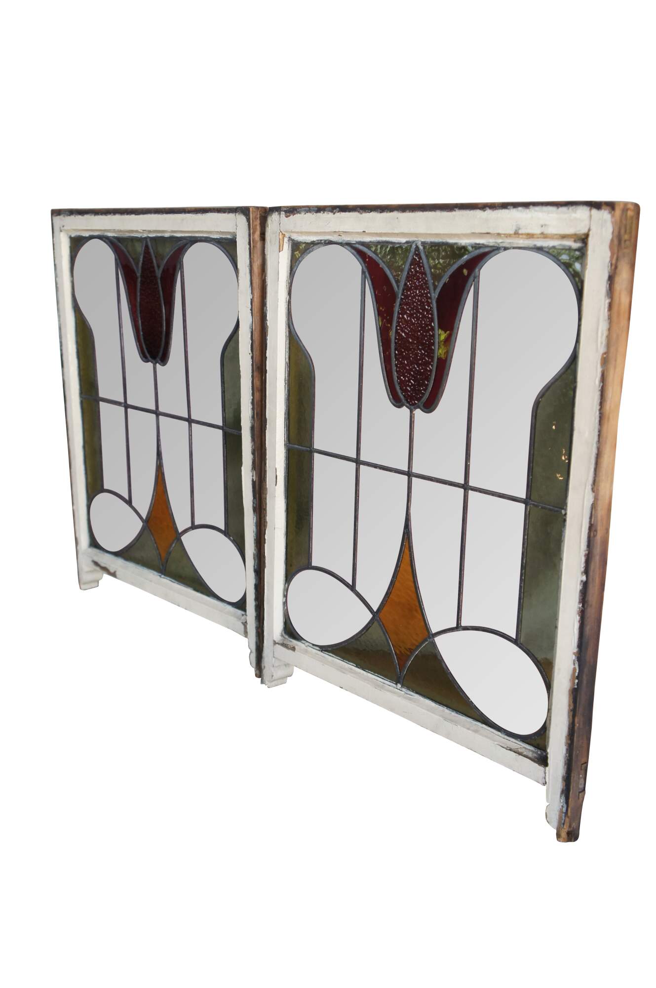 Pair of antique 19th century Victorian / Art Nouveau framed stained glass windows. Features colors of green, rose, red and amber in a white frame. Originally used as sliding windows.