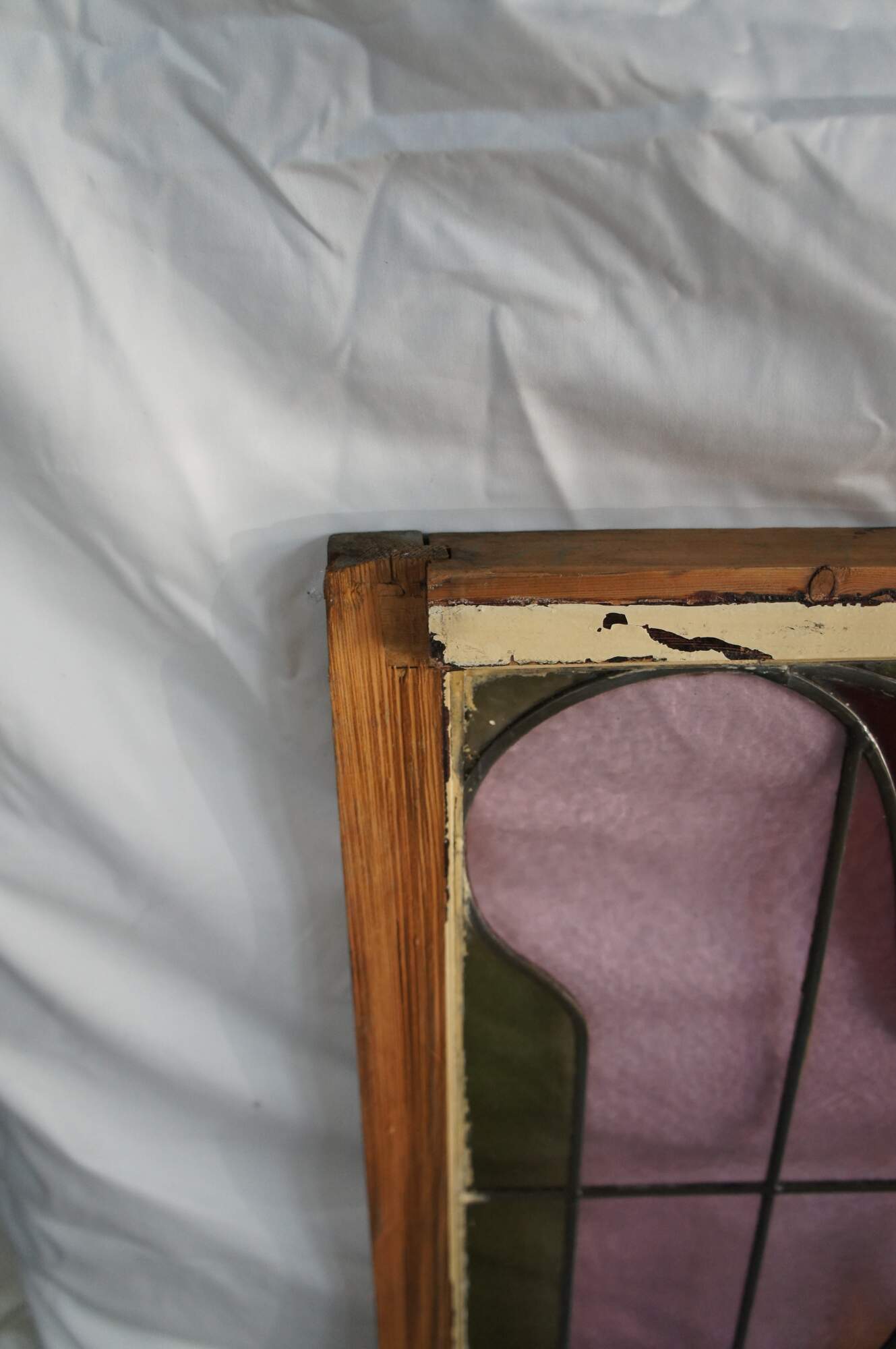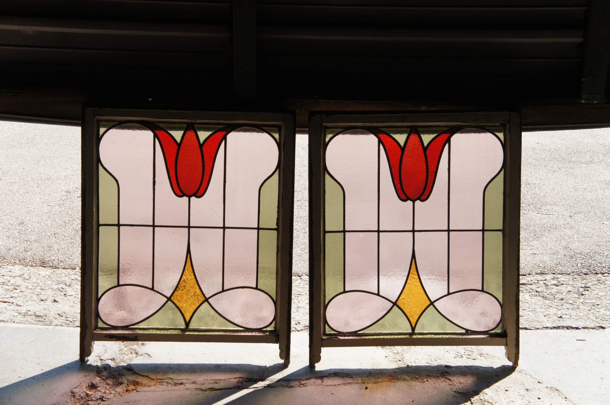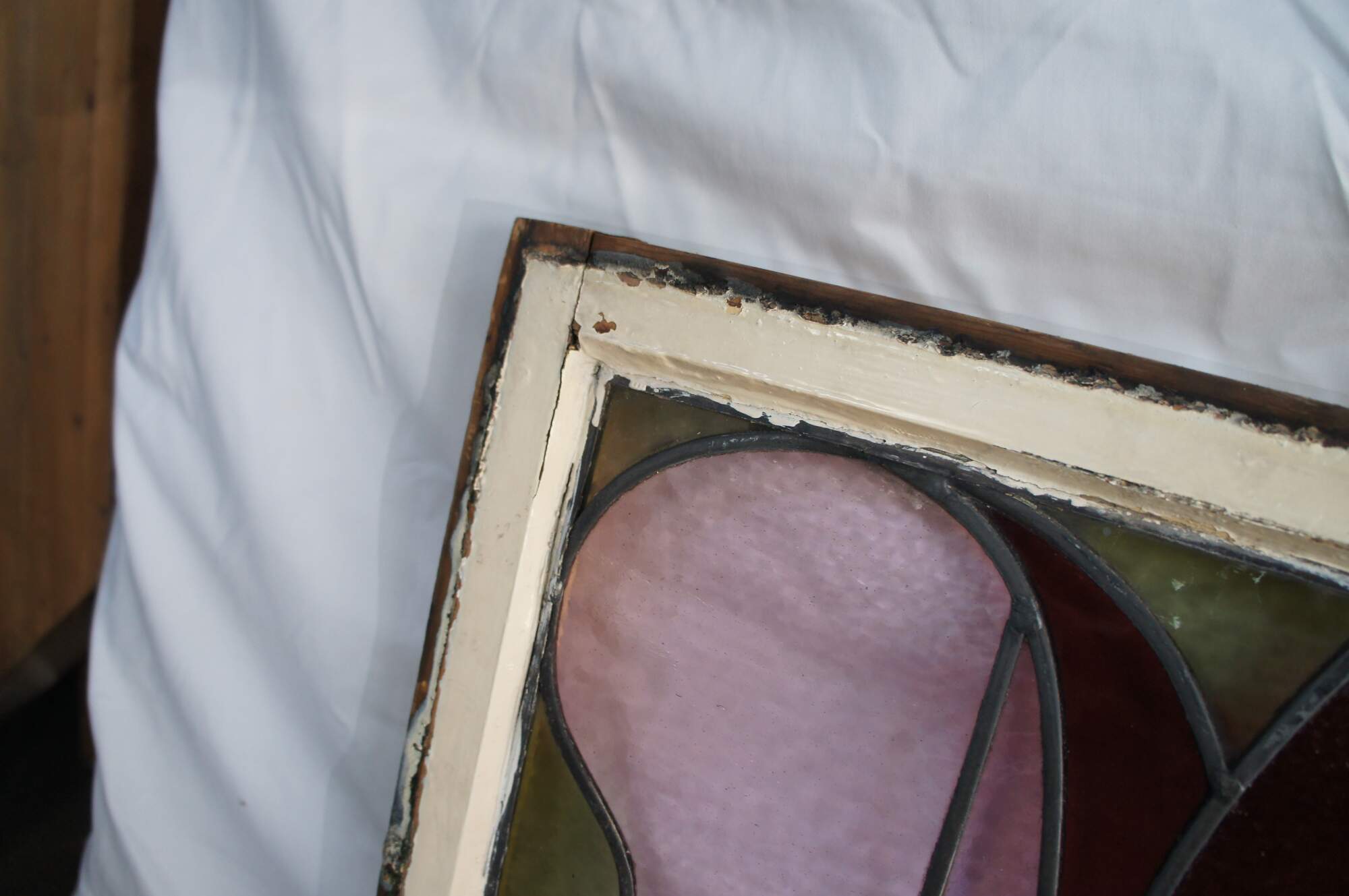 Pair of antique 19th century Victorian / Art Nouveau framed stained glass windows. Features colors of green, rose, red and amber in a white frame. Originally used as sliding windows.