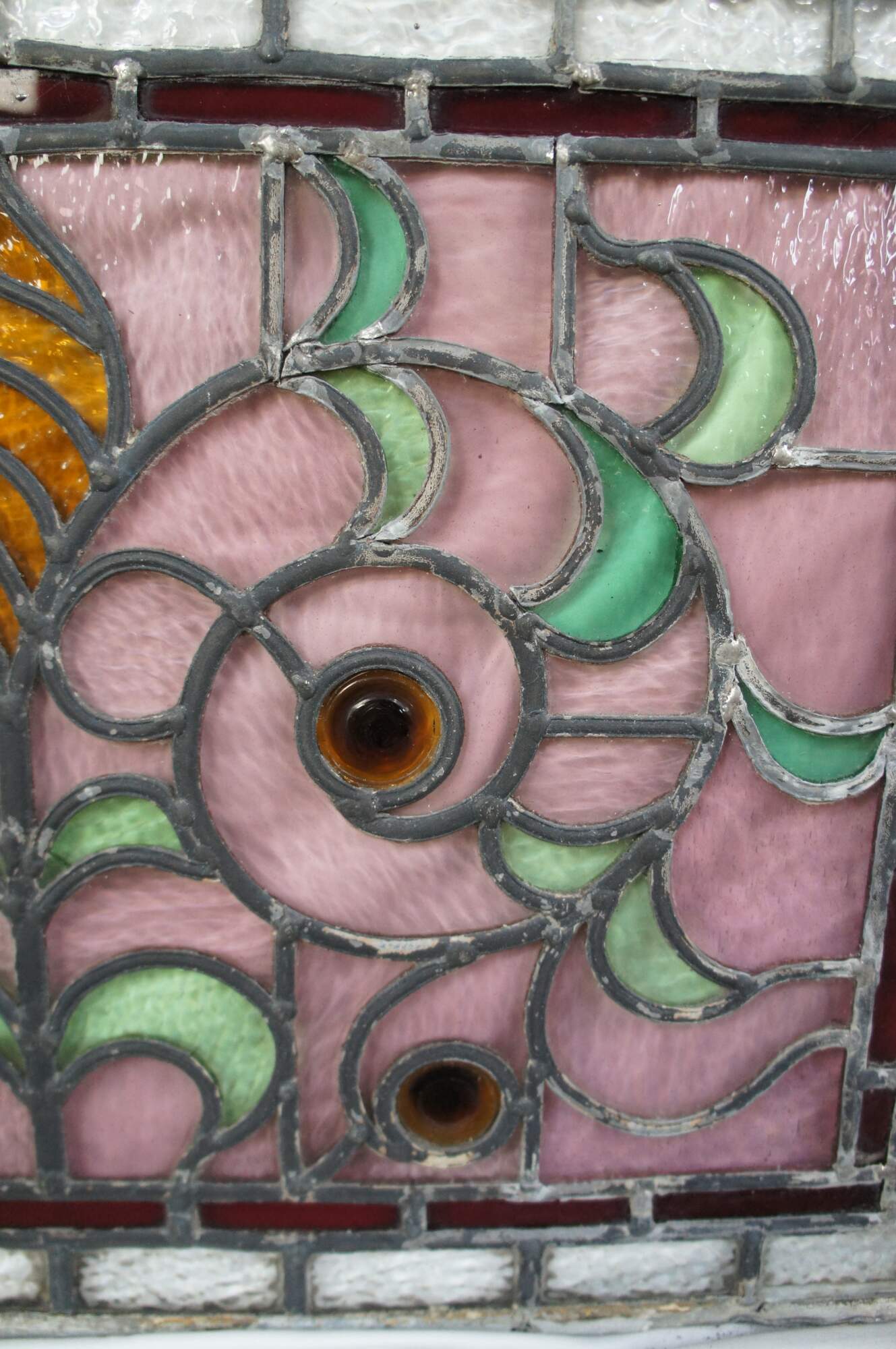An exquisite pair of antique 19th century Aesthetic Period stained glass windows. Features a beautifully gridded and scrolled frame with an amethyst foreground framed in red with clear pebbled glass, green leaves and amber accents. The perfect pair to reframe or hang in the light as is.