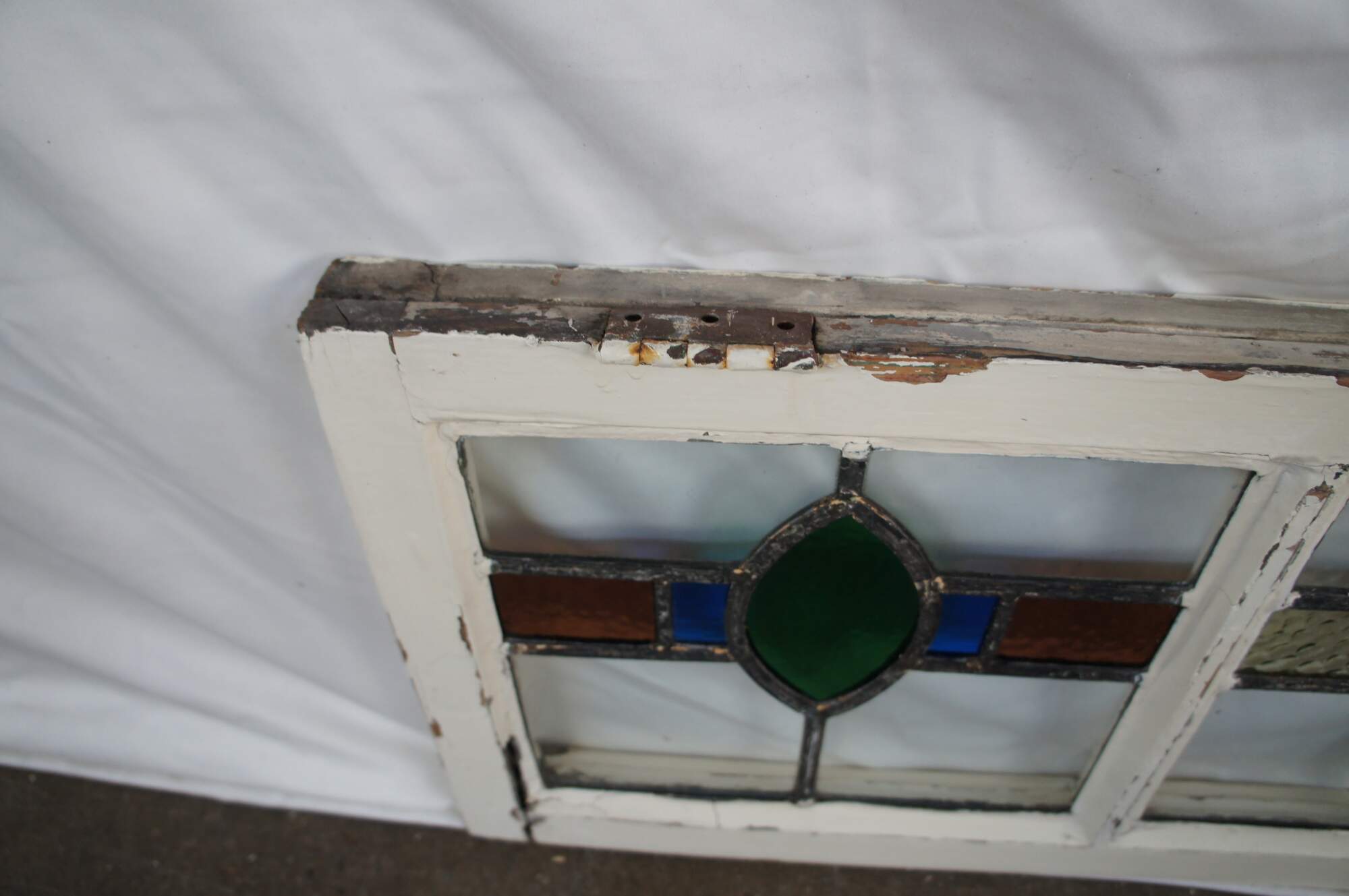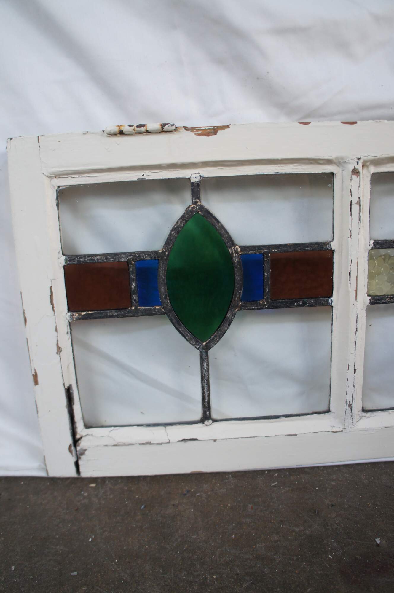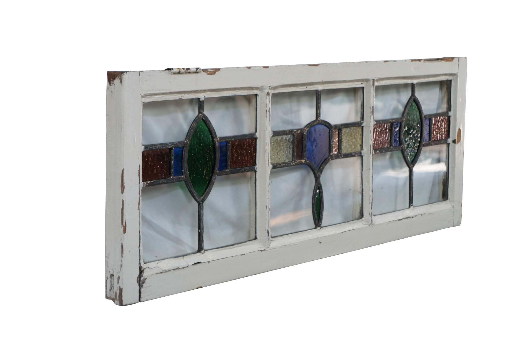 A beautiful Victorian era reclaimed leaded stained glass window panel. Features a trio of windows set in a white wooden frame. Features shades of green, yellow red and blue.