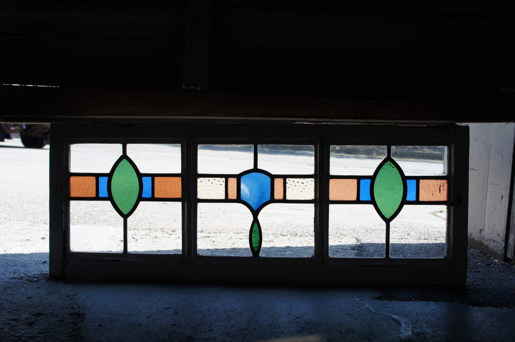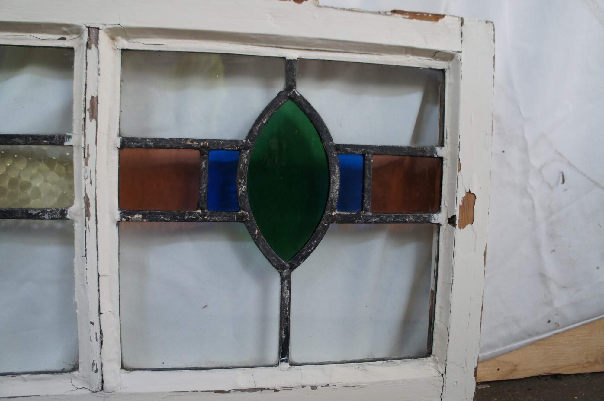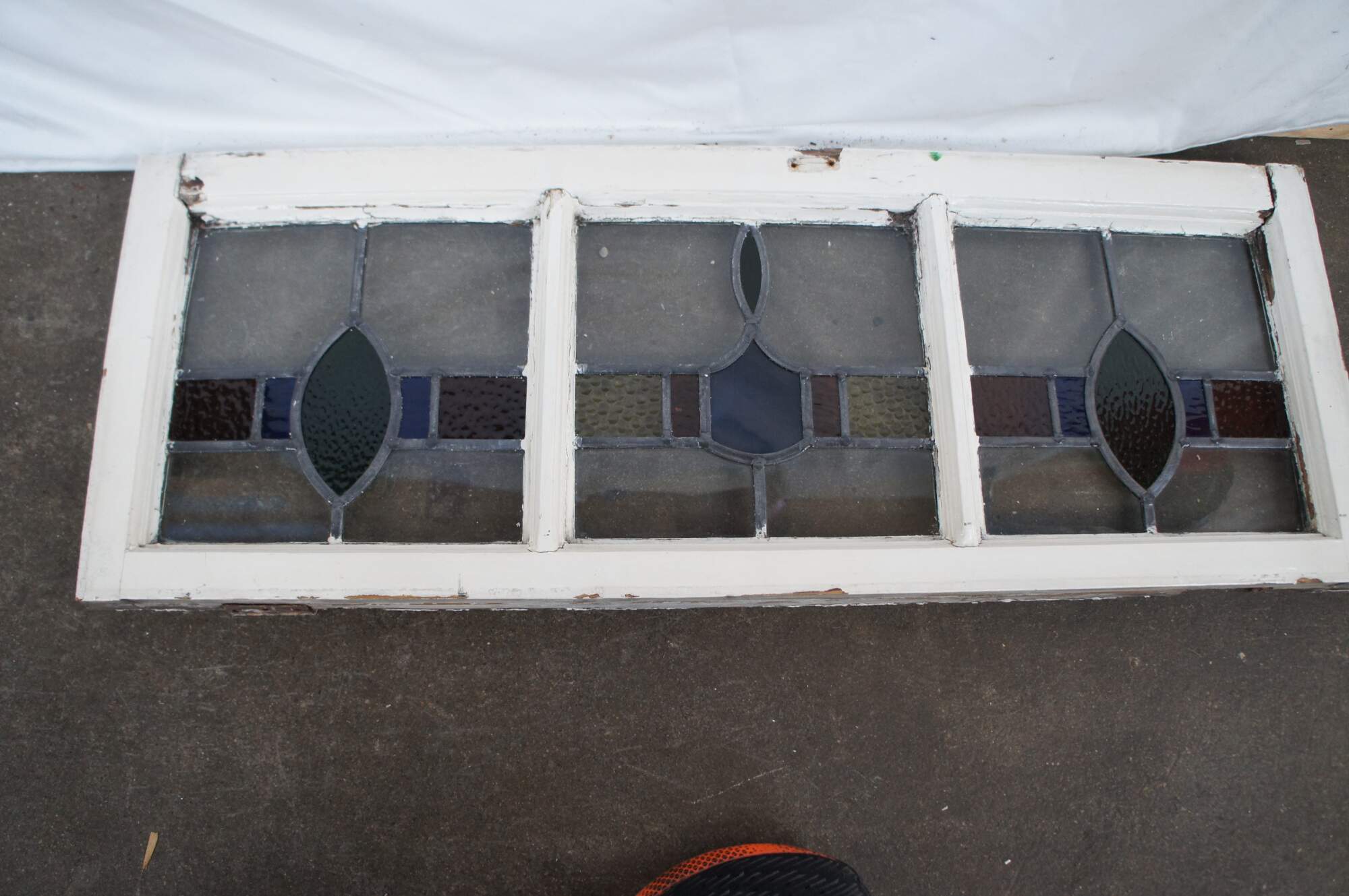 A beautiful Victorian era reclaimed leaded stained glass window panel. Features a trio of windows set in a white wooden frame. Features shades of green, yellow red and blue.