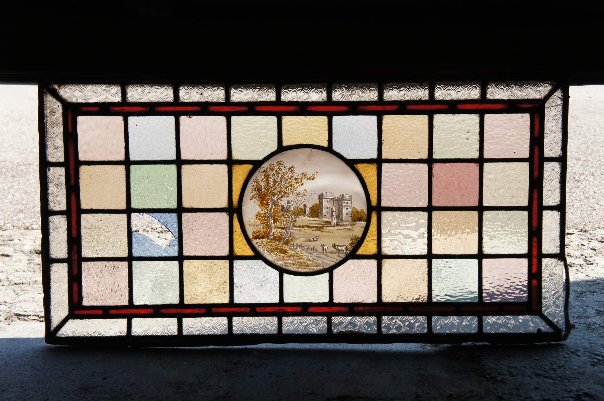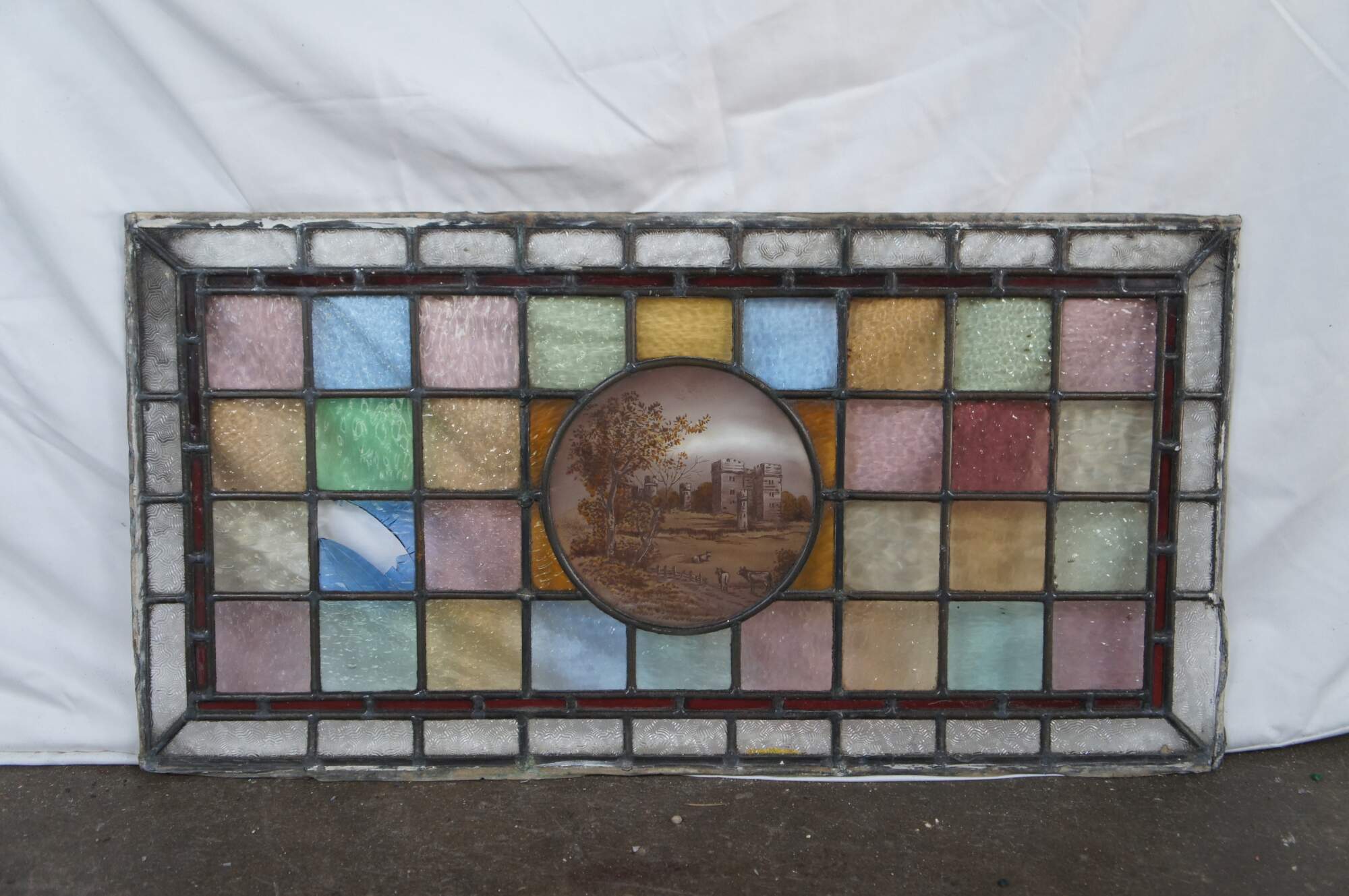 Intriguing antique English leaded stained glass transom window panel. Features a colorful gridded design with a central hand painted castle landscape with pastoral cows.