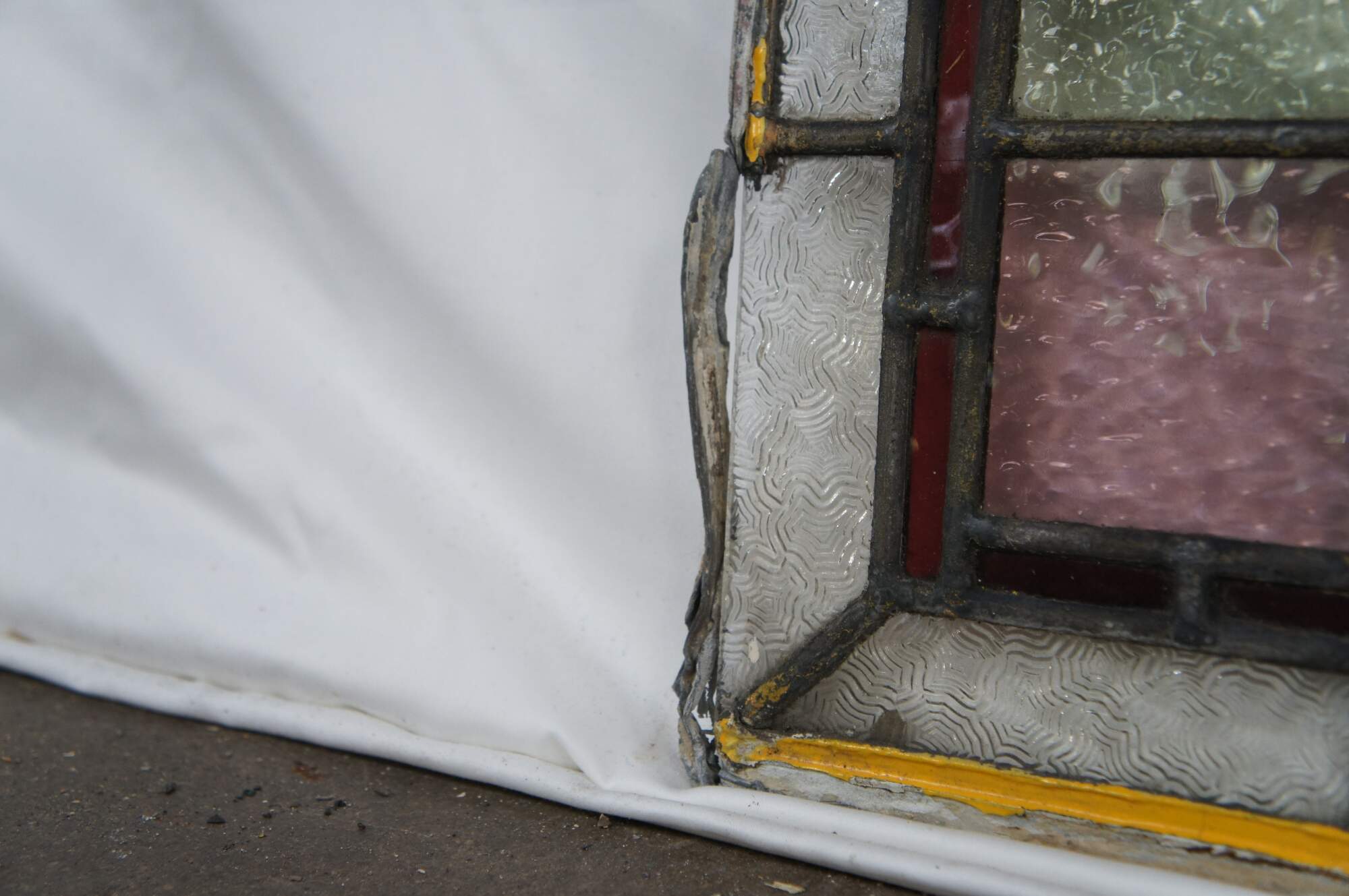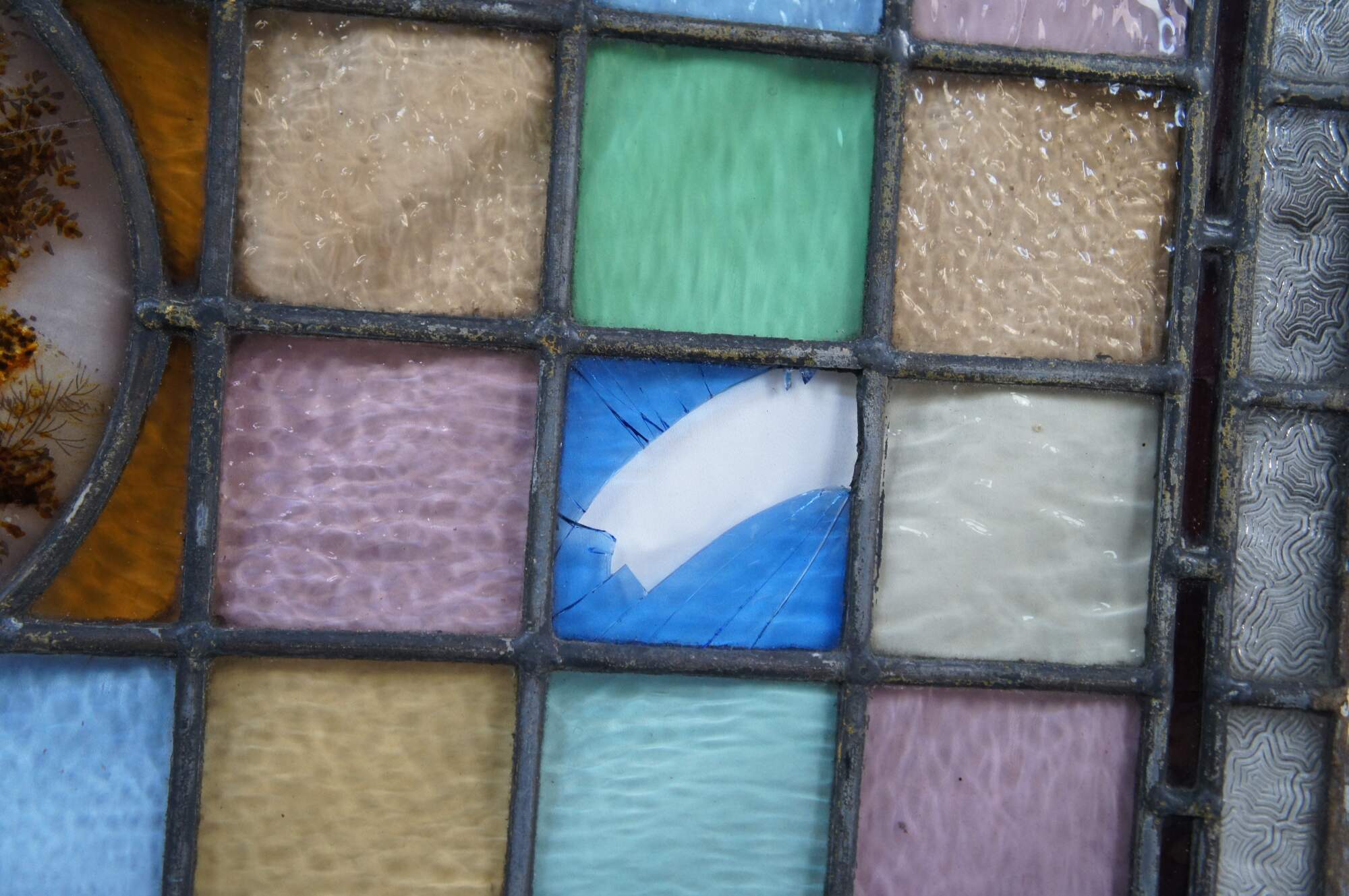 Good Condition; age and use related wear. missing piece of glass along one of the blue panels. Some edge wear and bending to the leaded frame