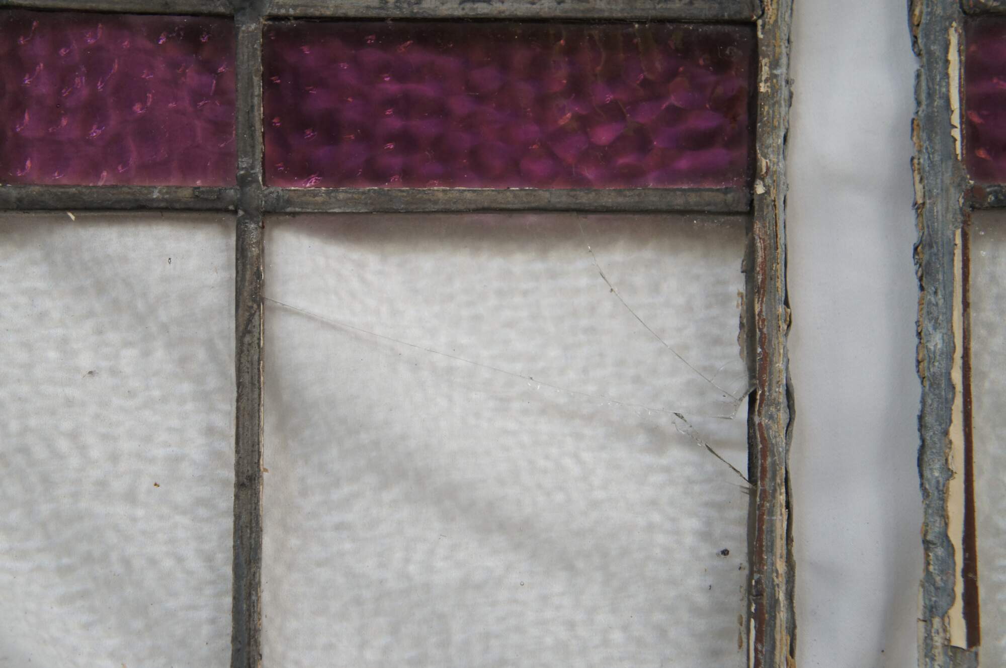 Pair of Antique Victorian Leaded Stained Glass windows. Features a gridded pattern with an amethyst stripe and X pattern center in red. The glass is all in a pebbled motif.