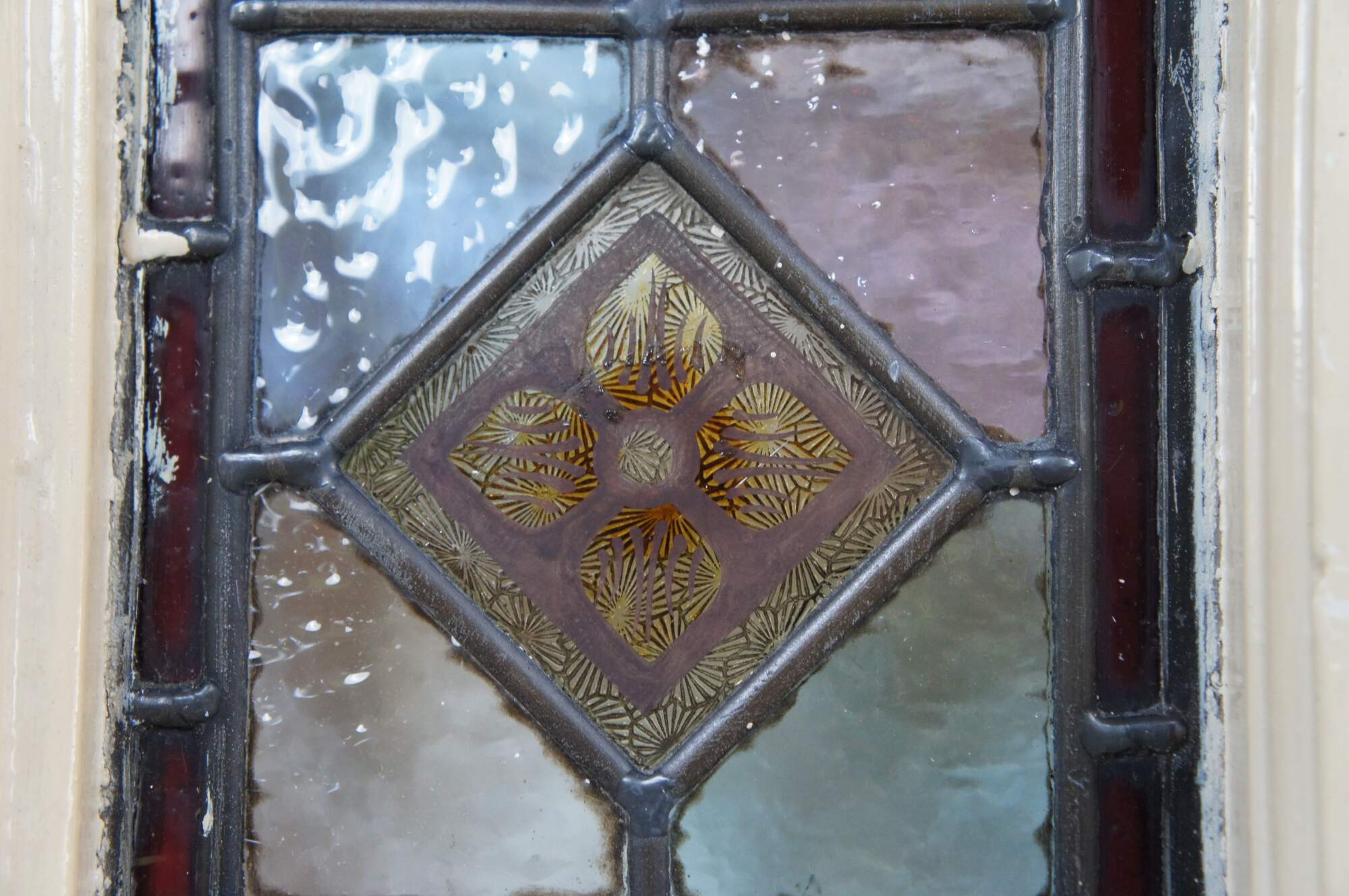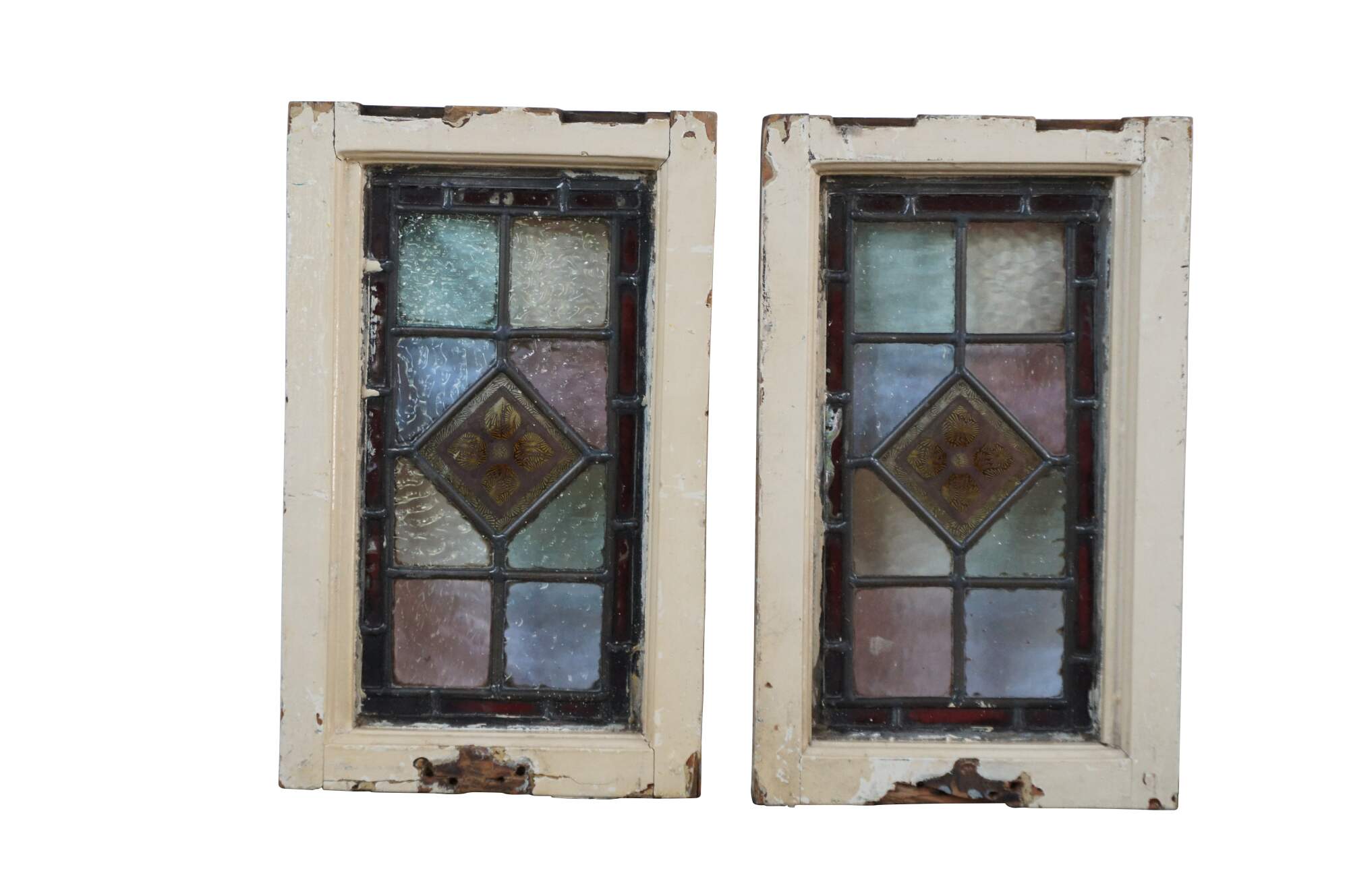 Unque pair of American Victorian leaded stained glass windows. Featuring a diamond textured motif at the center around pebbled clear glass with ruby glass border set within a wooden frame