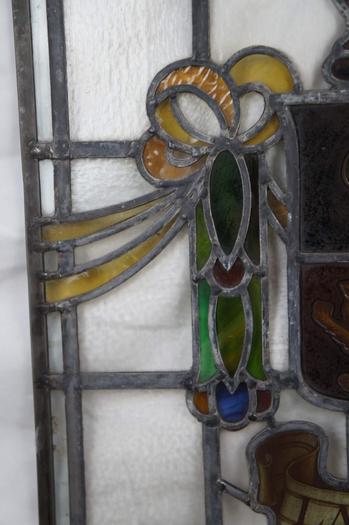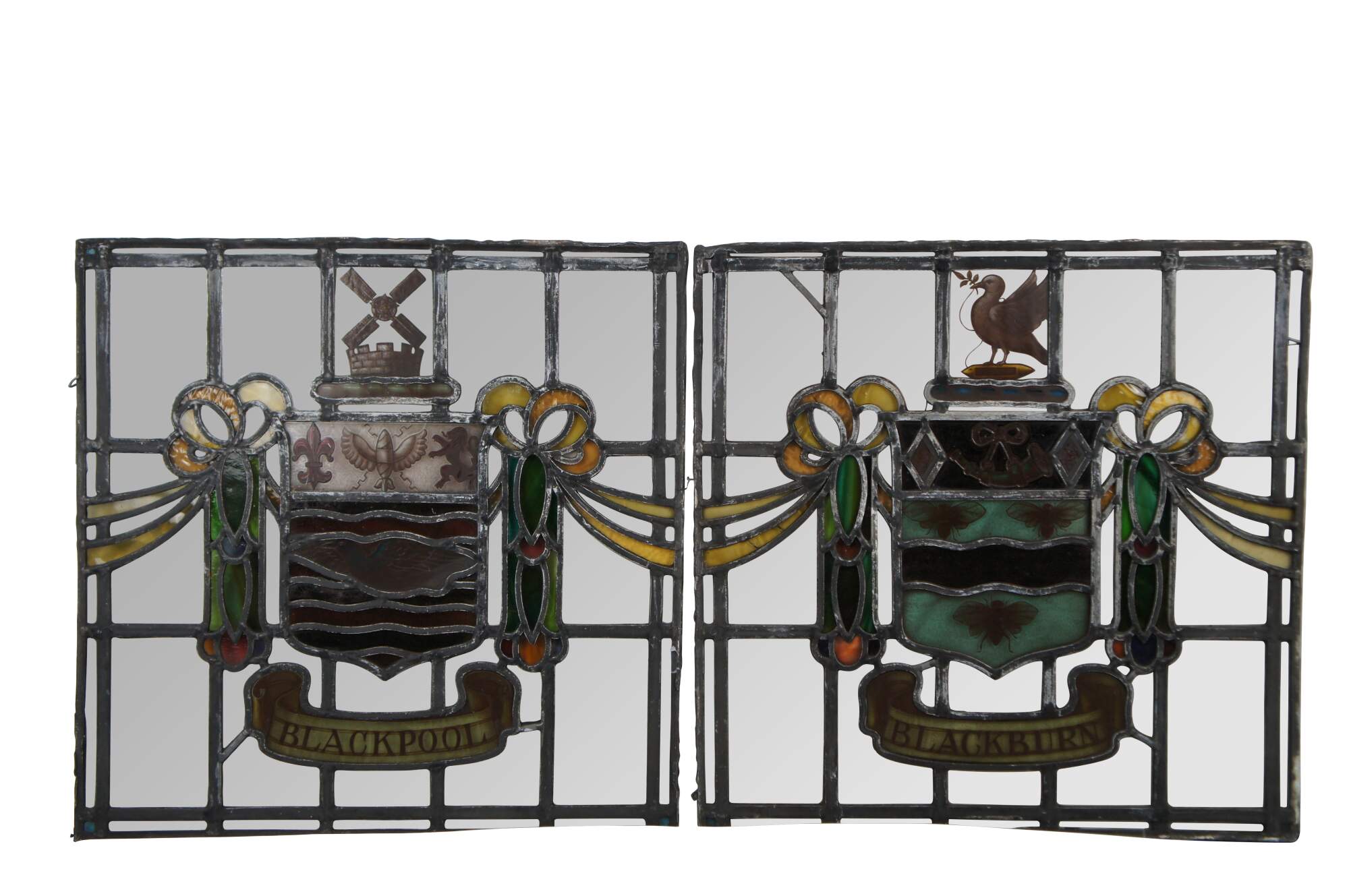 A fascinating set of 4 Victorian late 19th century English leaded stained glass windows. These beautiful specimens showcase the wonderful Heraldy of the United Kingdom with the shields and coat of arms for Blackburn, Blackpool, Liverpool and Lancaster. Each shield is set in the middle of a lattice pebbled glass window and flanked by ribbons and colorful foliate detail. The windows are all labeled at the bottom and sequence perfectly allowing for them to be paired together in any installation.