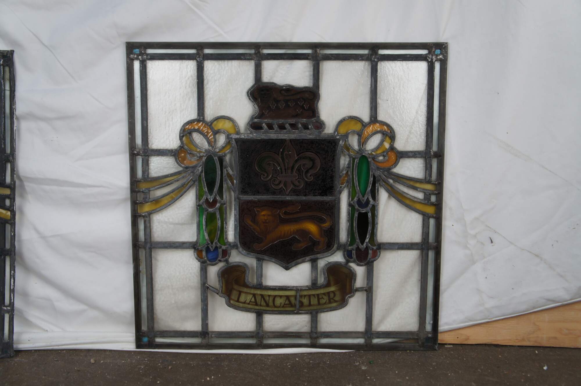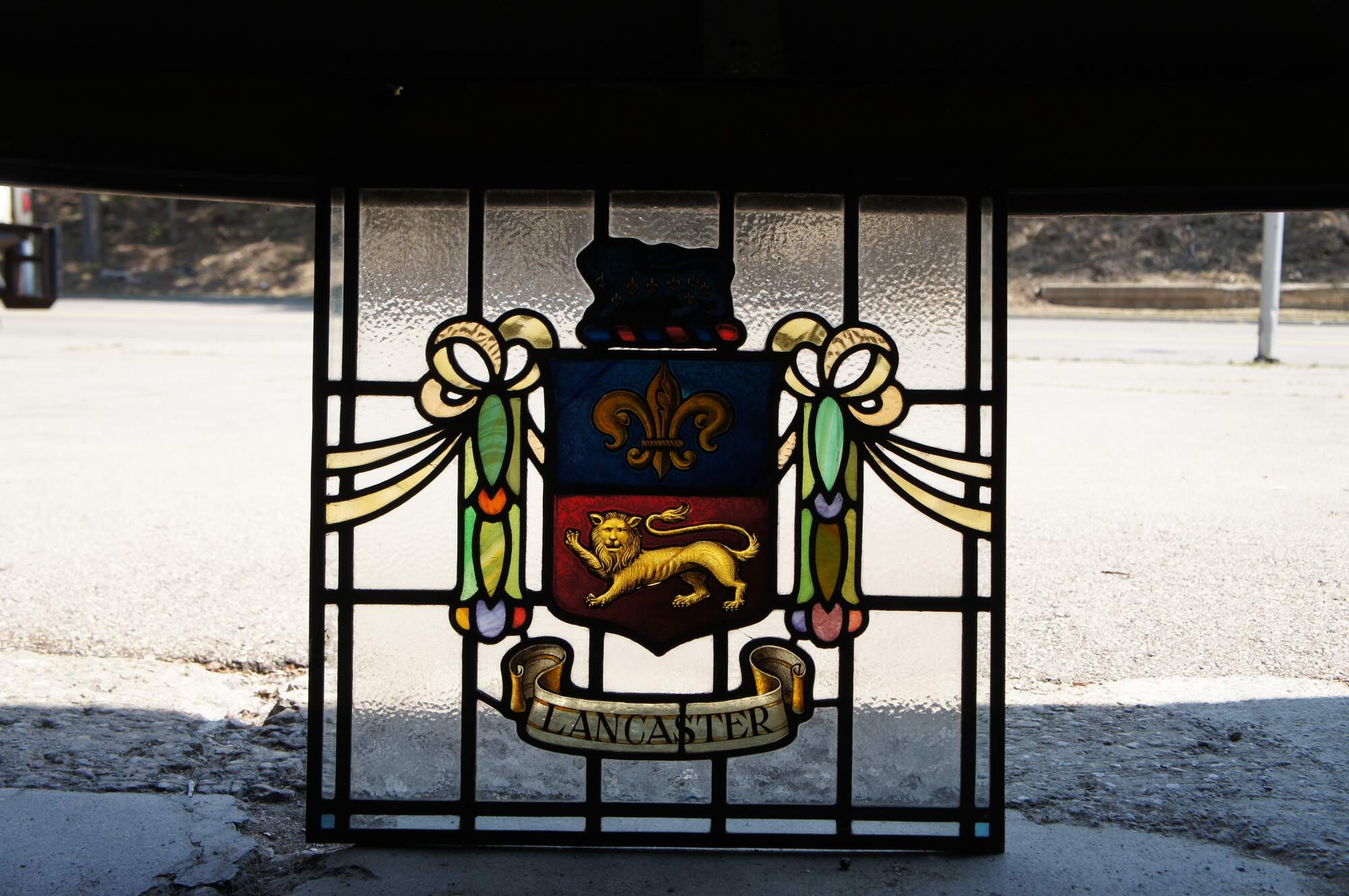 The fleurs-de-lis and lion were part of the old arms of the city, and are themselves derived from the arms of the Duchy of Lancaster. Each lion stands on a garb for the two Rural District Councils.