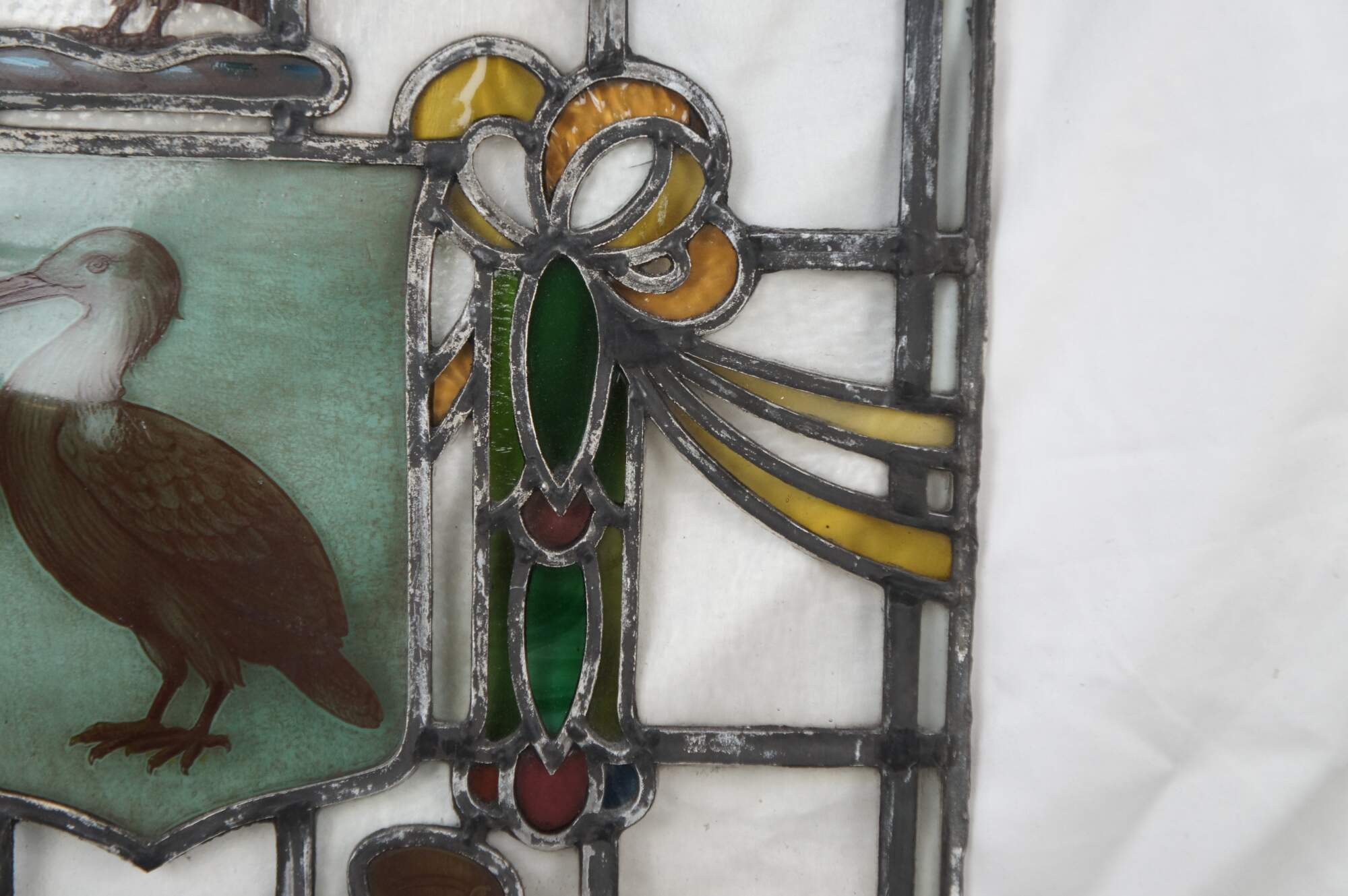 The crest has a dove and olive branch, a popular charge in Victorian civic arms. He stands on a weaver's shuttle. The crest represents the beneficial results emanating from the art of weaving.