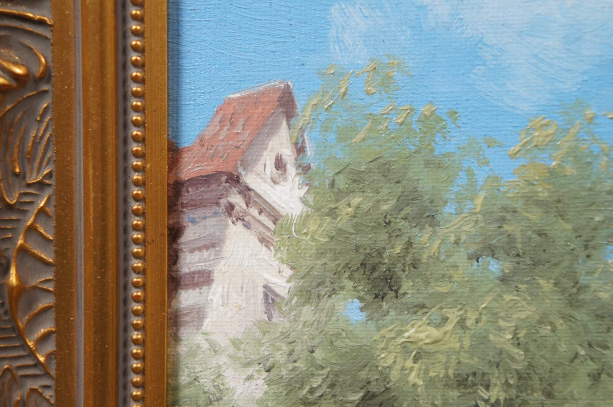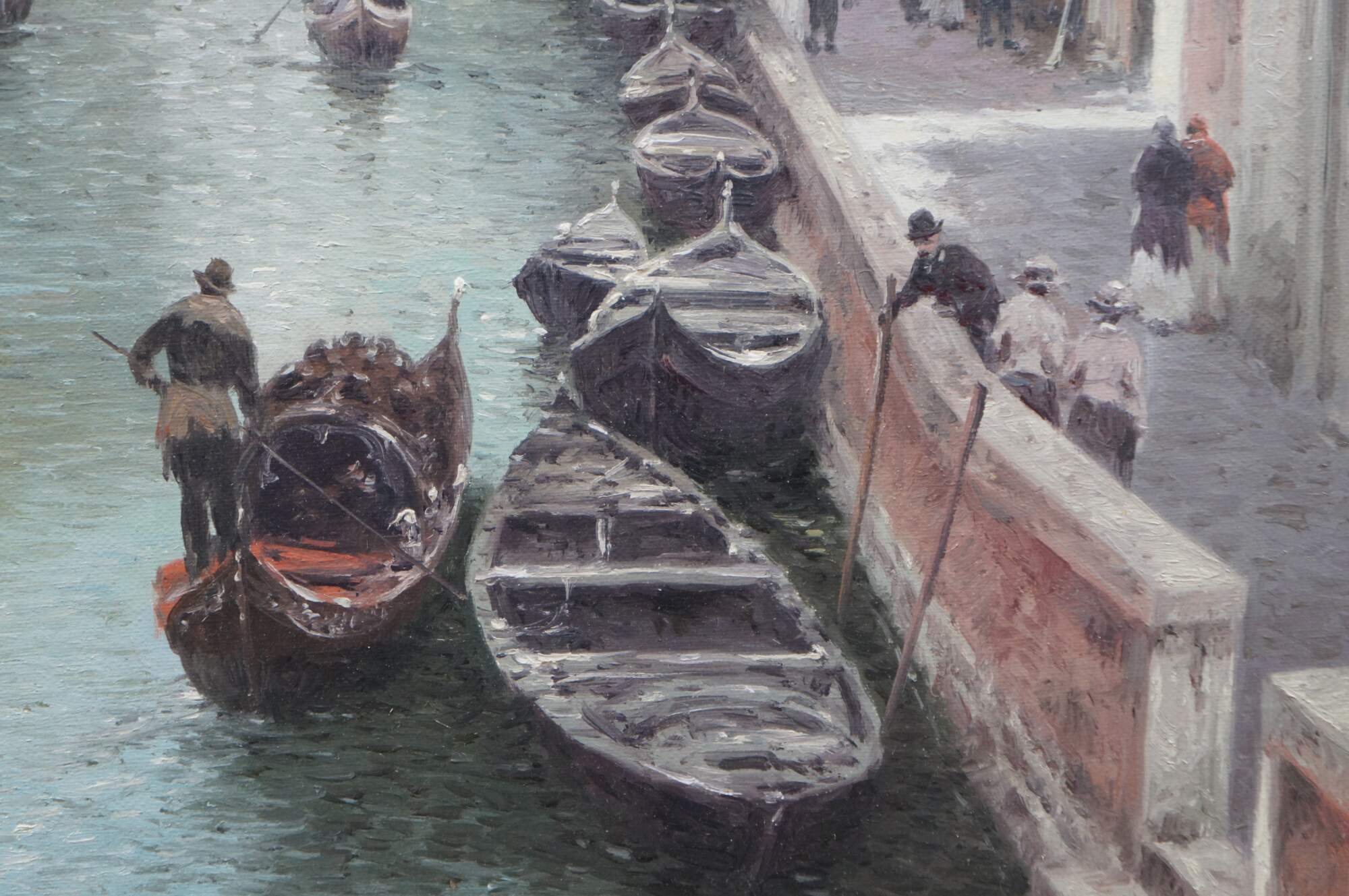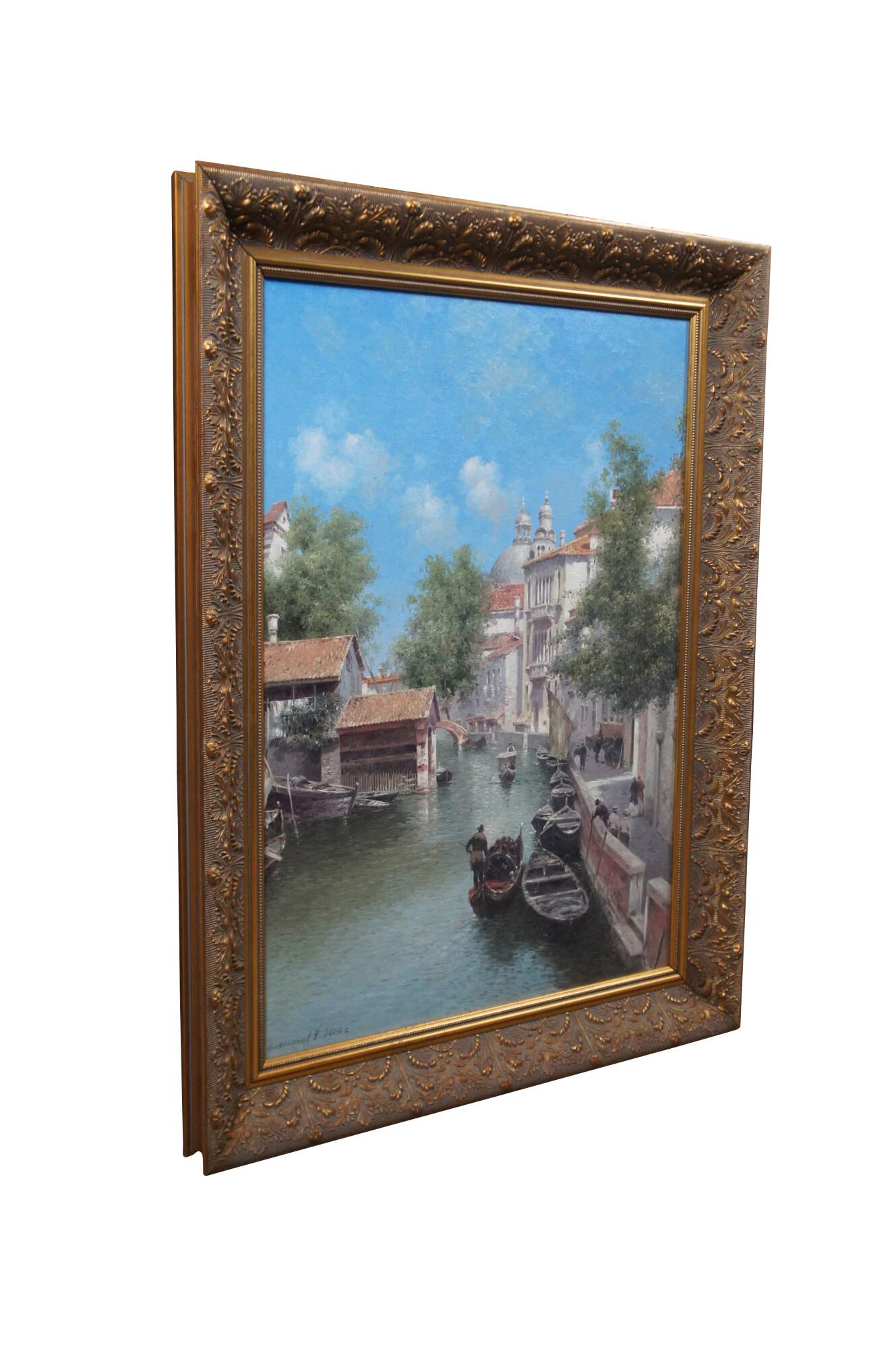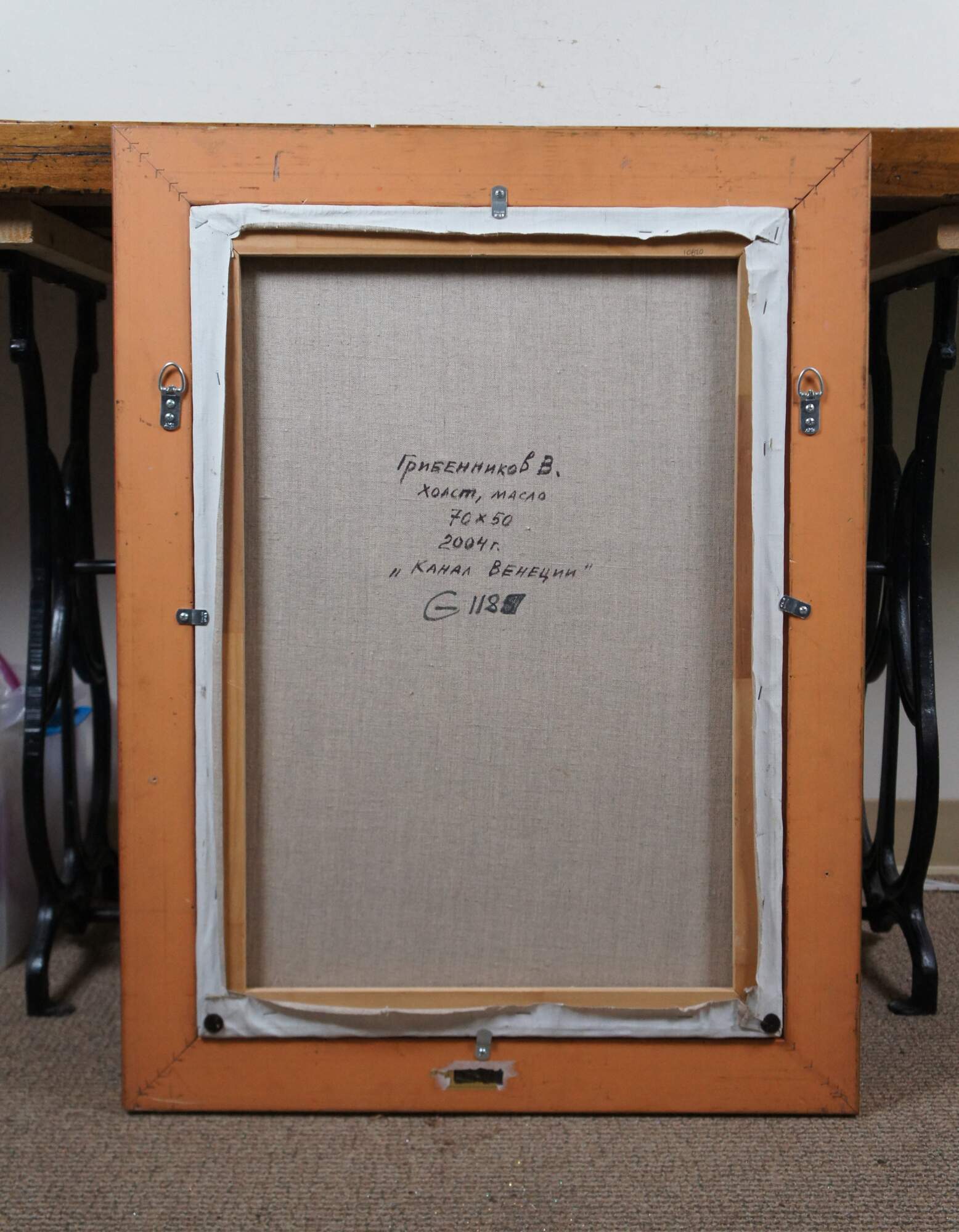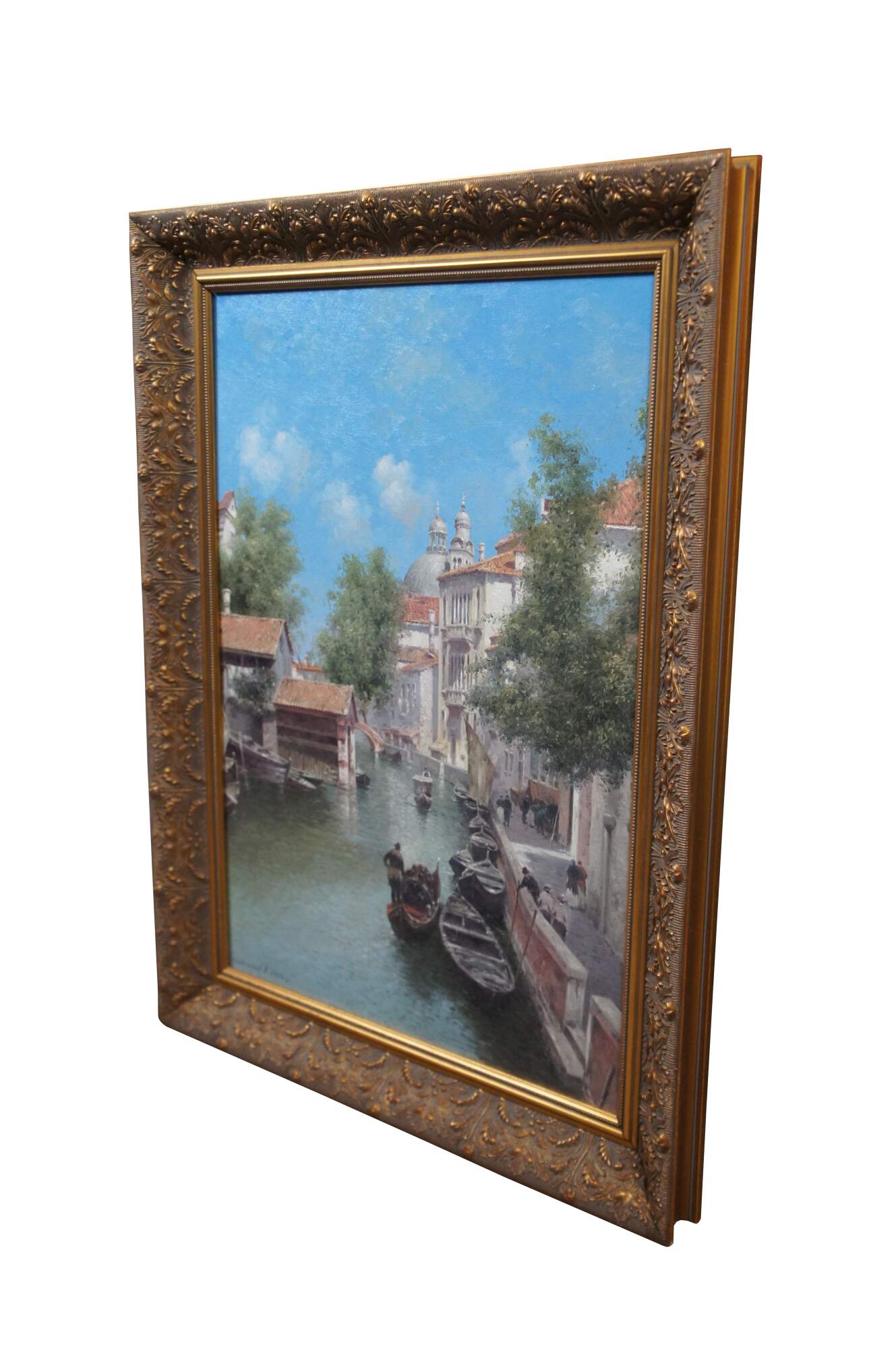 Vintage Russian Impressionist oil painting on canvas by Vasily Gribennikov. It features a river / canal view in Venice Italy, circa 2004. Signed lower left. Gold frame with acanthus leaf design.
