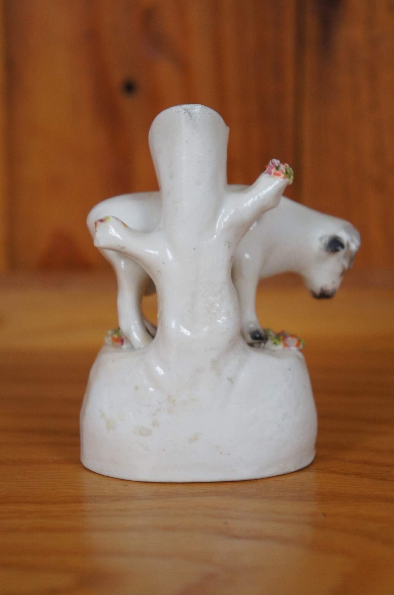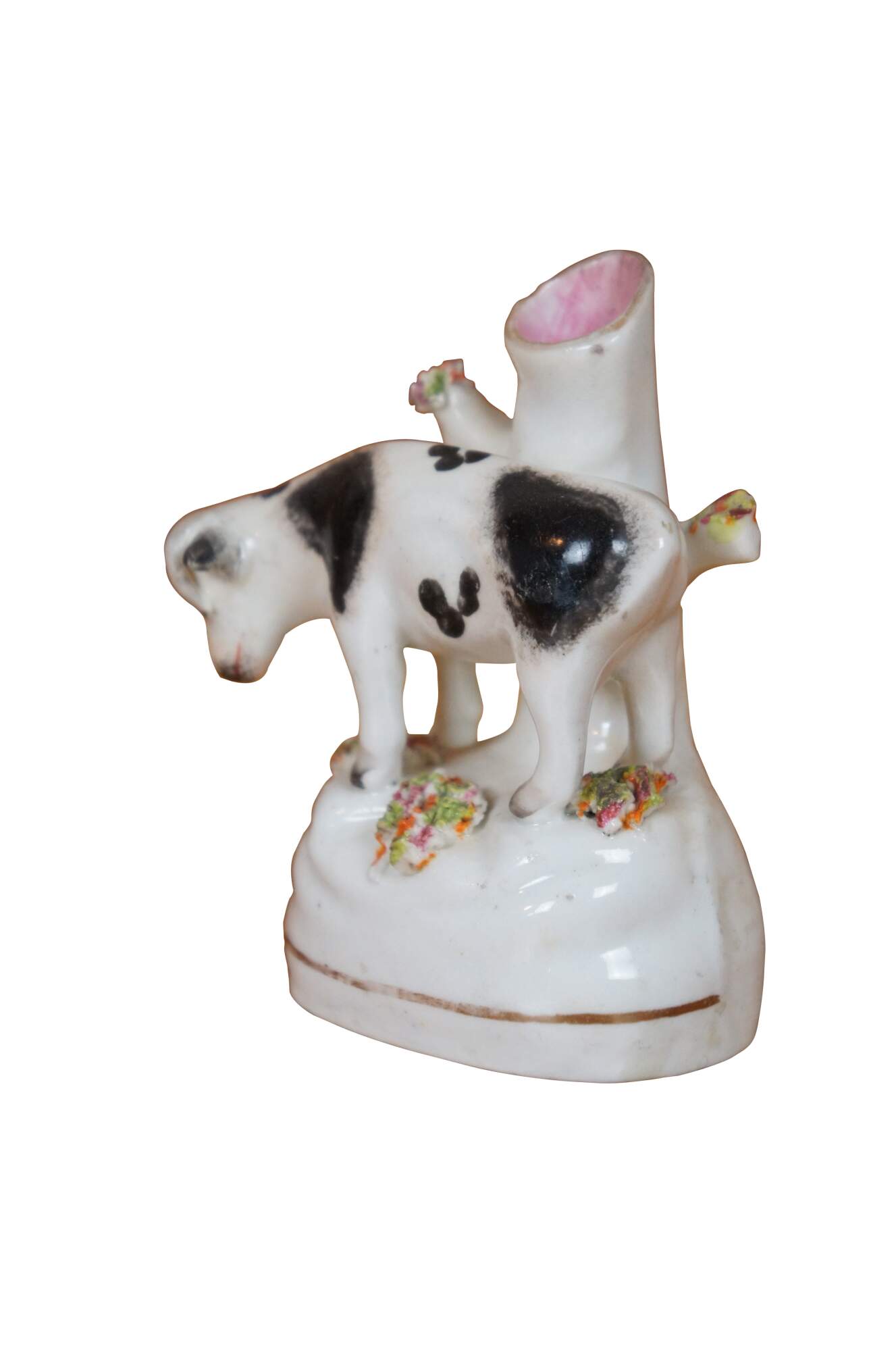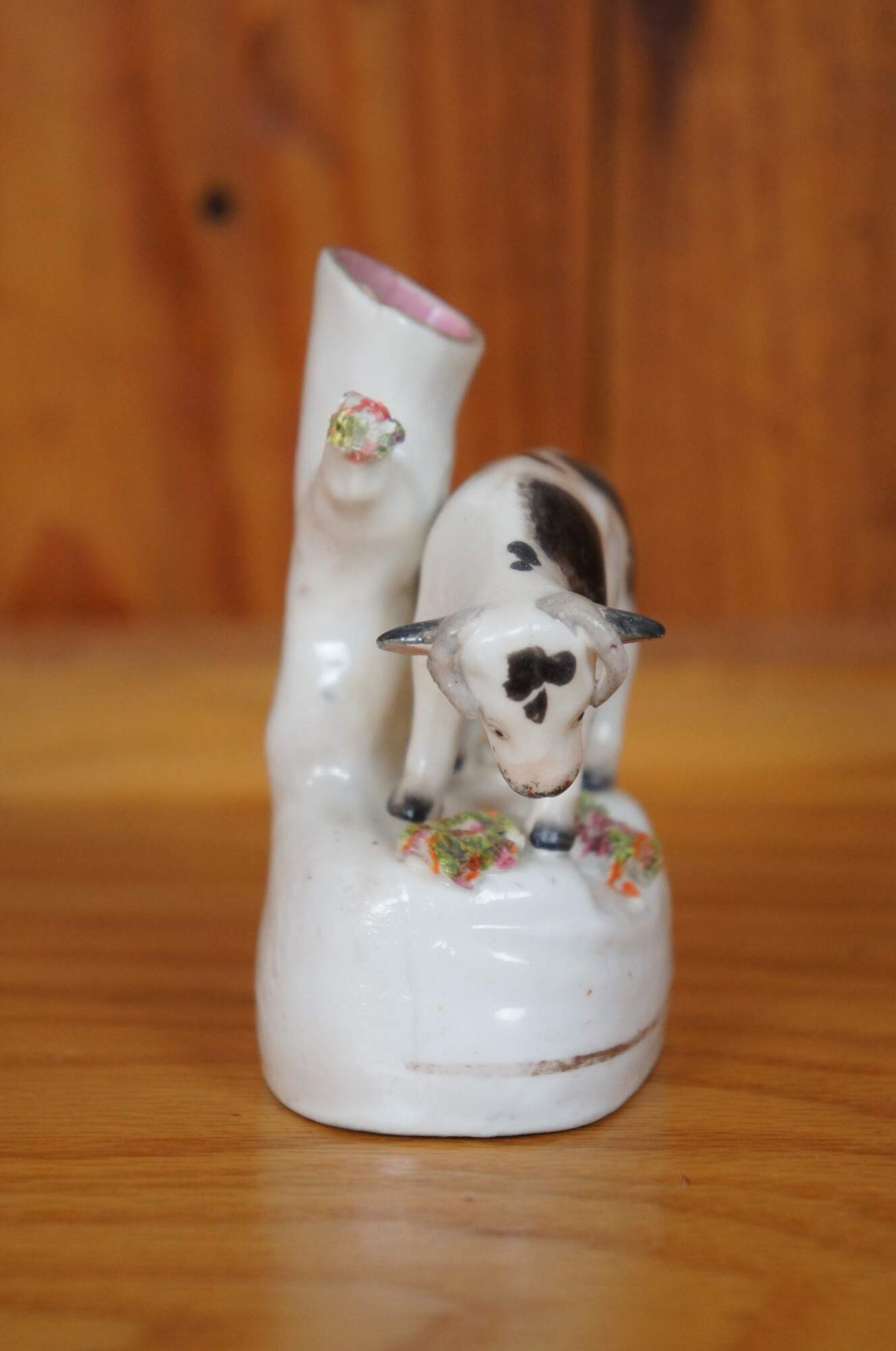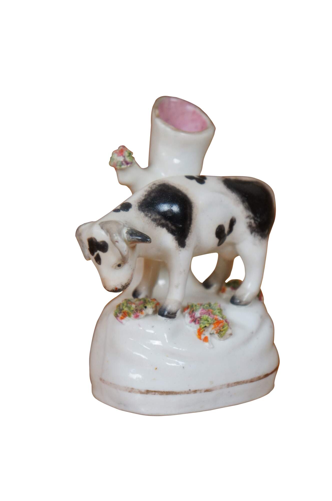 Antique 19th century Staffordshire porcelain cow bud vase / spill vase flatback figurine featuring a cow grazing in th meadow.