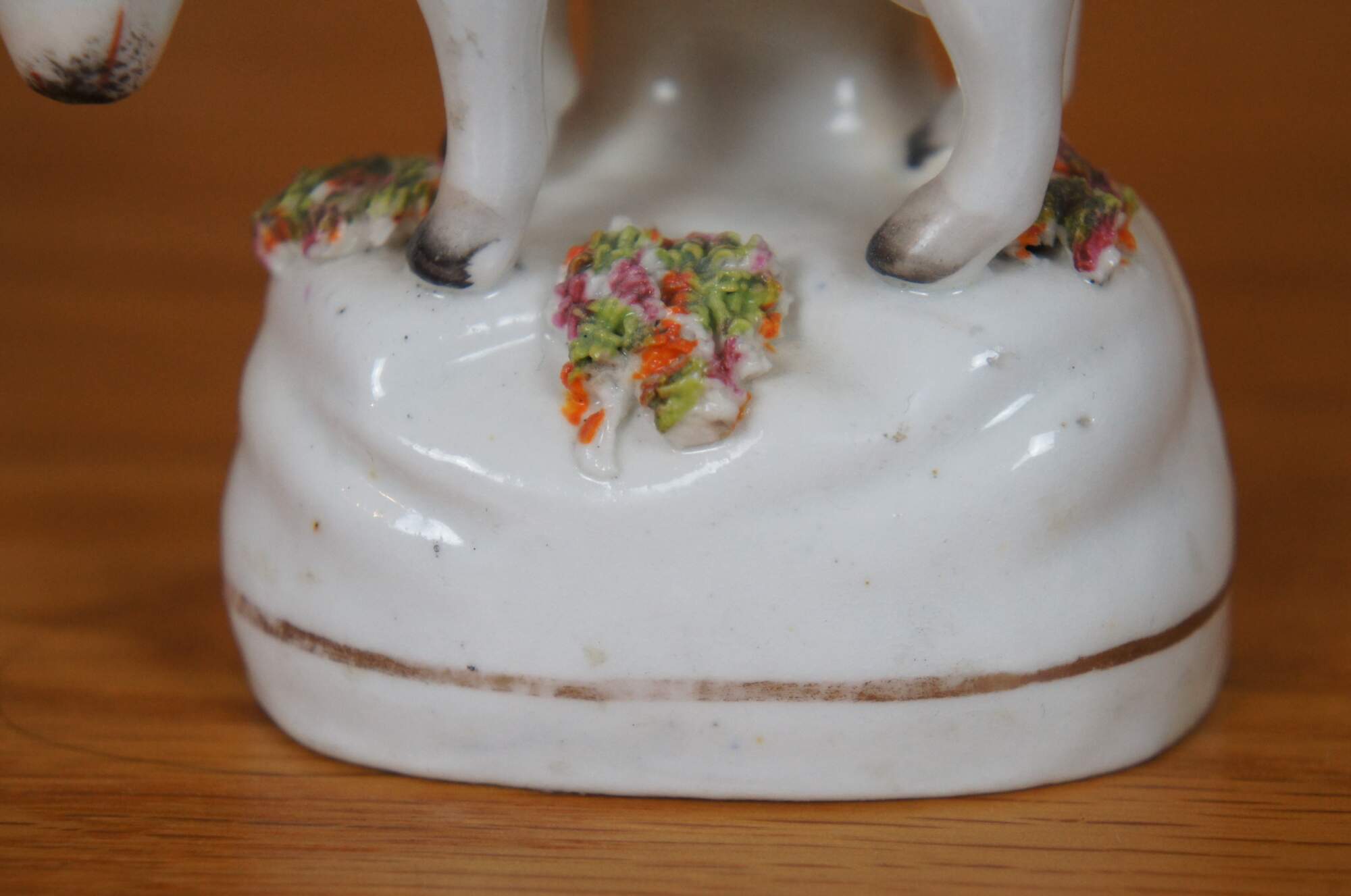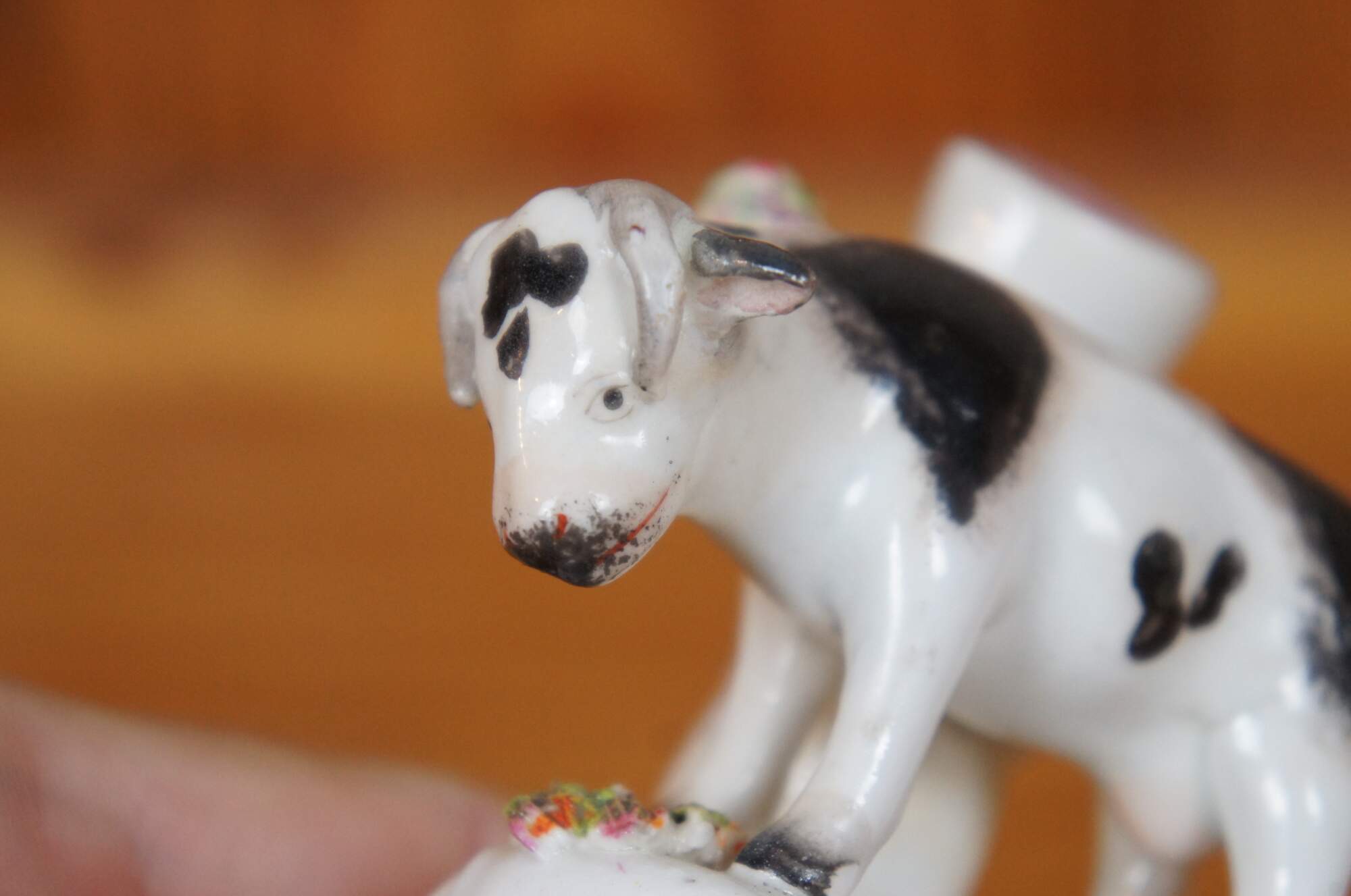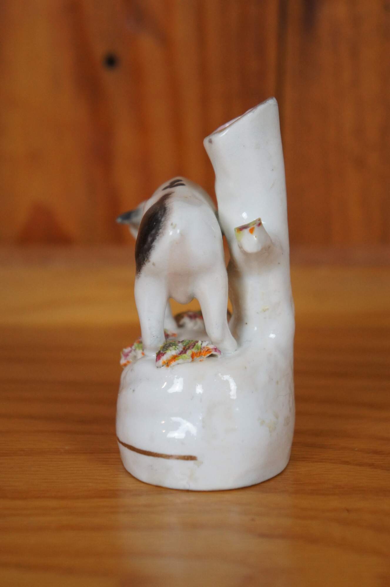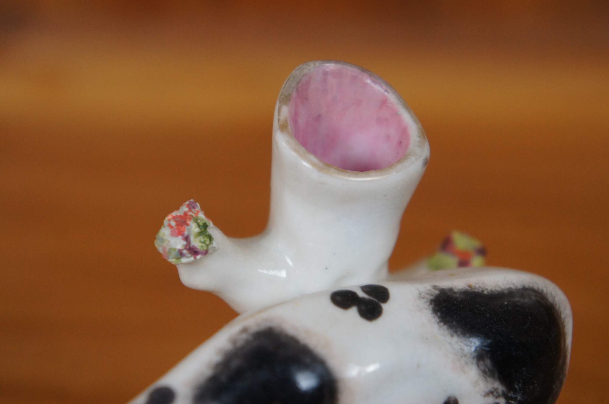 Antique 19th century Staffordshire porcelain cow bud vase / spill vase flatback figurine featuring a cow grazing in th meadow.