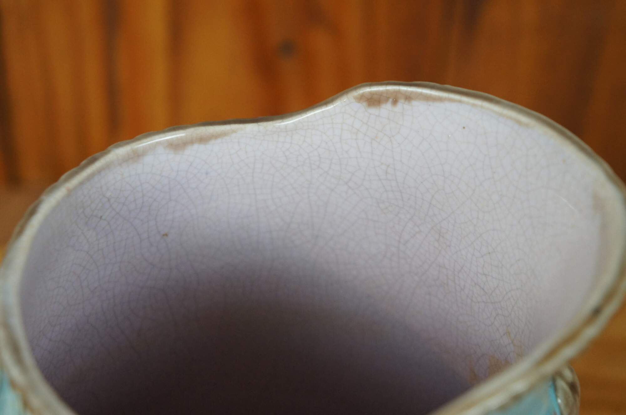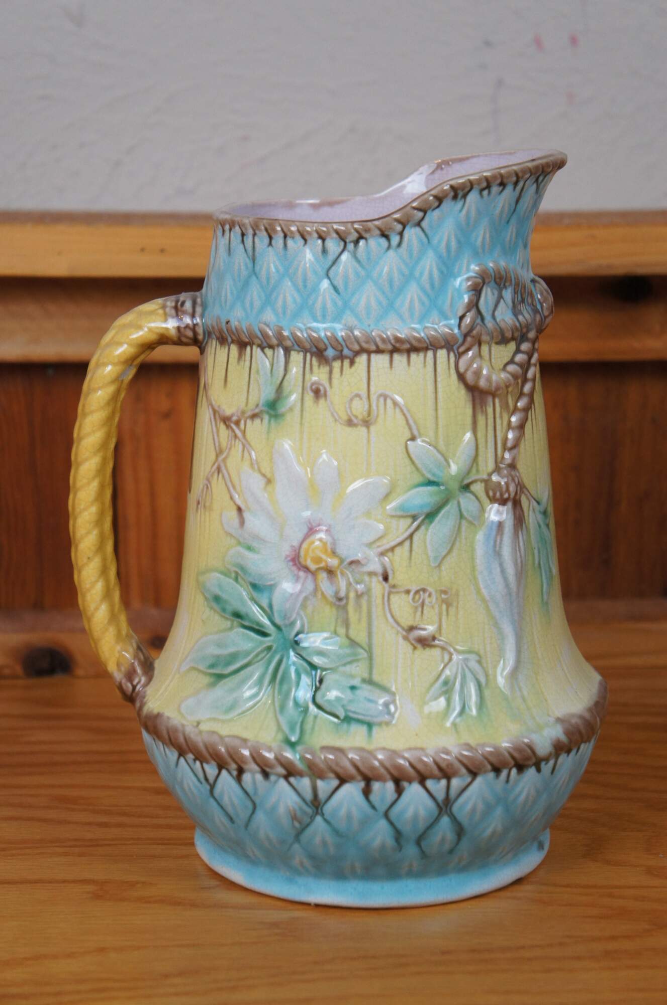 Very large and impressive antique Majolica French country pitcher / jug / carafe featuring a turquoise blue and yellow pineapple design with Passion flowers accented with a rope twist boarder and handle, and lavender interior. Attributed to Wardle.