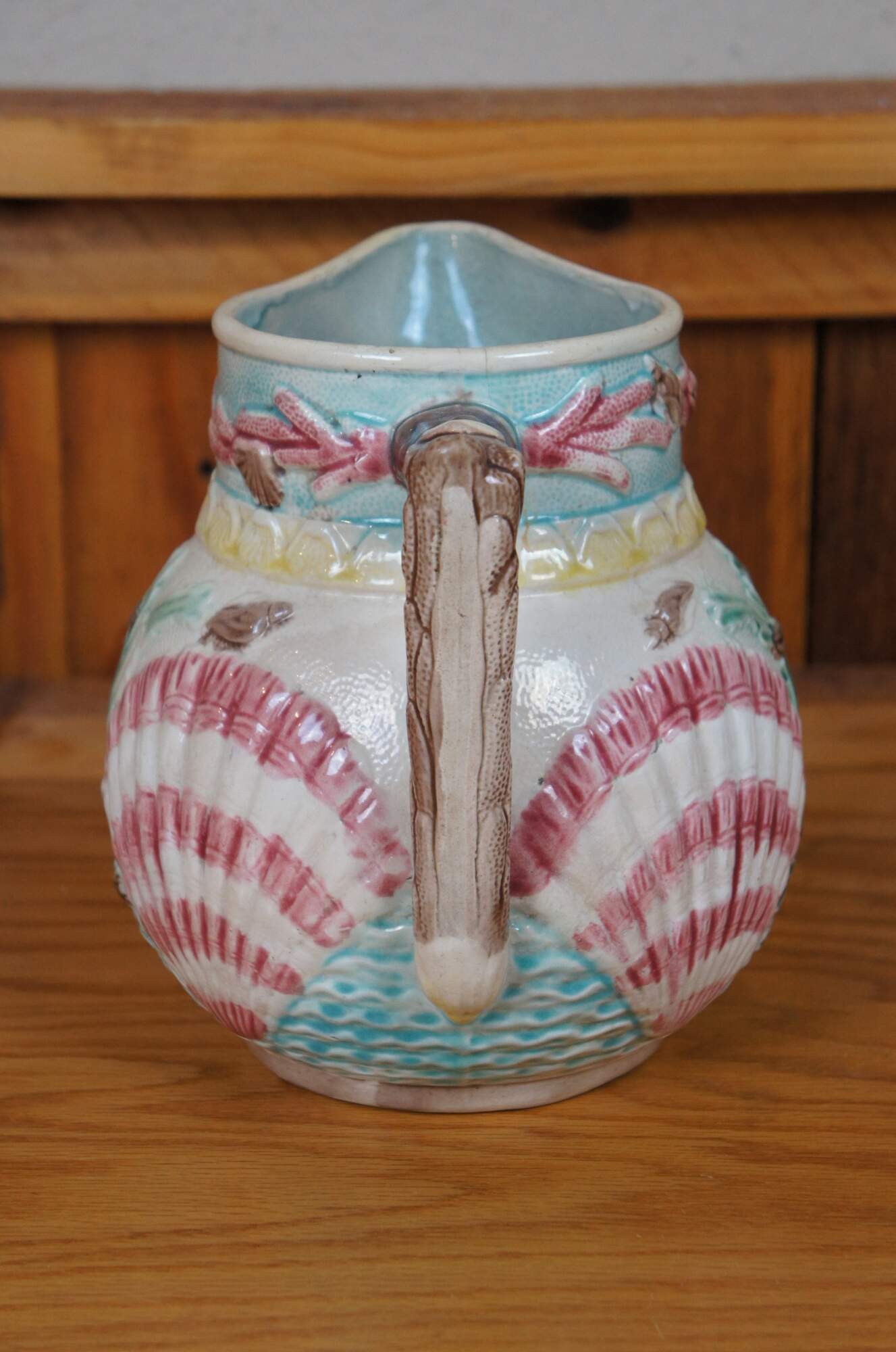 Large antique Arsenal Pottery after Wardle Majolica nautical Ocean pitcher / jug / carafe featuring a coral seashell and seaweed theme.