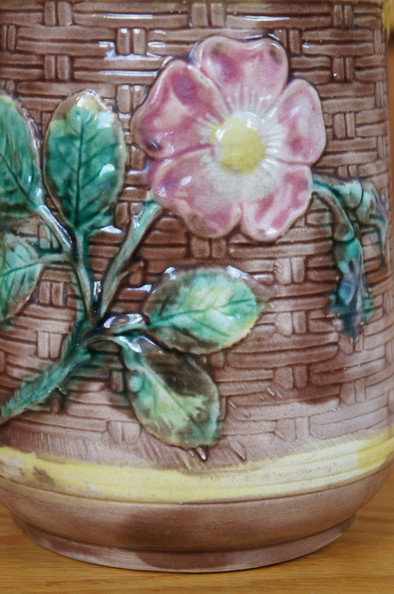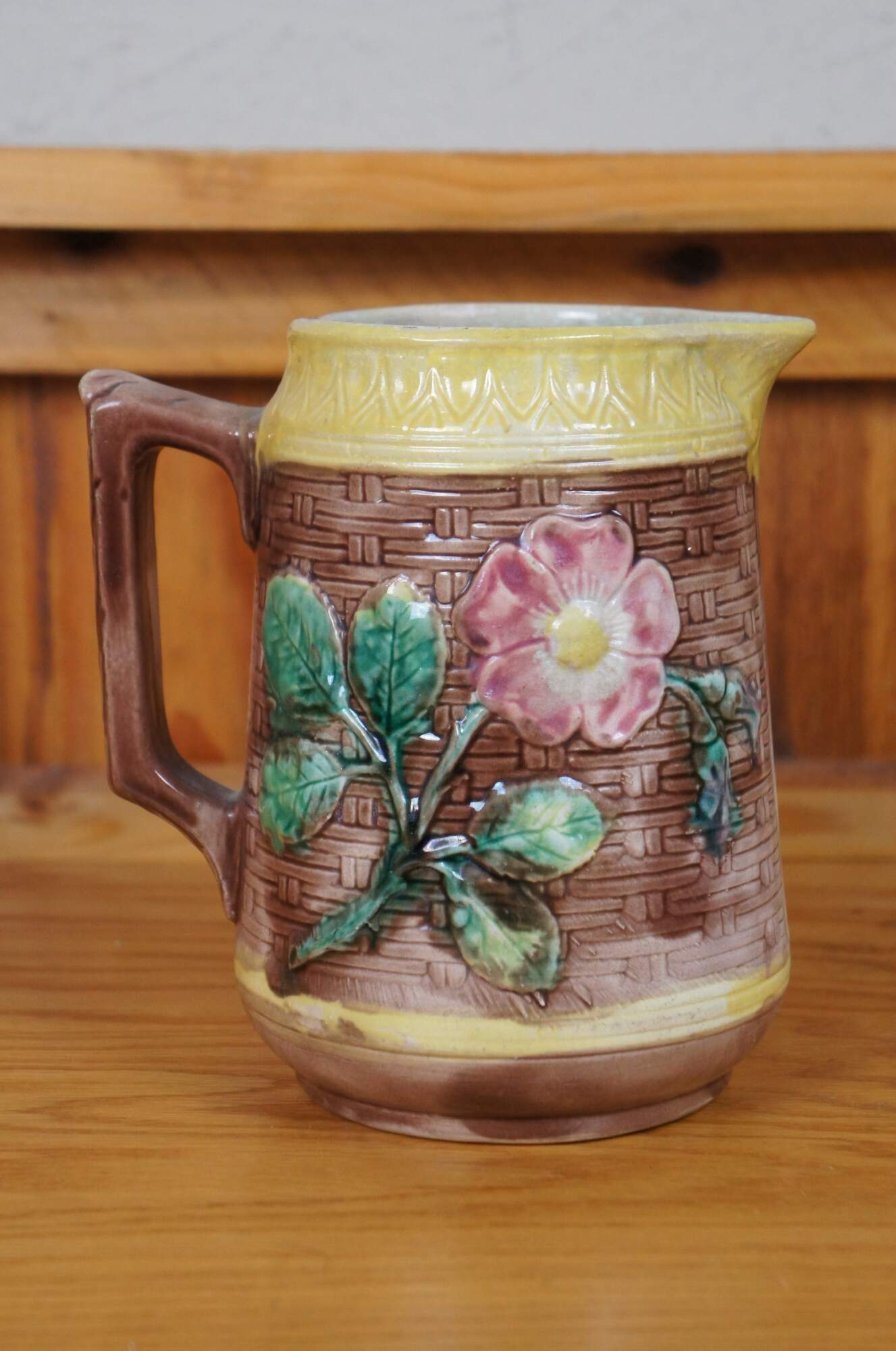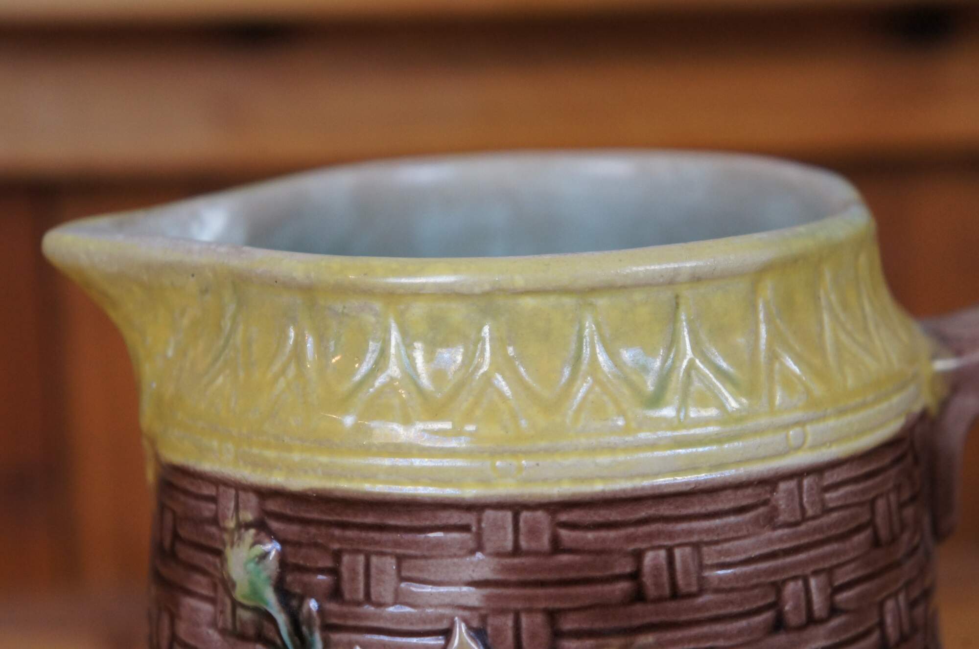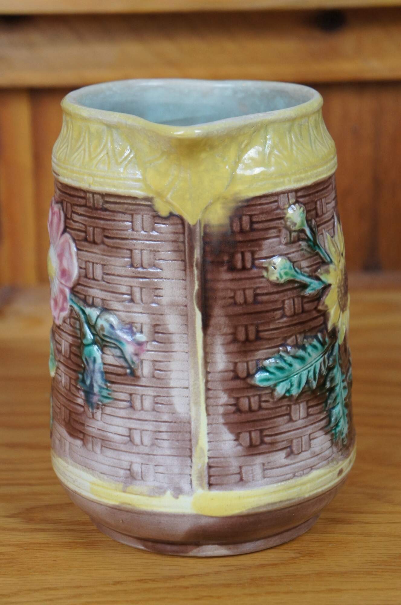 Antique Majolica creamer pitcher / jug featuring a farmhouse motif with wood grain basket weave design, sunflowers, wild dogwood flowers, and acanthus handle.