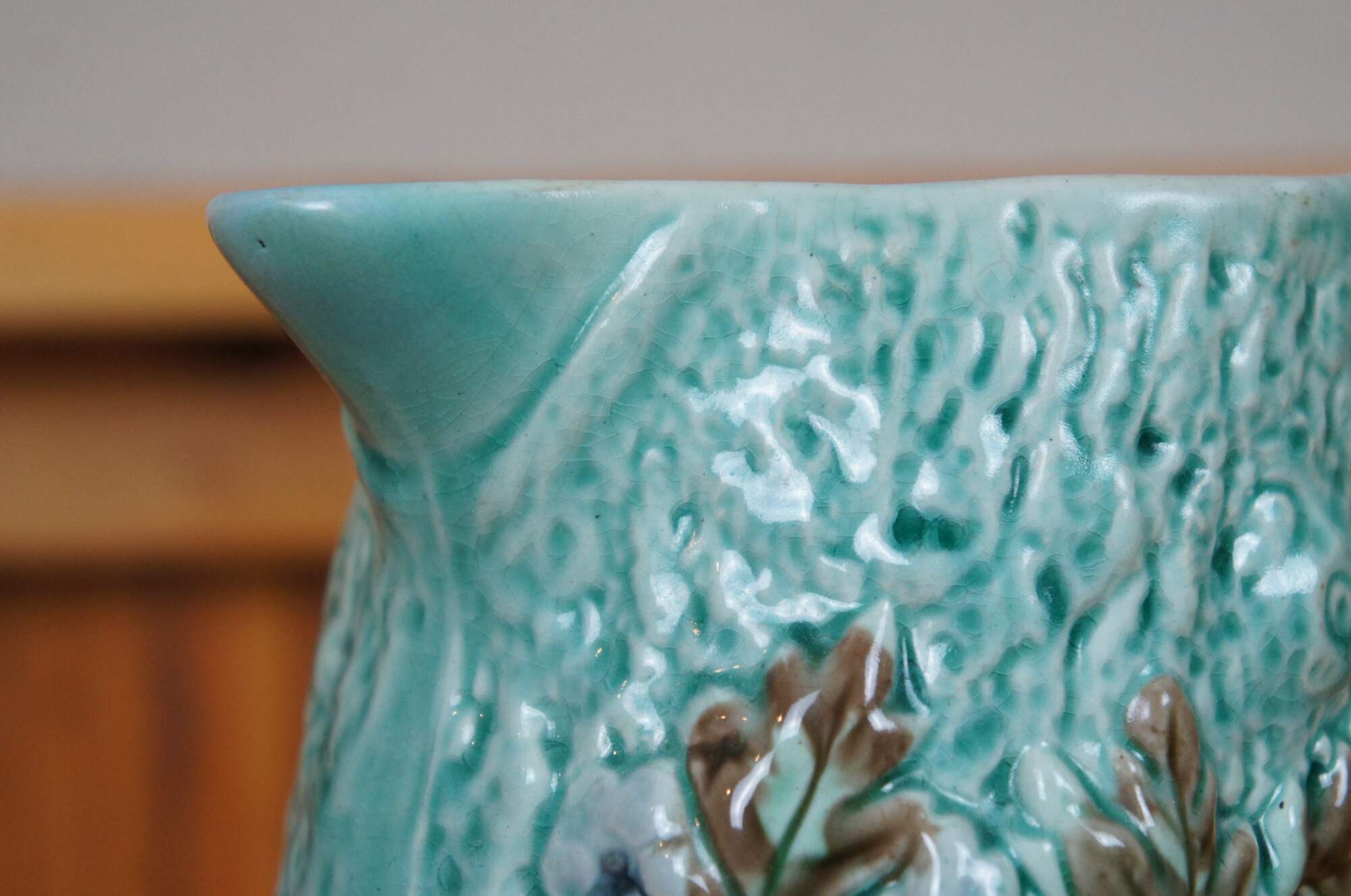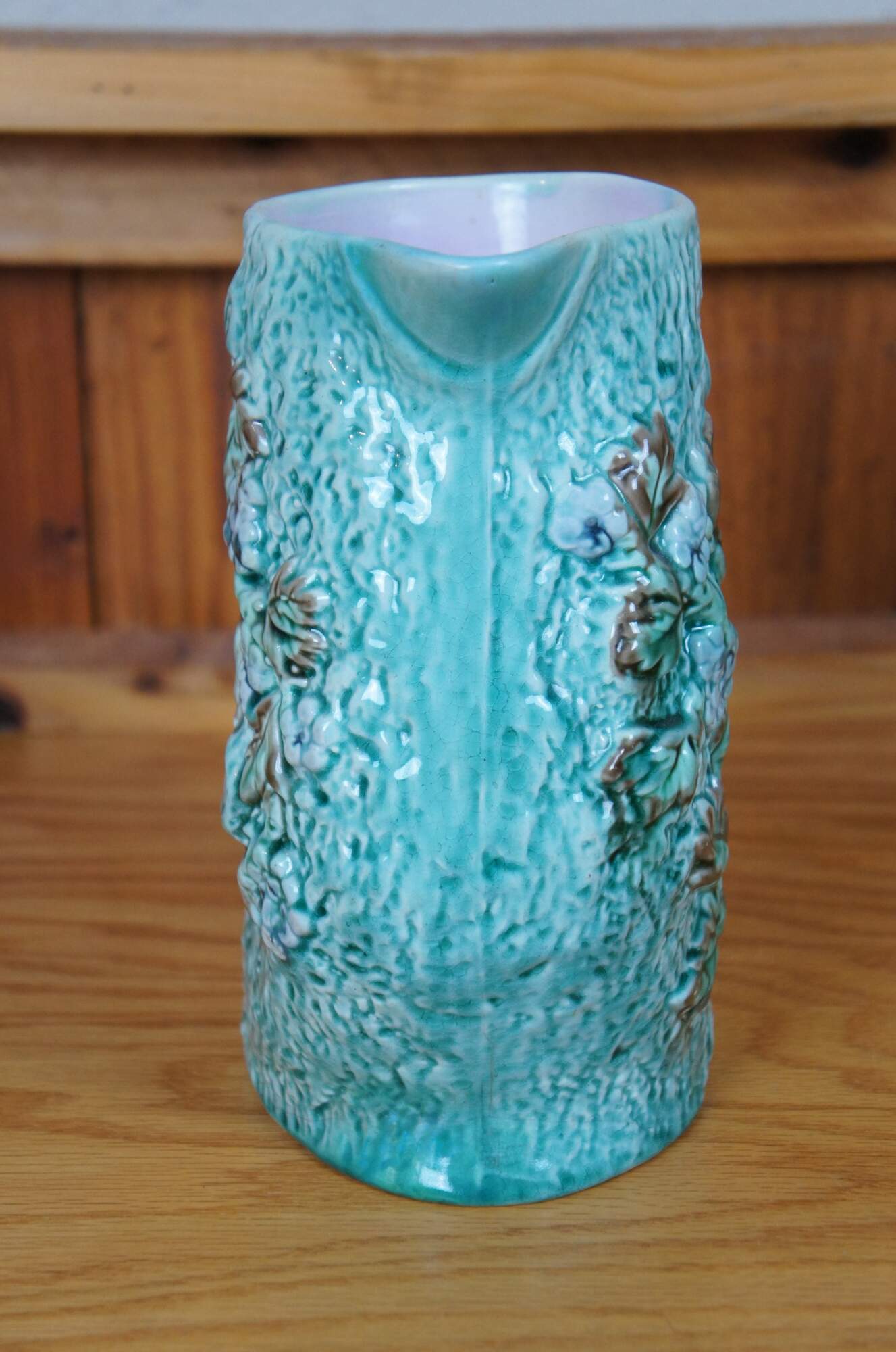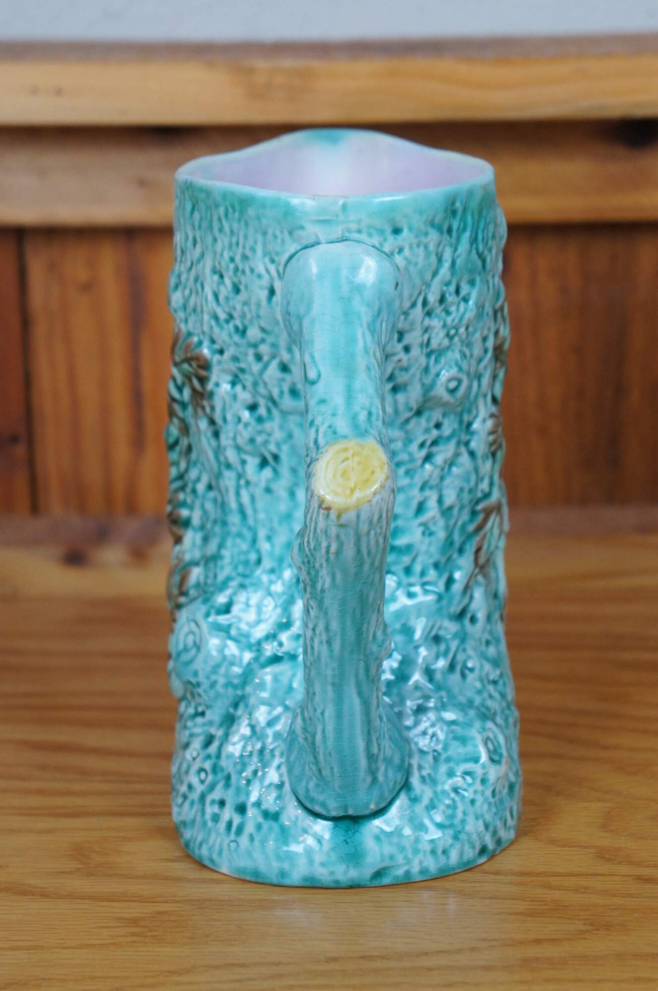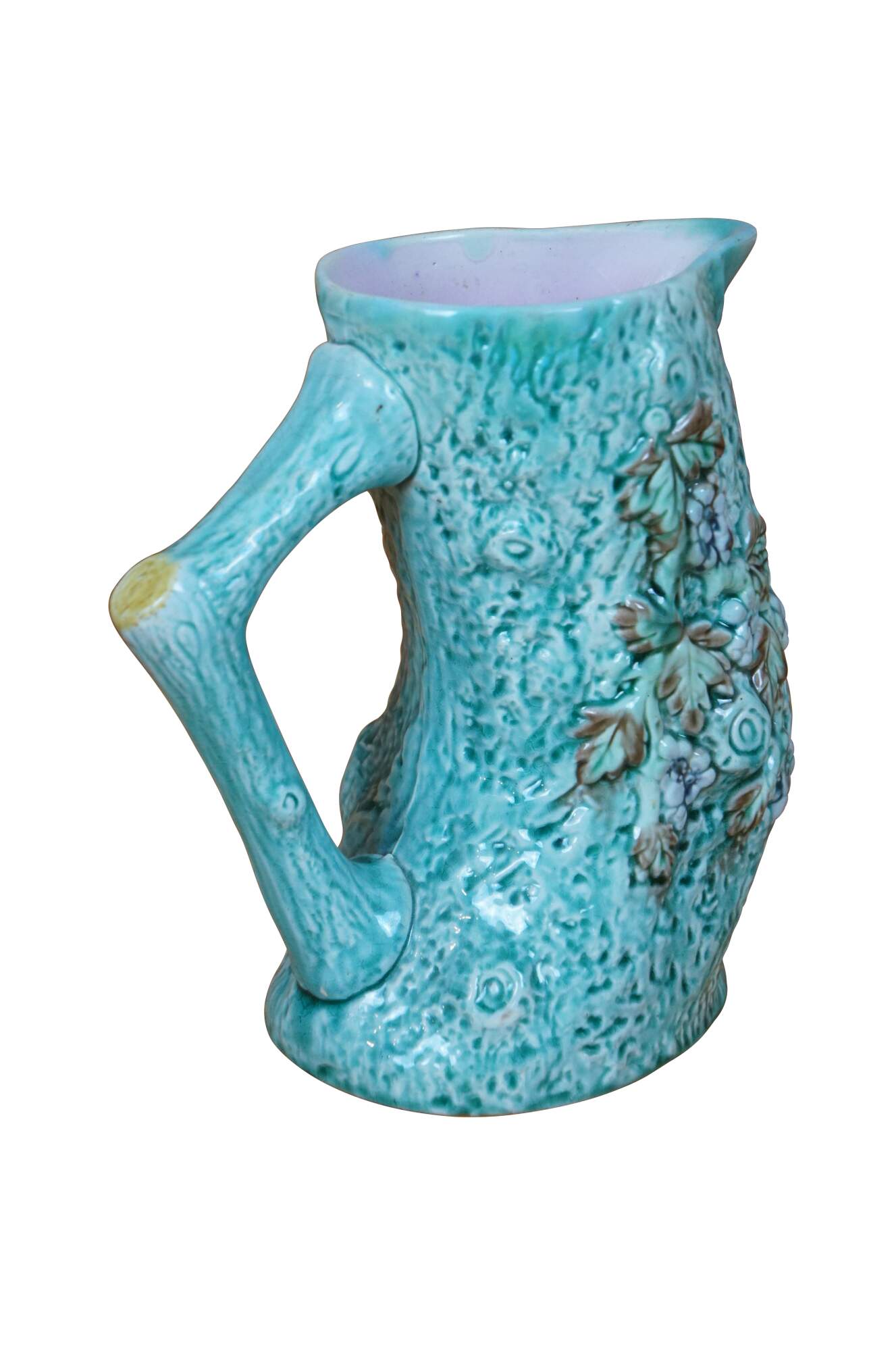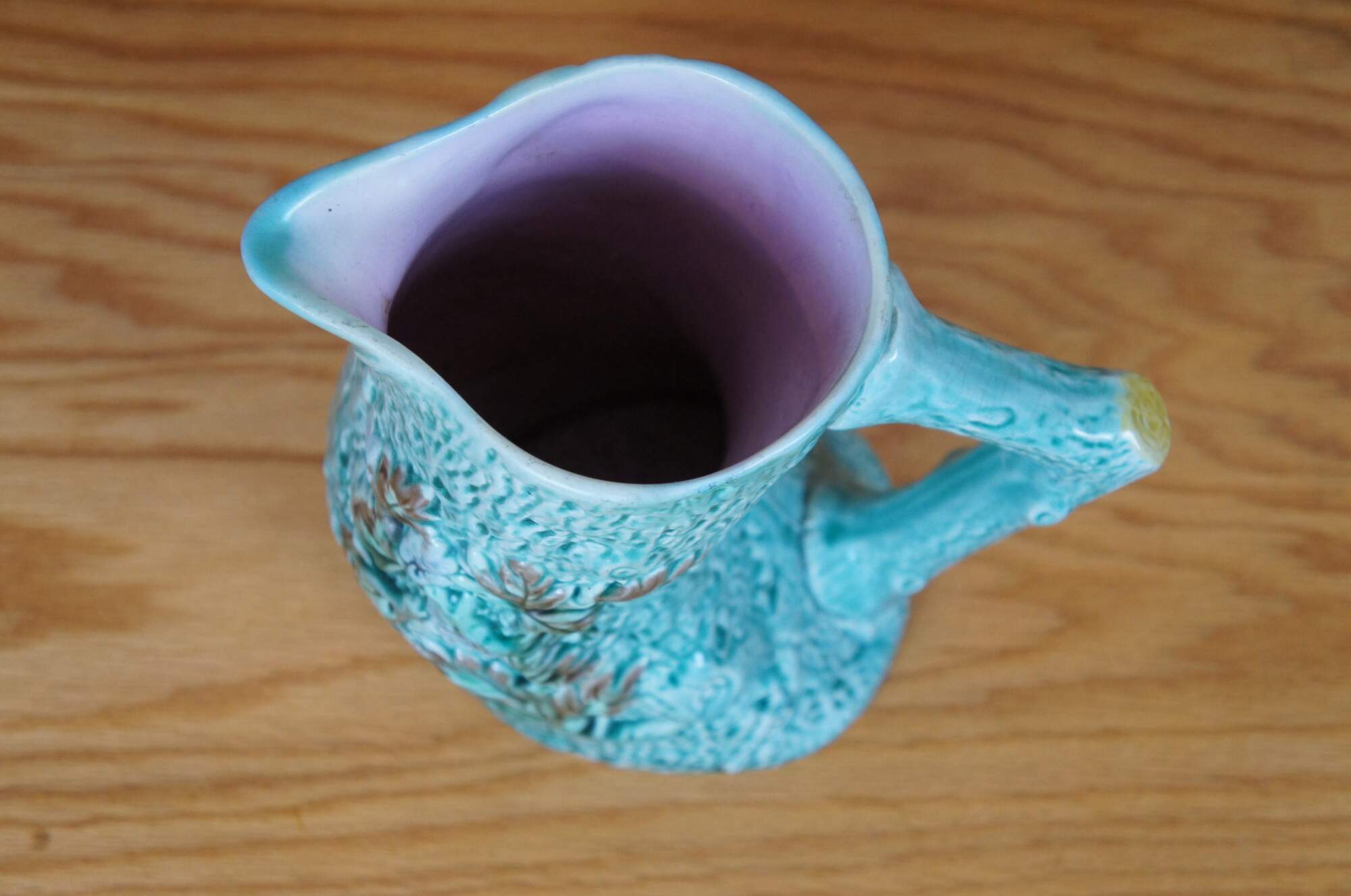 Antique Majolica adirondak style bentwood tree trunk / log / branch creamer pitcher / jug / carafe featuring a turquoise glaze over textured bark motif with flowers / leaves and purple lavender interior.