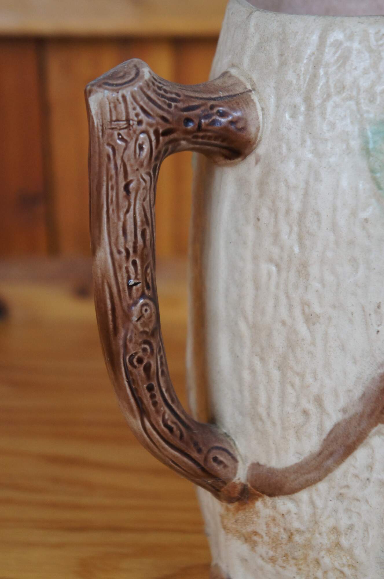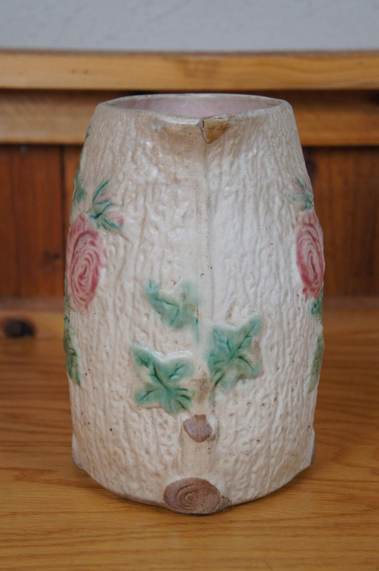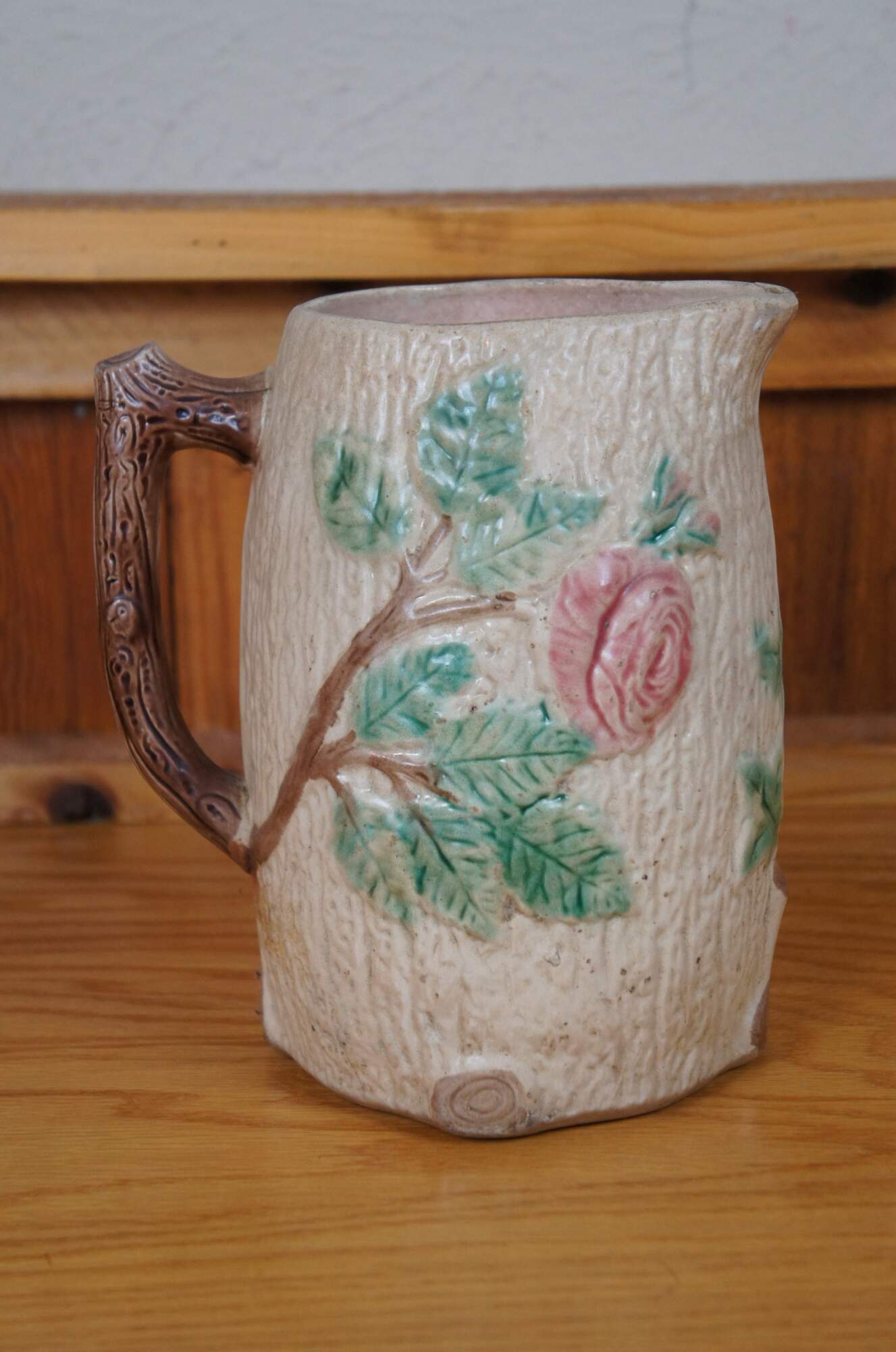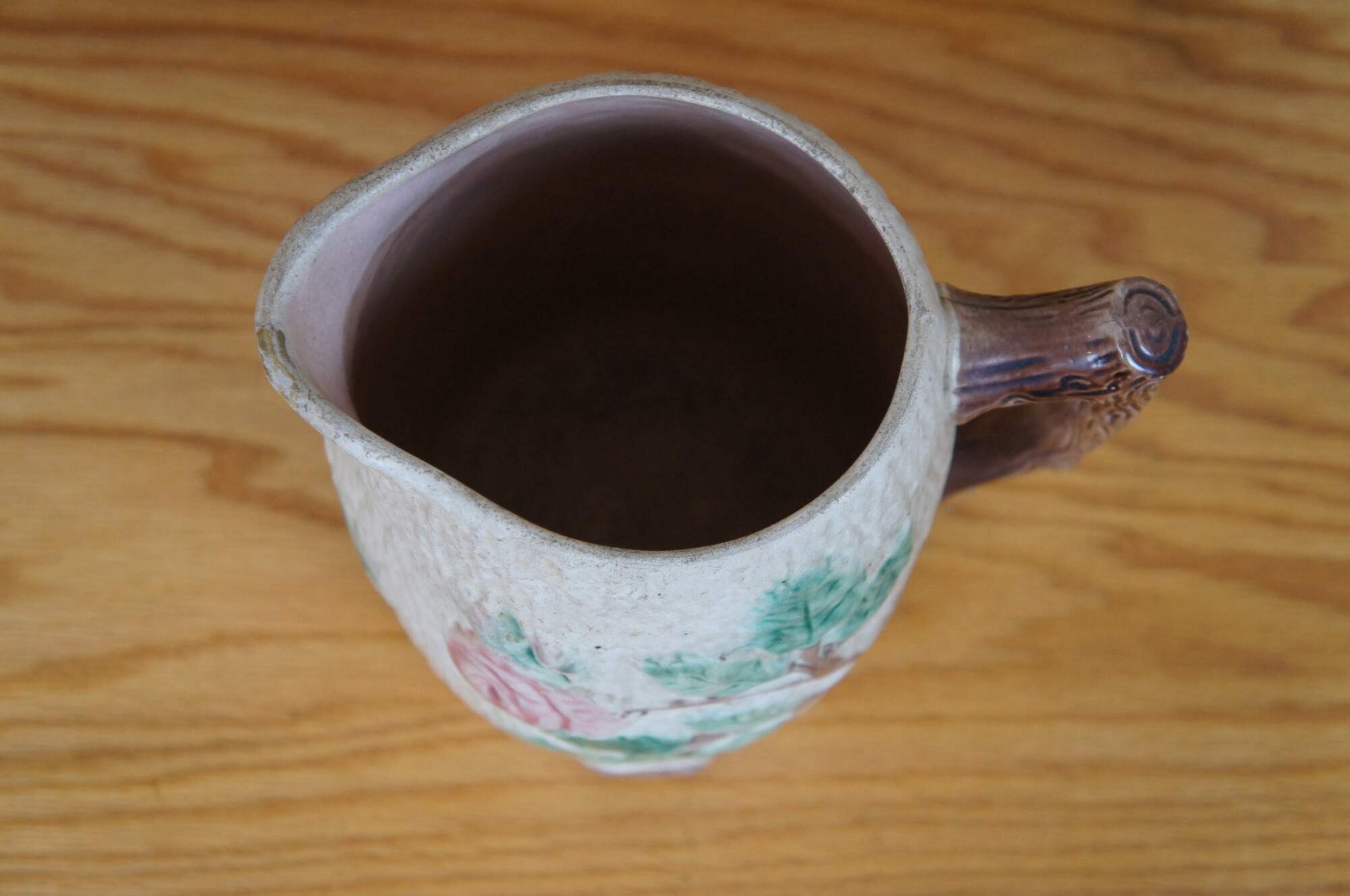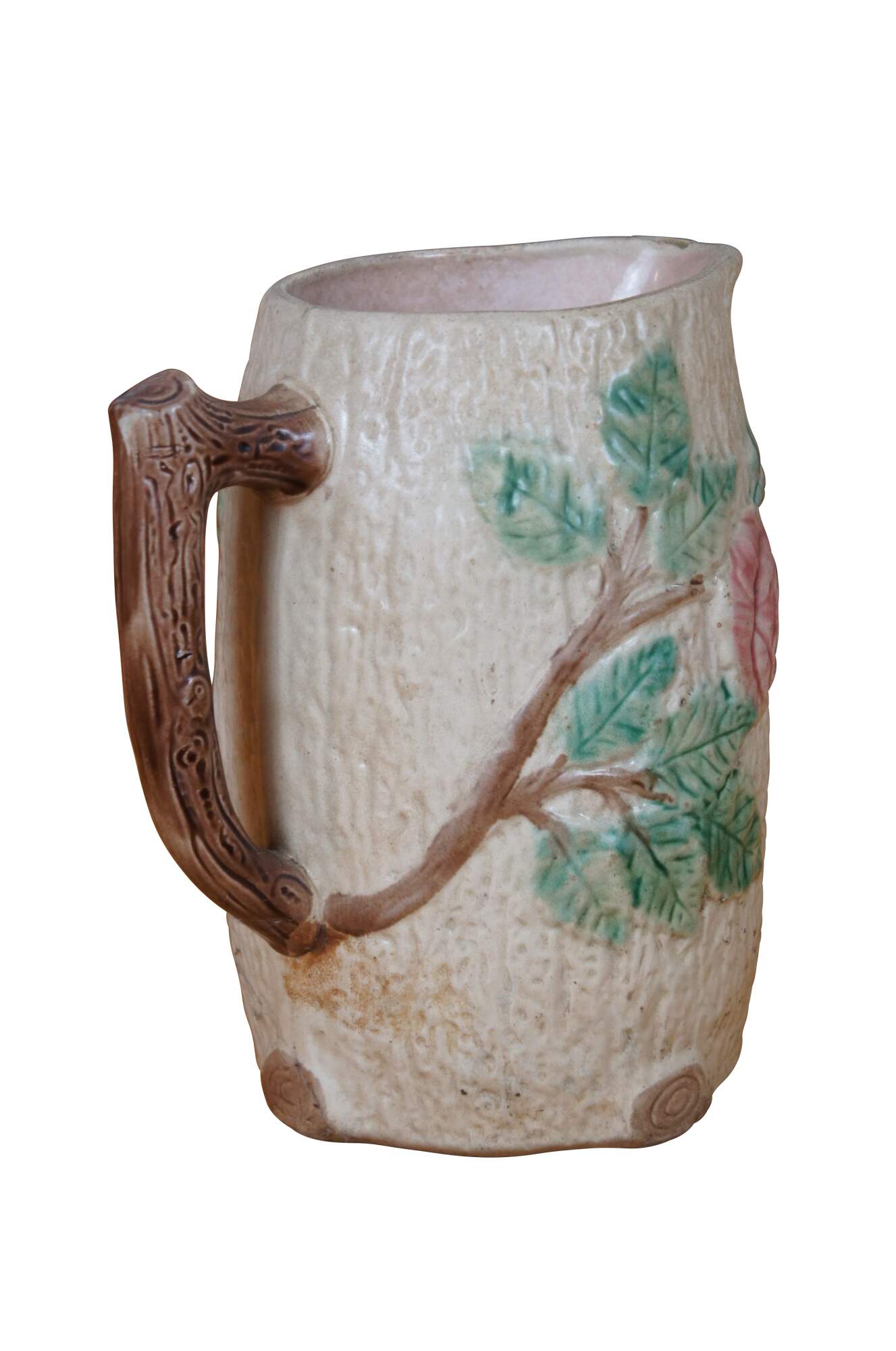 Antique Majolica Arsenal Pottery creamer pitcher / jug / carafe featuring a tree bark motif with wild roses and branch handle.