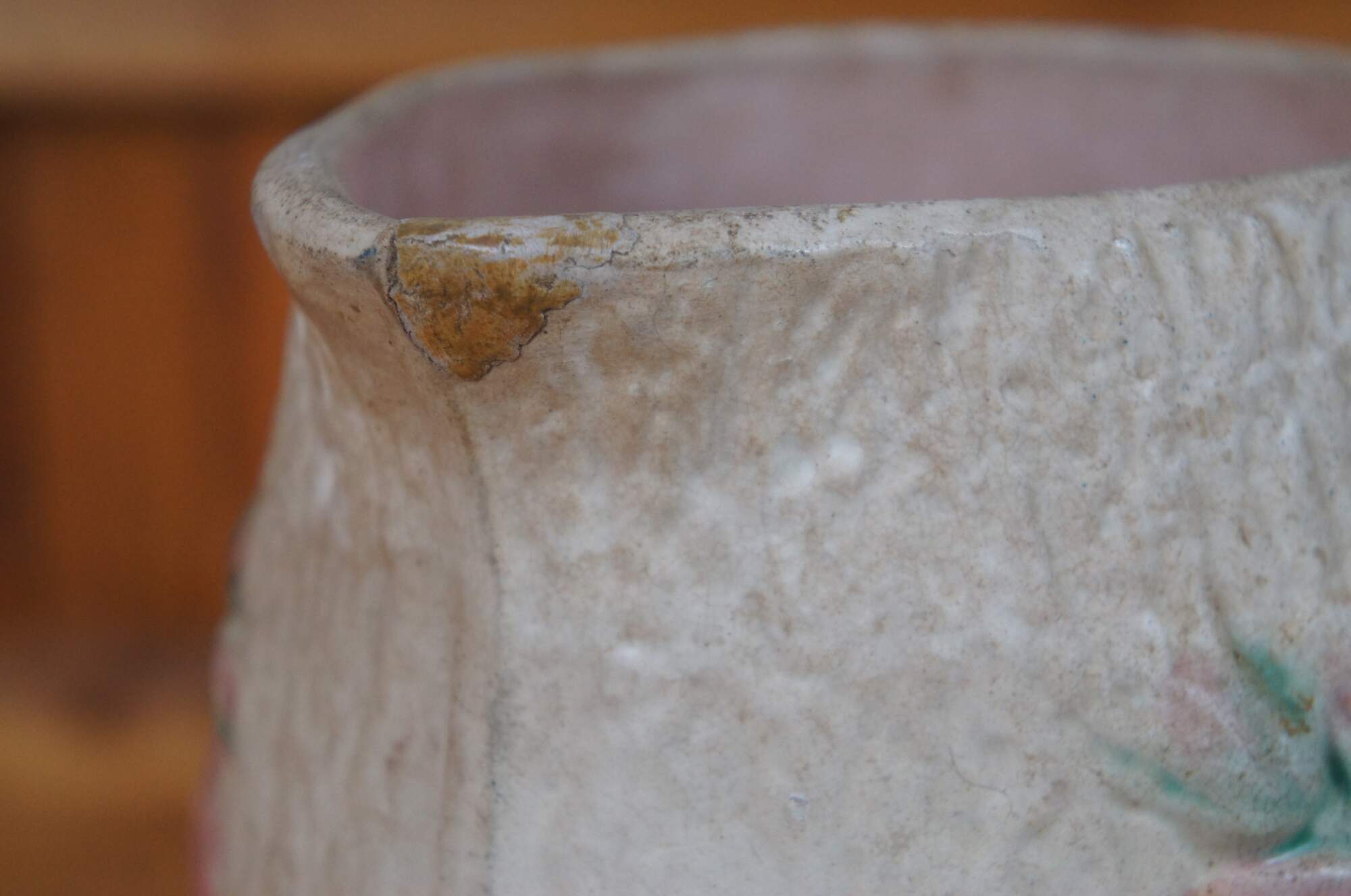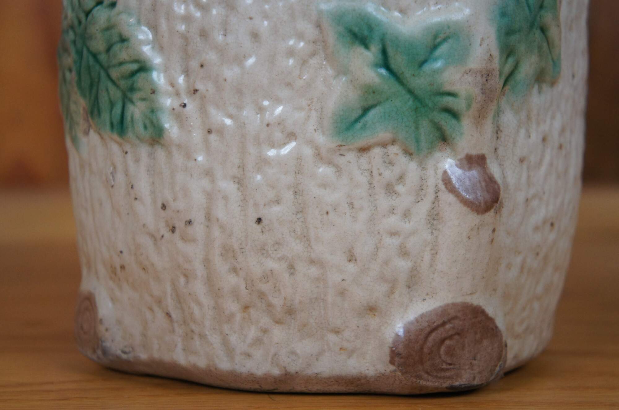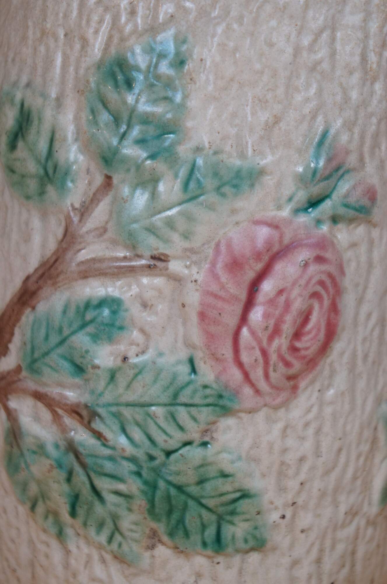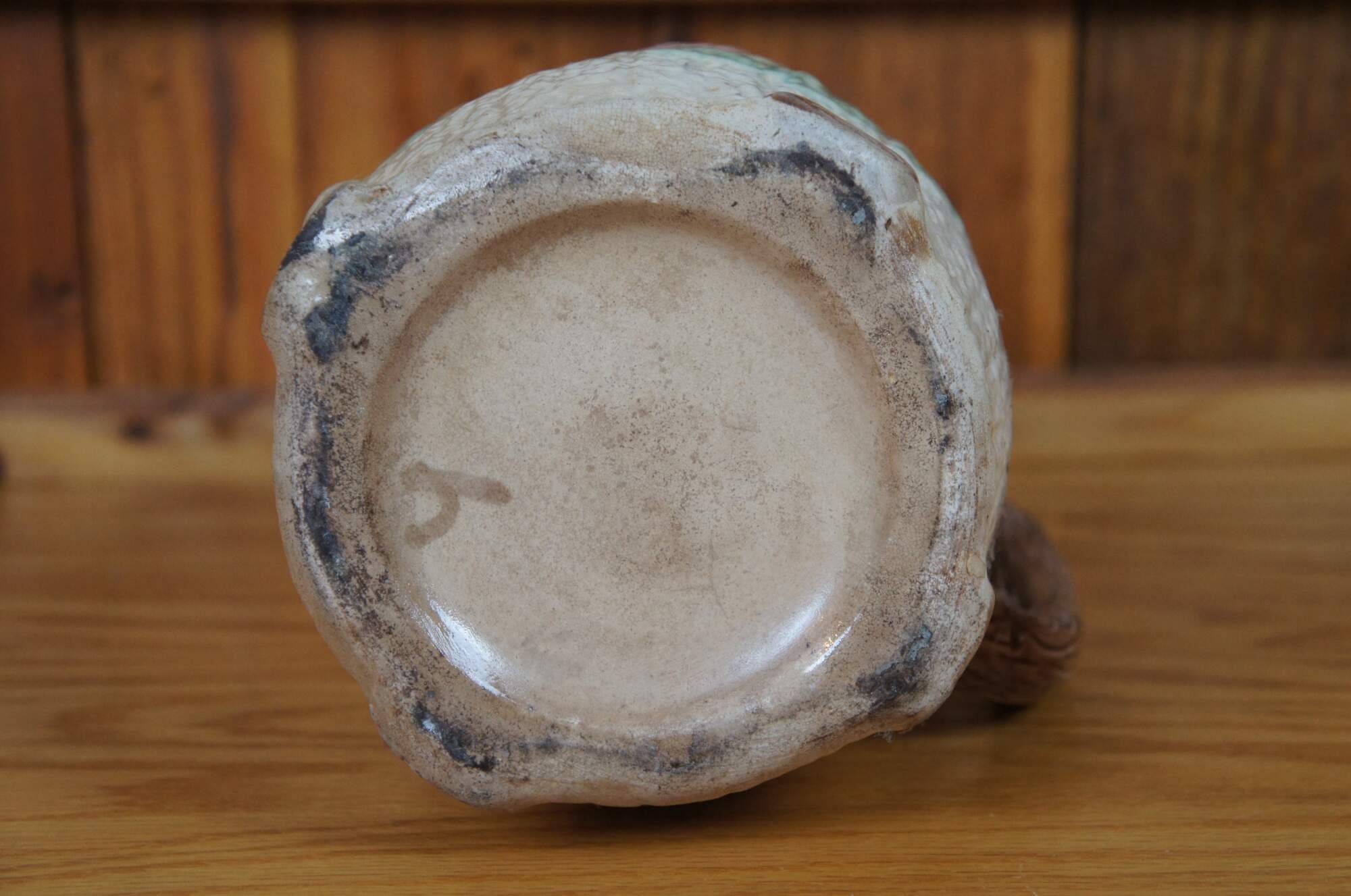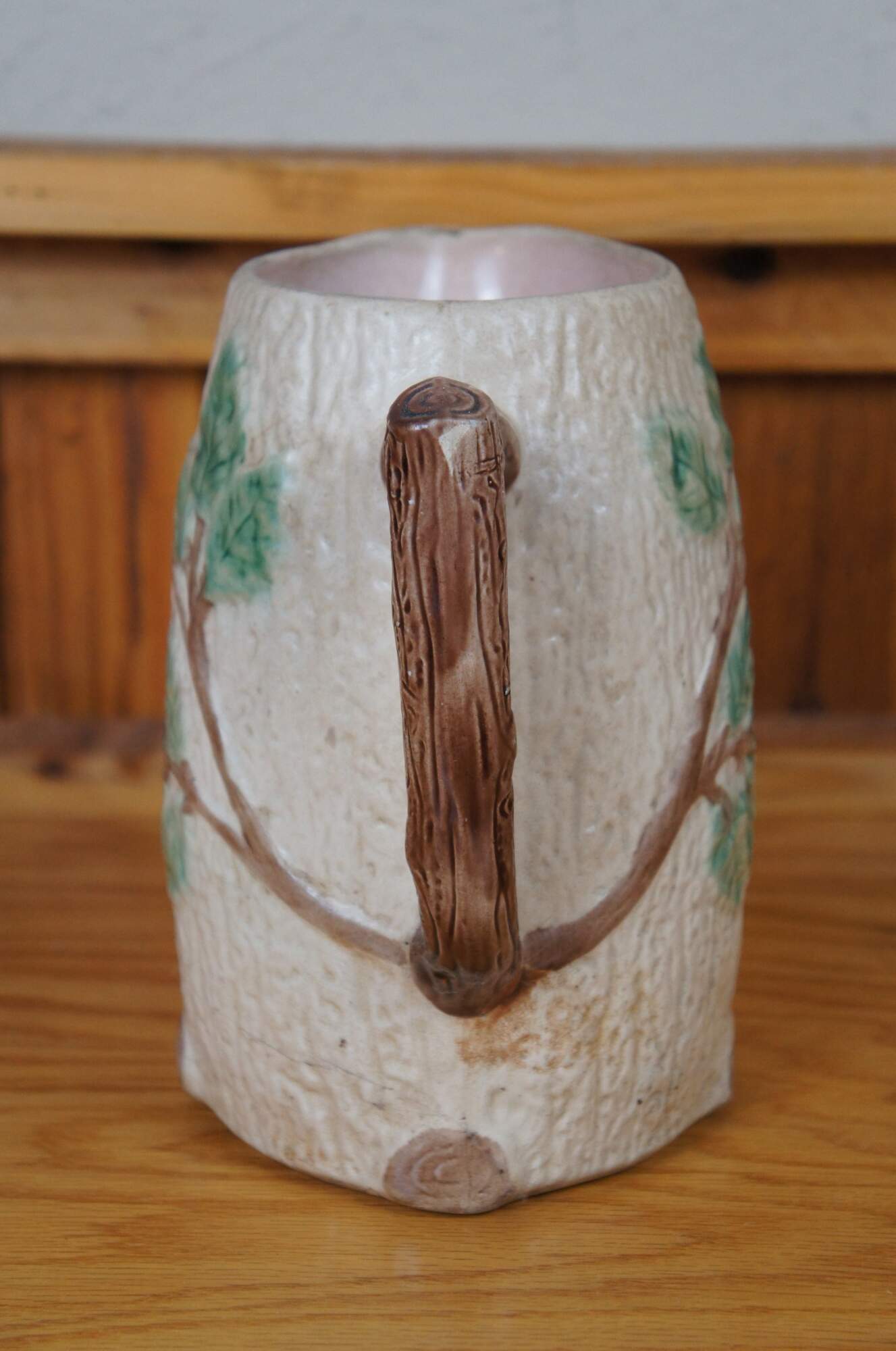 Antique Majolica Arsenal Pottery creamer pitcher / jug / carafe featuring a tree bark motif with wild roses and branch handle.