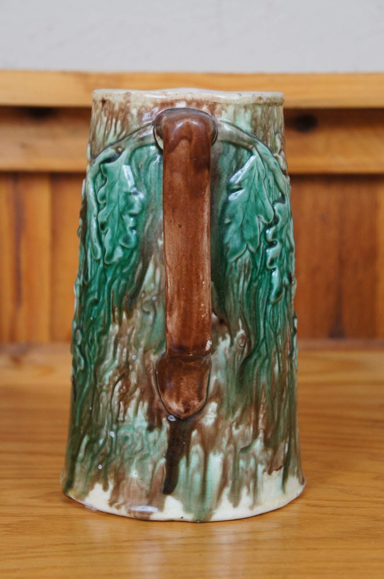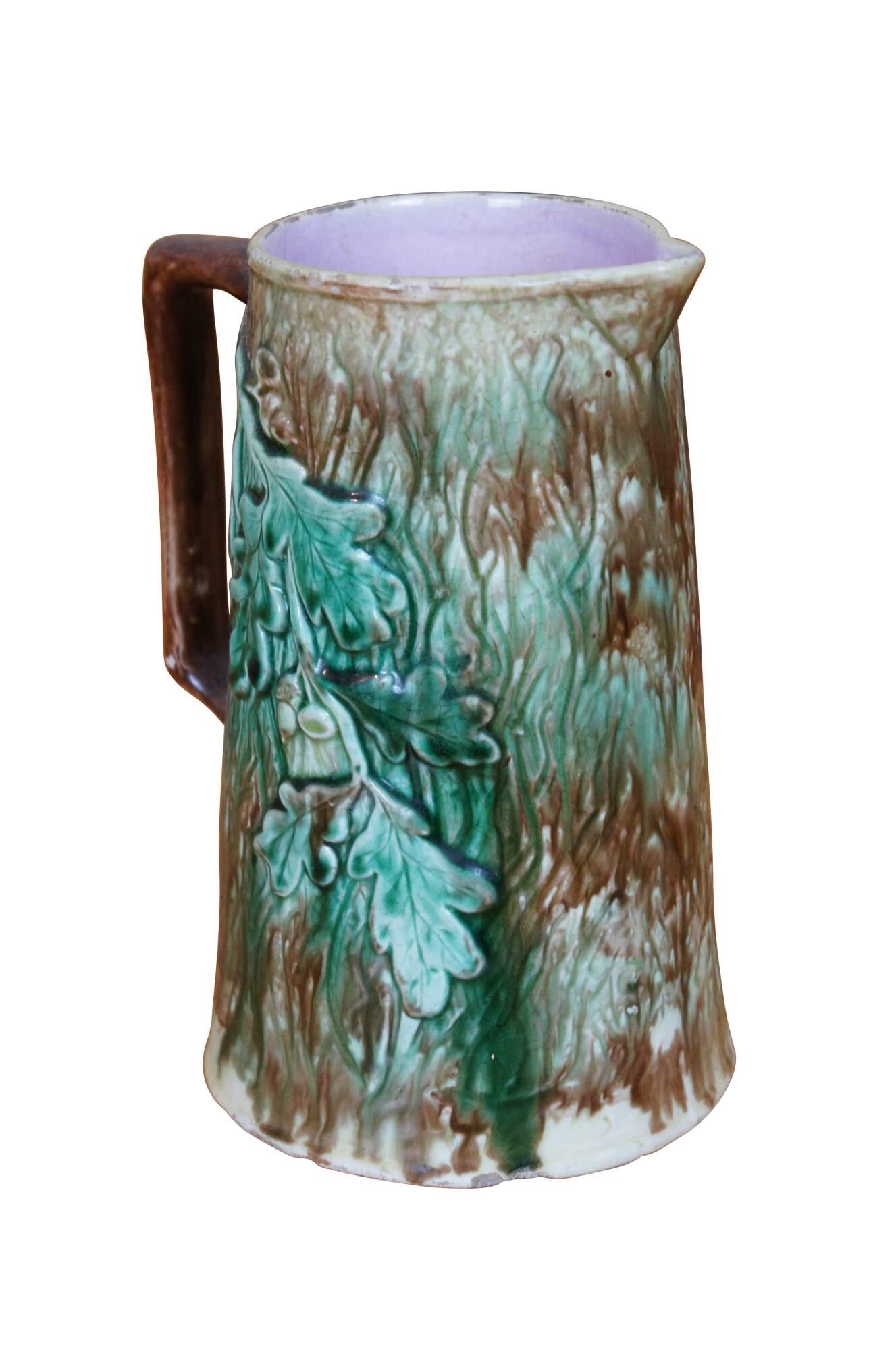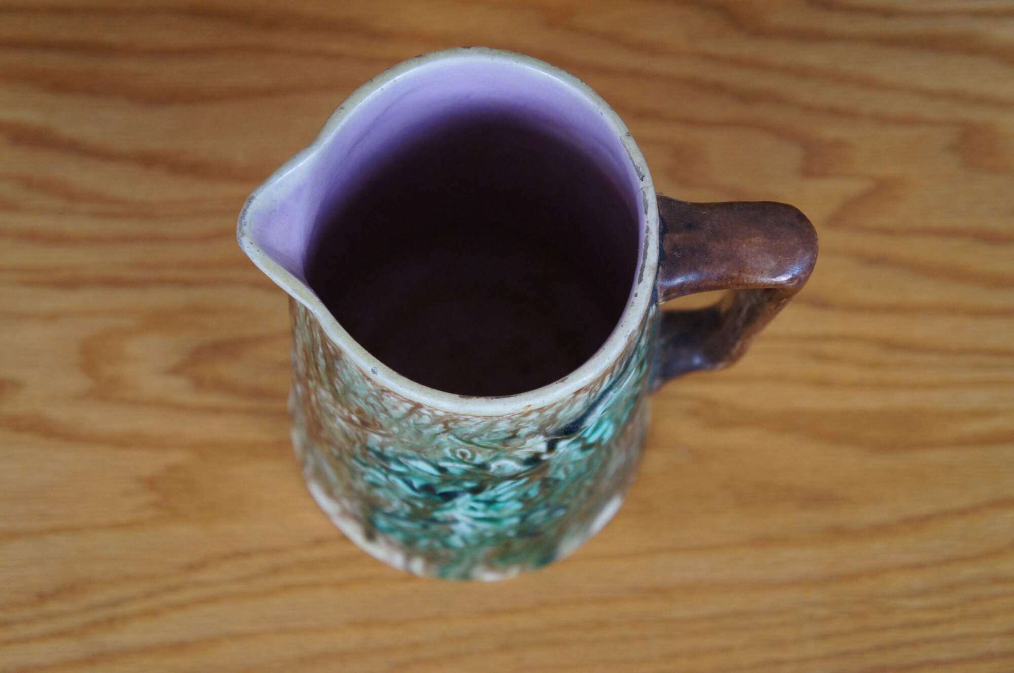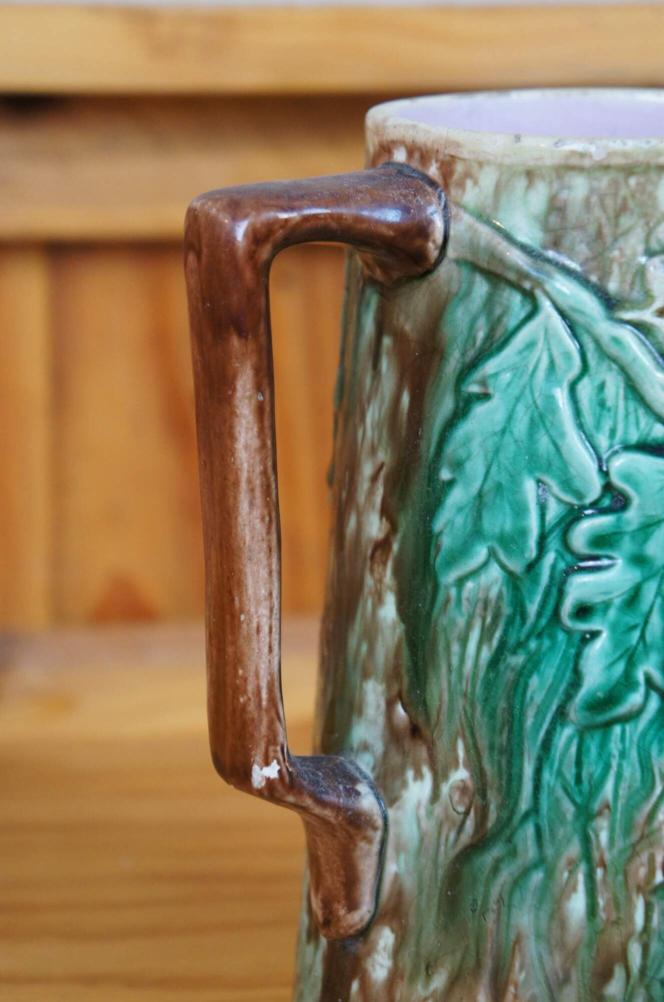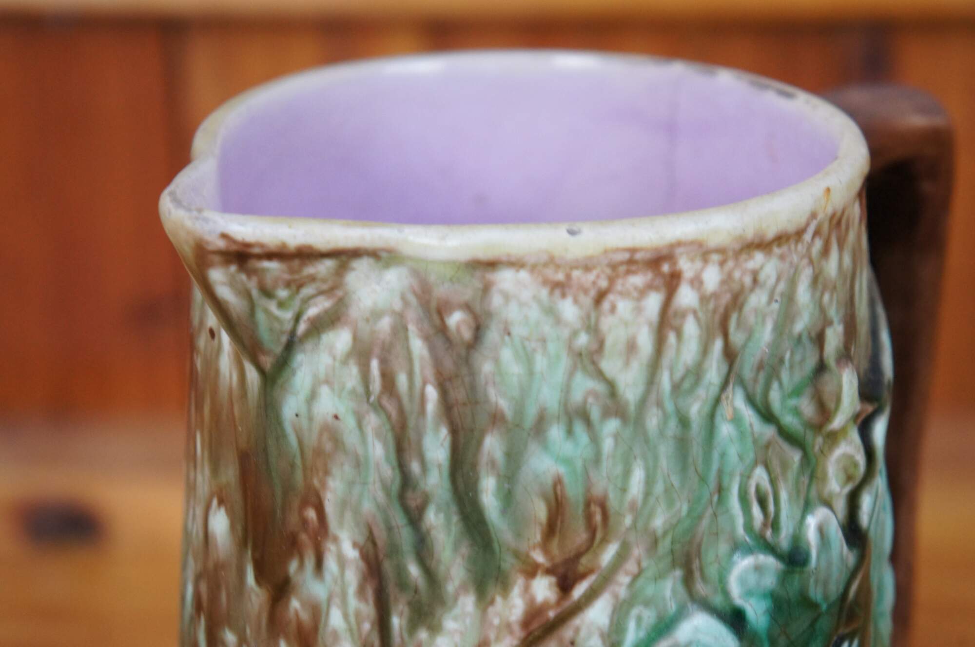 Antique Majolica creamer pitcher / jug featuring a tree bark, oak leaf and acorn nut theme with branch handle, purple lavender interior.