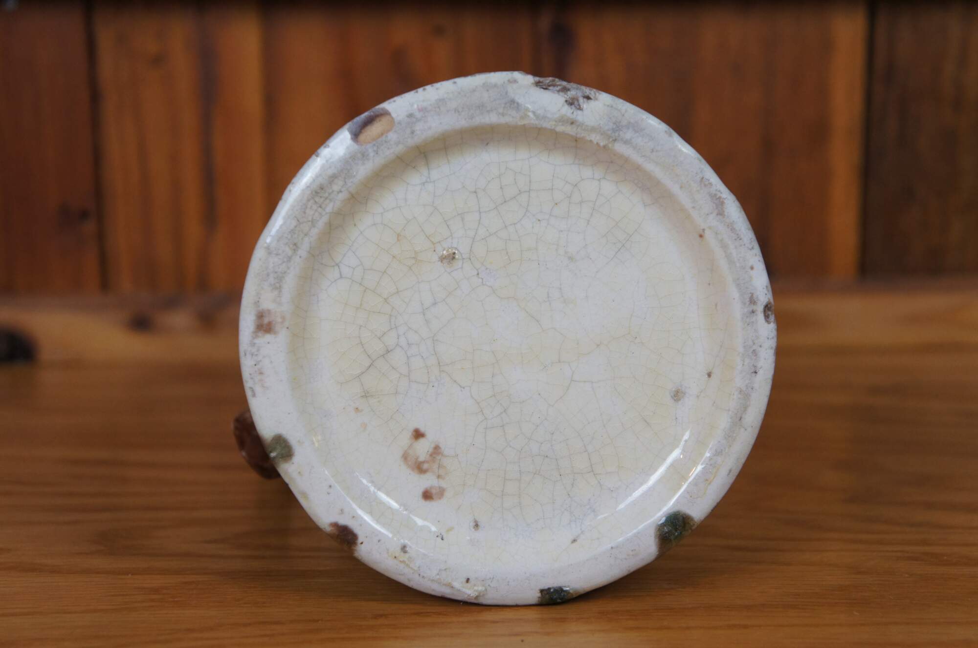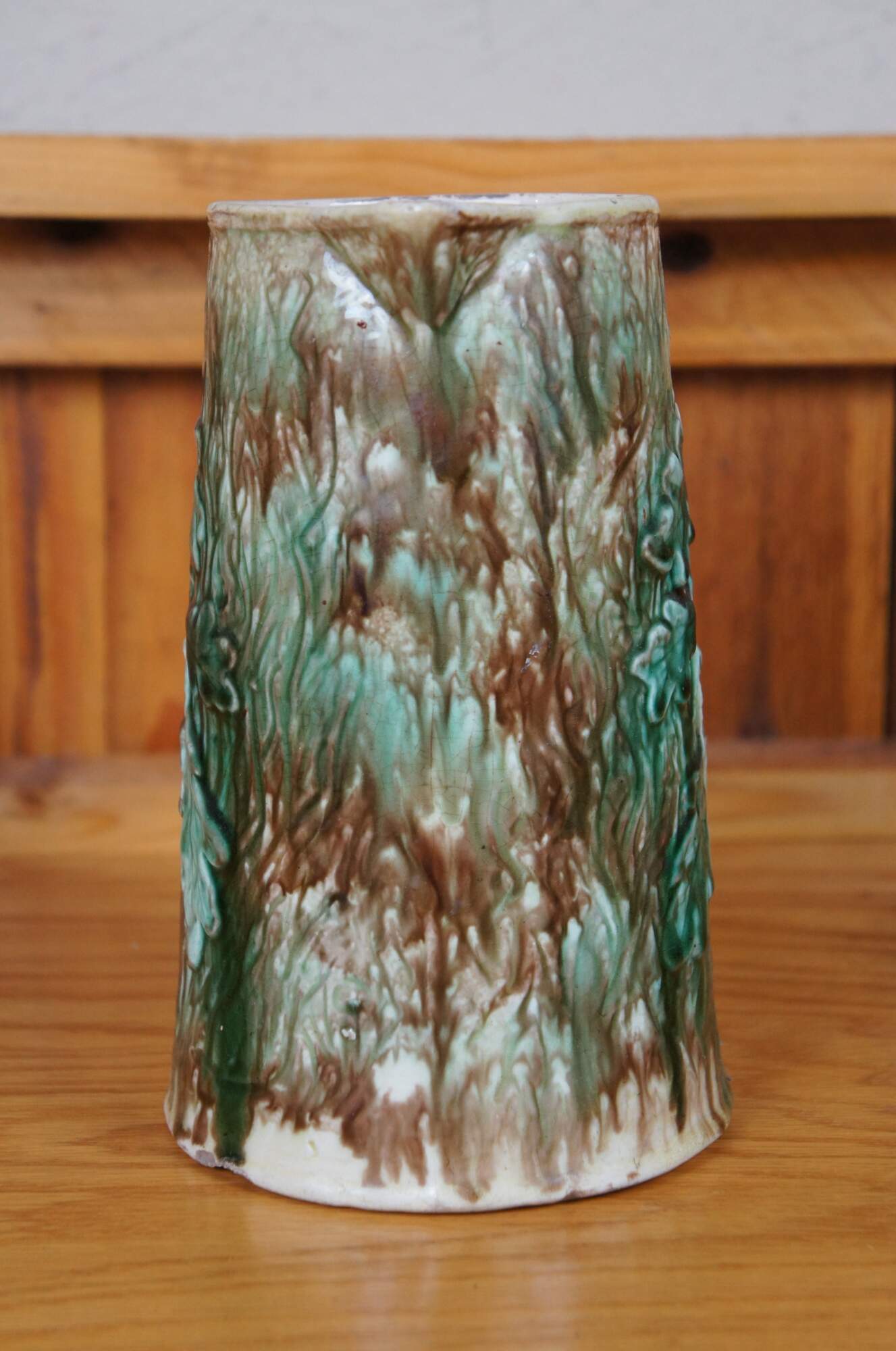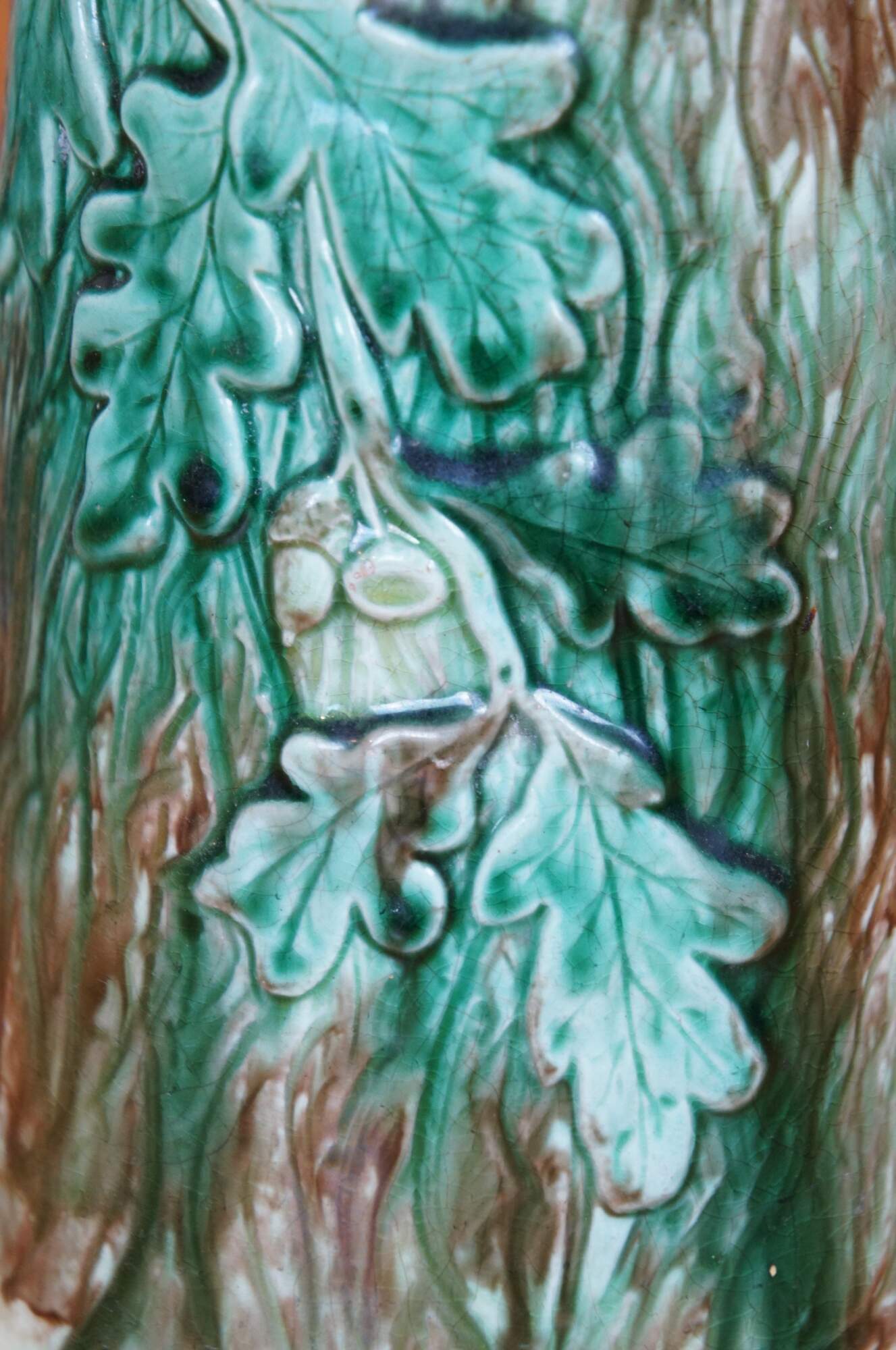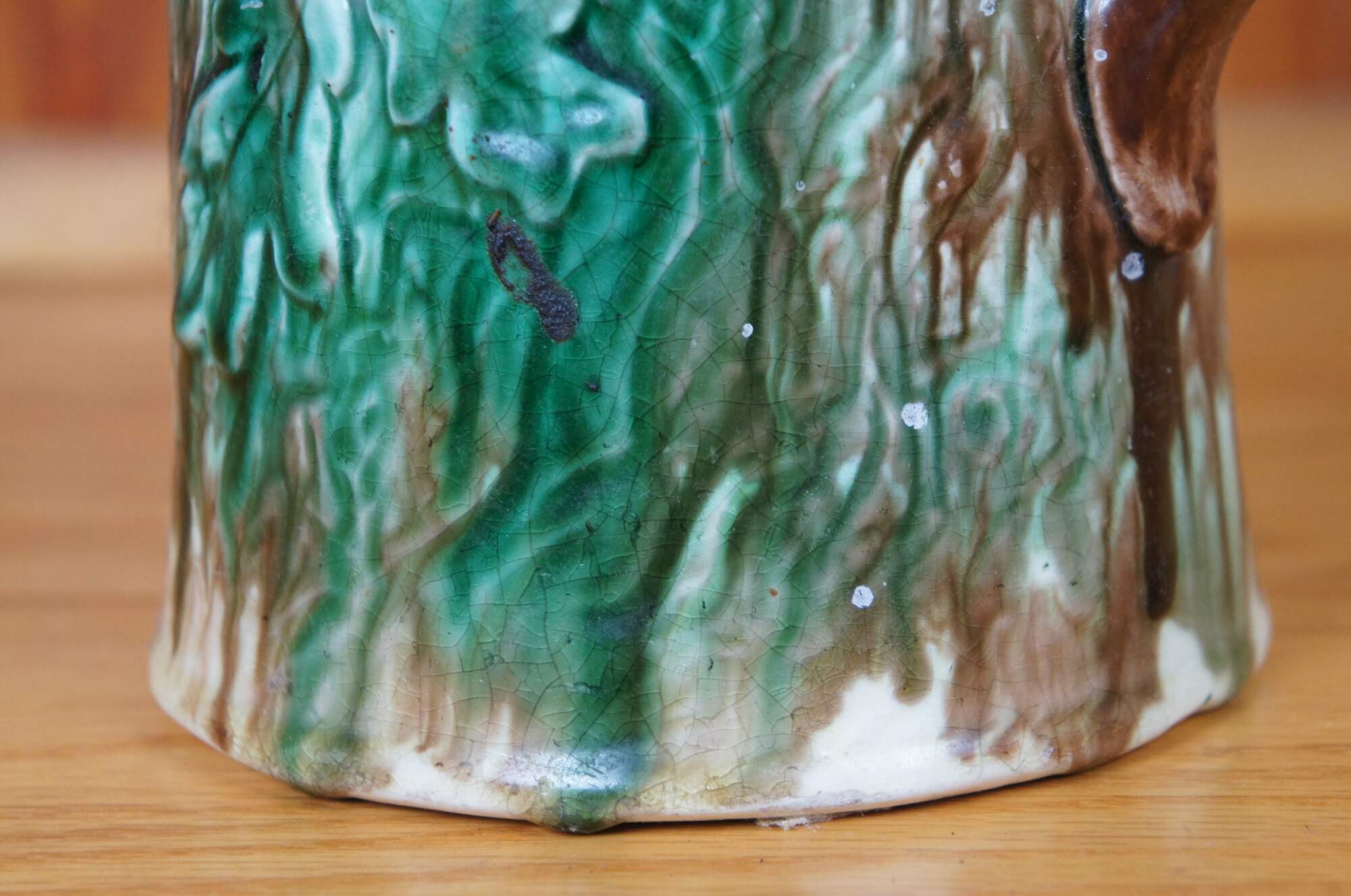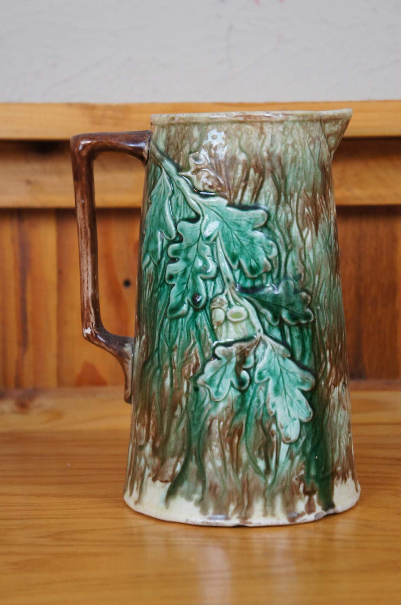 Antique Majolica creamer pitcher / jug featuring a tree bark, oak leaf and acorn nut theme with branch handle, purple lavender interior.