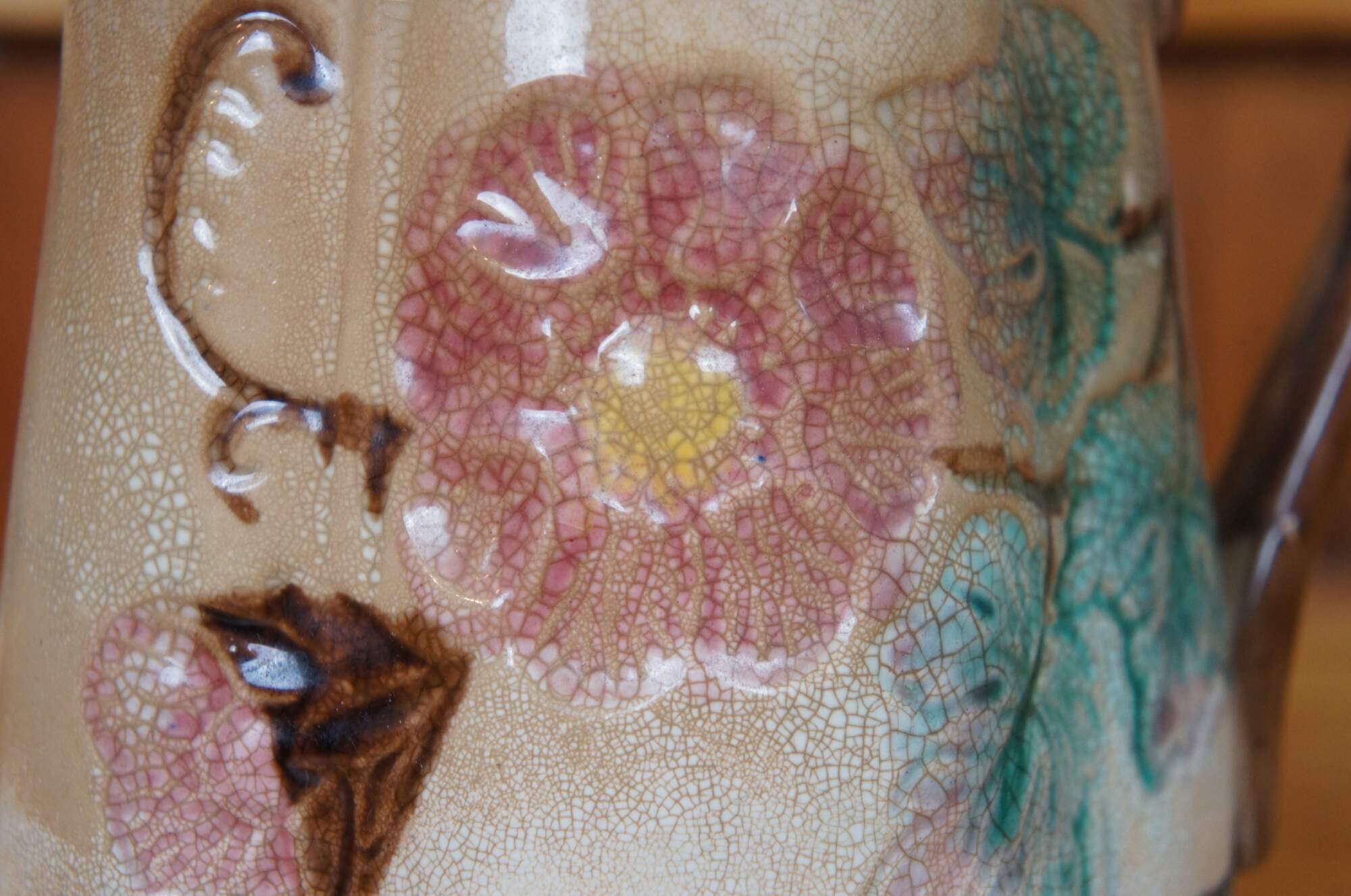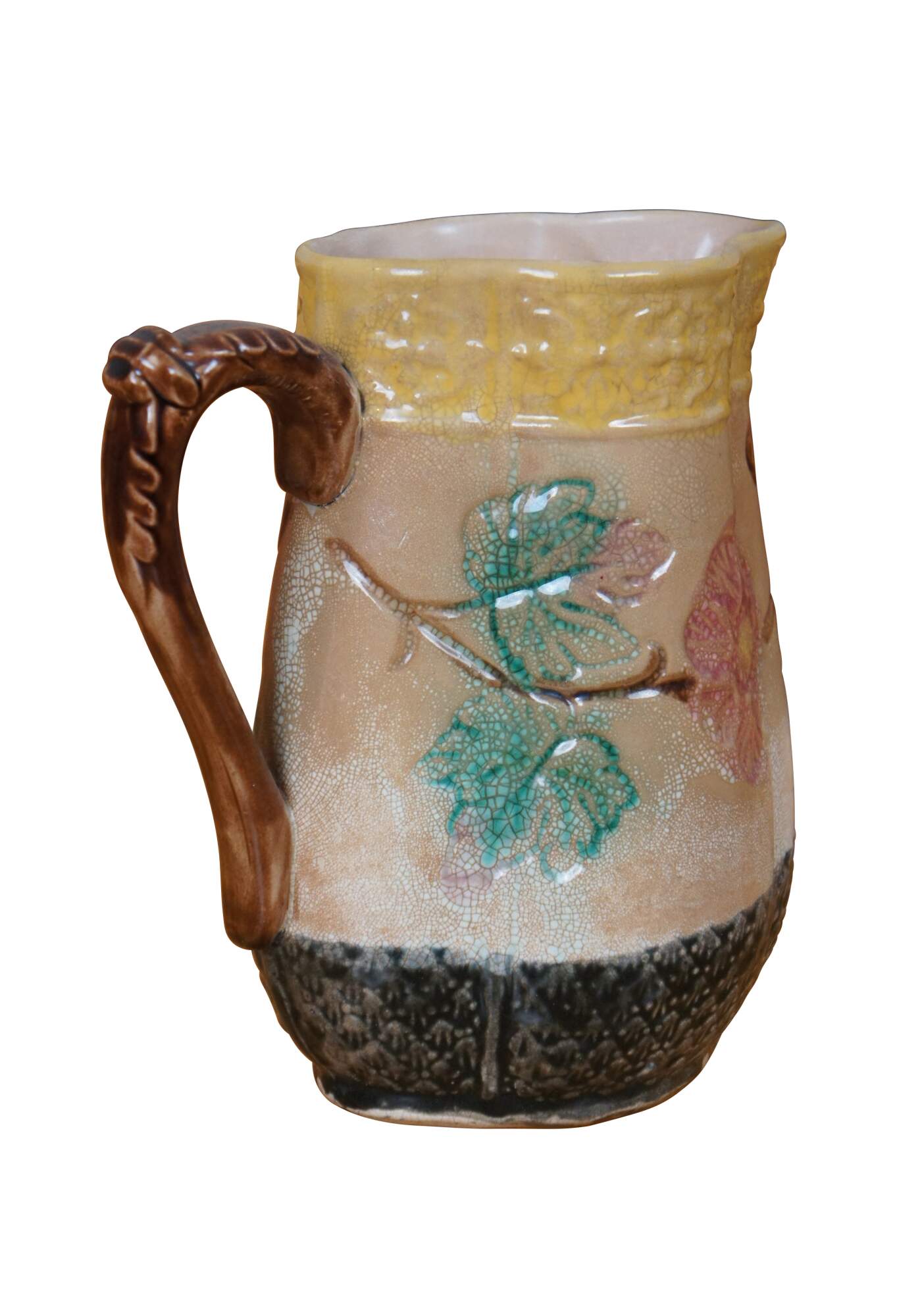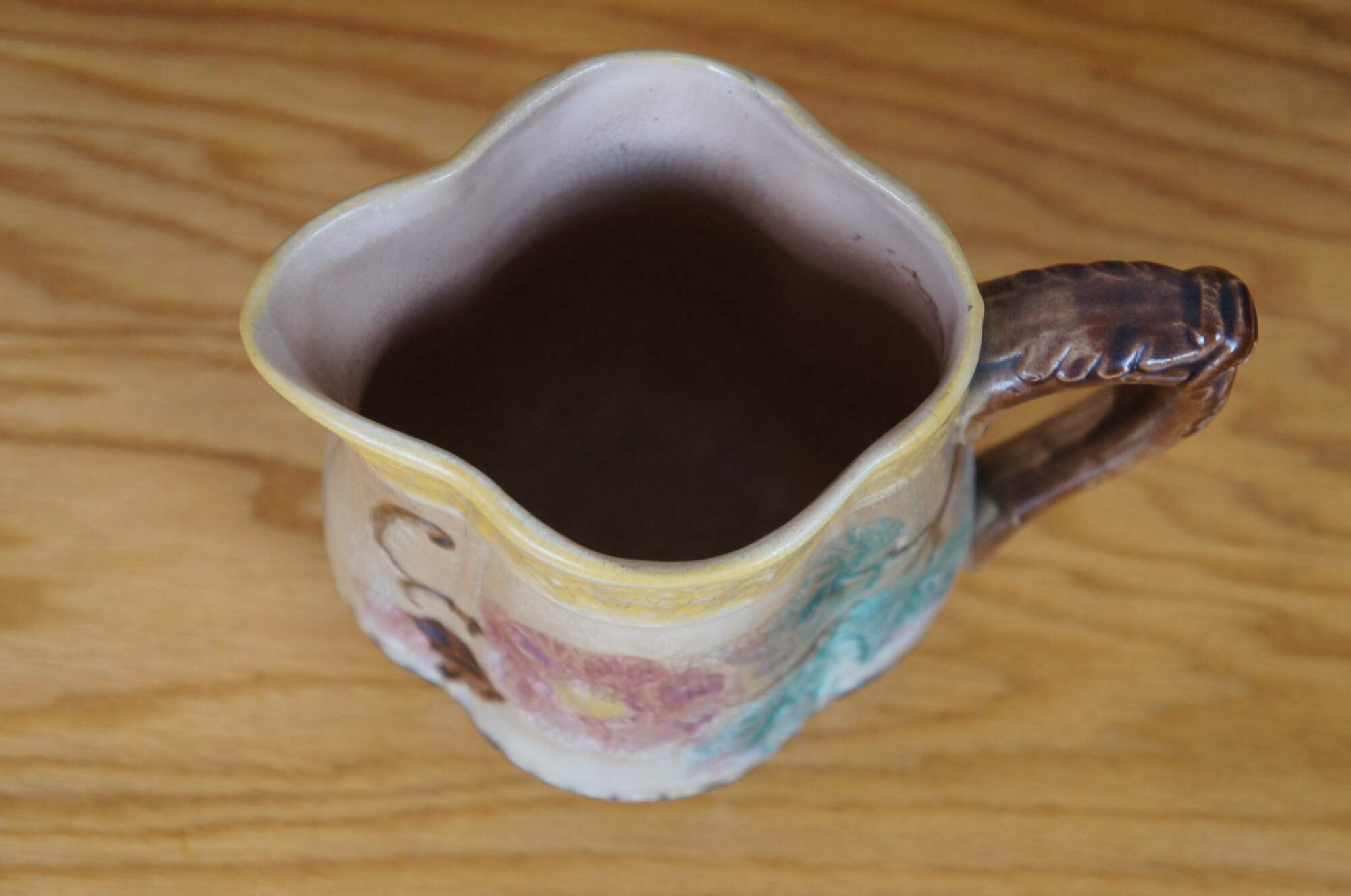 Antique Majolica creamer pitcher / jug featuring quatrefoil form with floral cherry blossom / dogwood theme and acanthus handle.