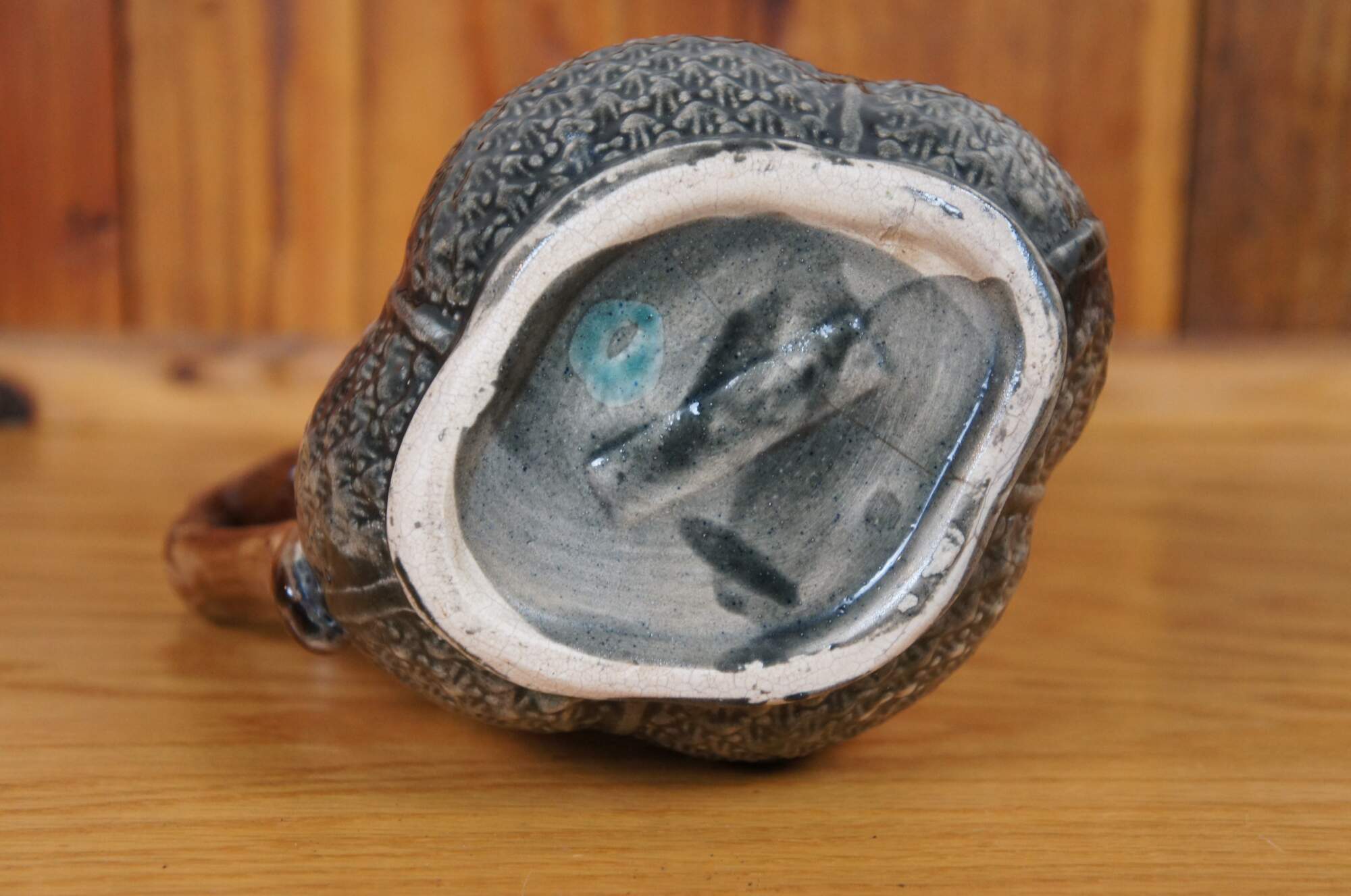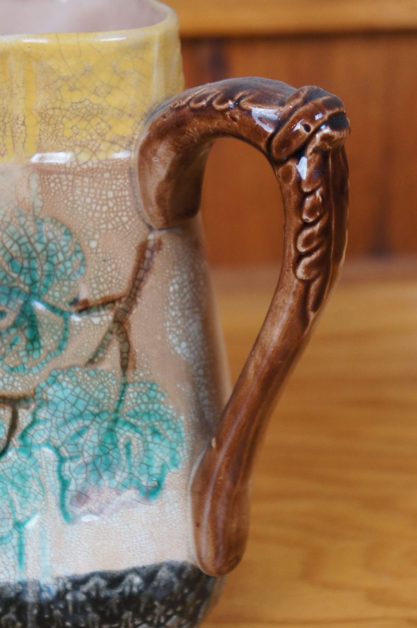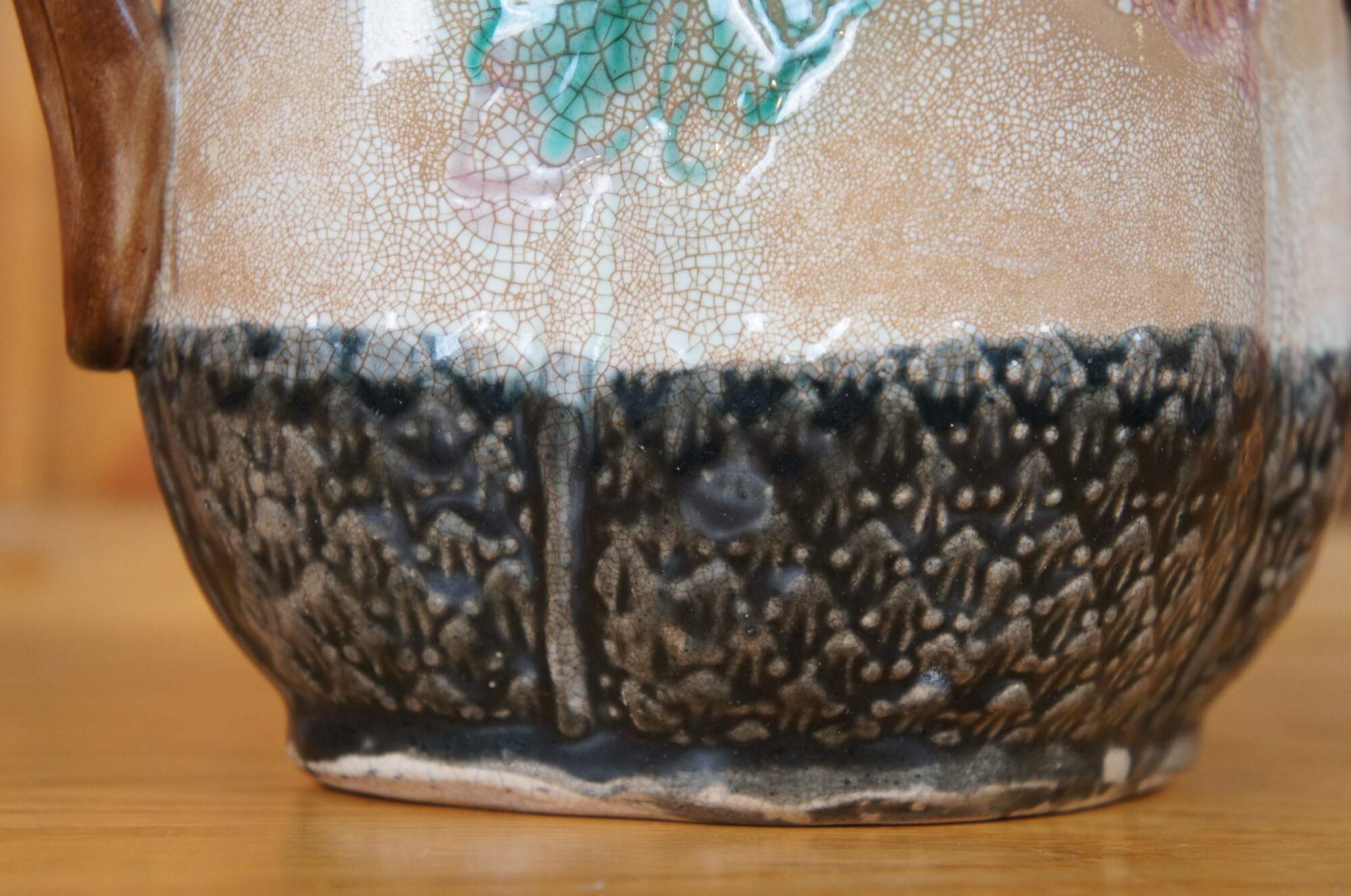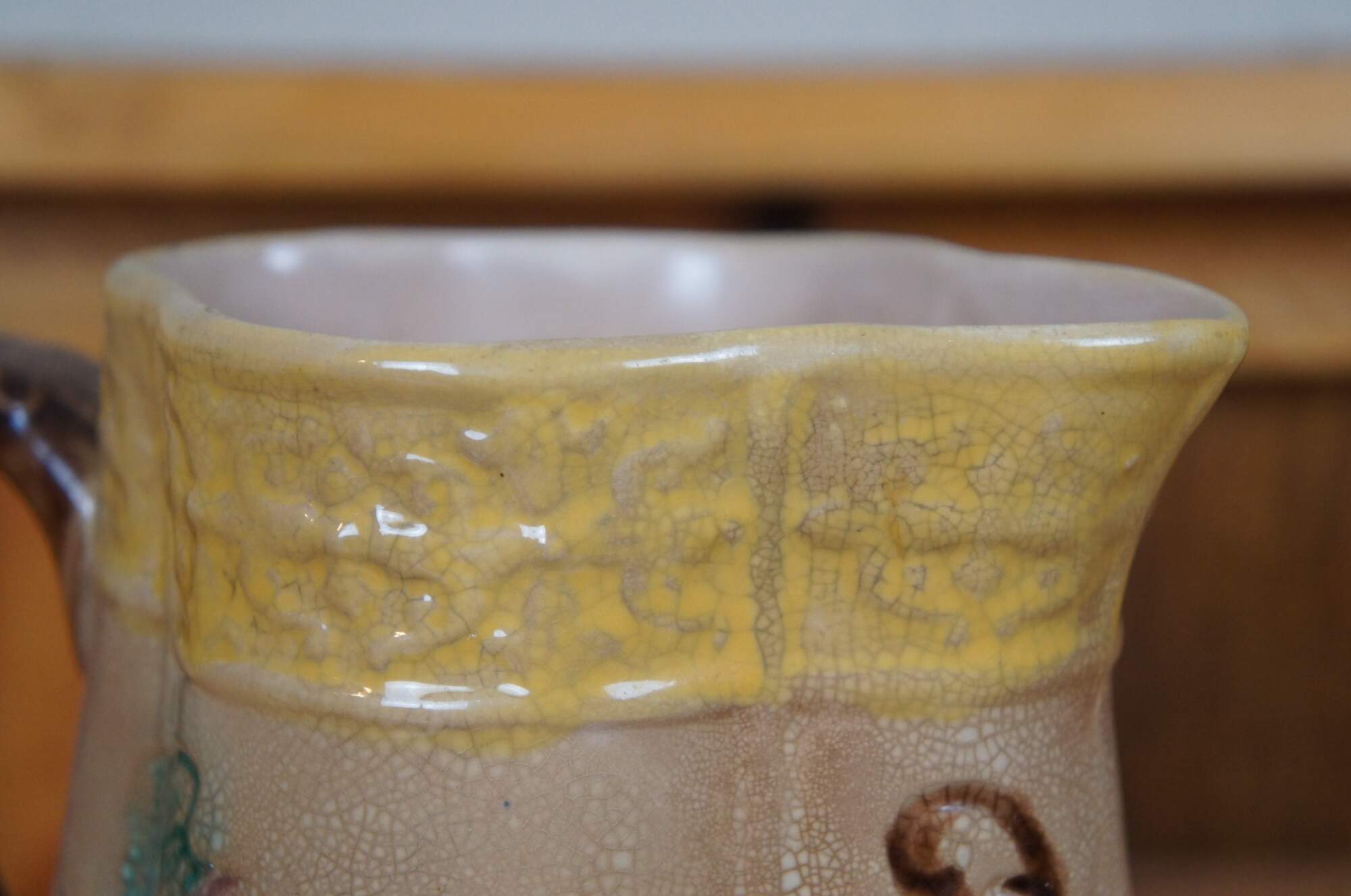 Antique Majolica creamer pitcher / jug featuring quatrefoil form with floral cherry blossom / dogwood theme and acanthus handle.