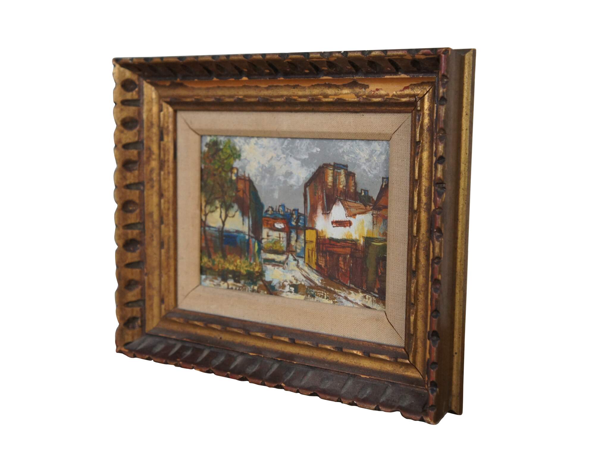 Vintage impressionist cityscape oil painting on board showing a semi-abstracted, brightly colored industrial city street. Obscured signature along lower edge. Carved giltwood frame; beige linen mat.