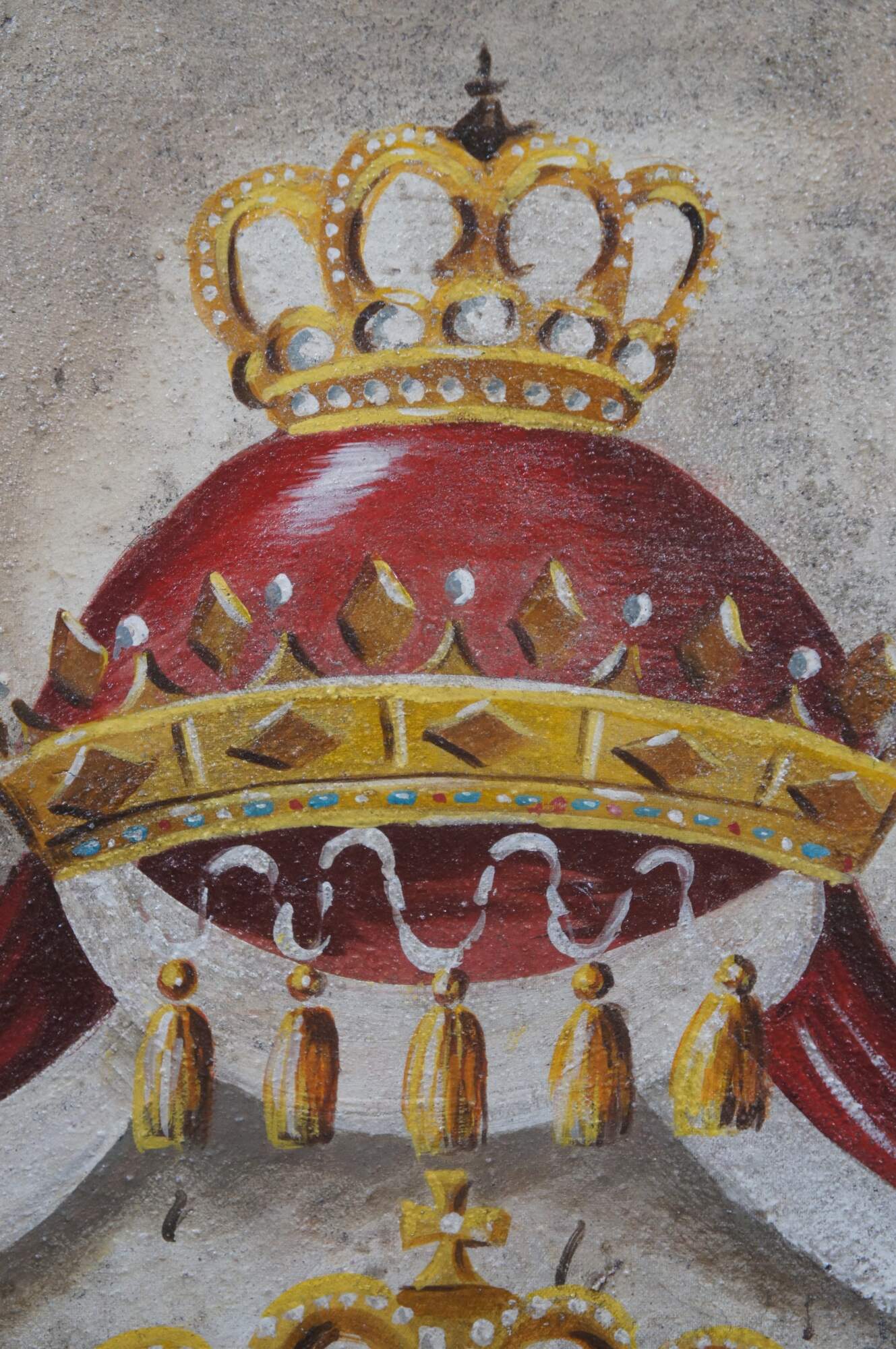 Late 20th century Kingdom of Bavaria stemma / coat of arms / heraldic crest oil painting on canvas. Antiqued coloration. Beveled wood frame. Produced by Artigianato Artistico Italiano (Handicrafts in Italy) and the Trevor James Company.