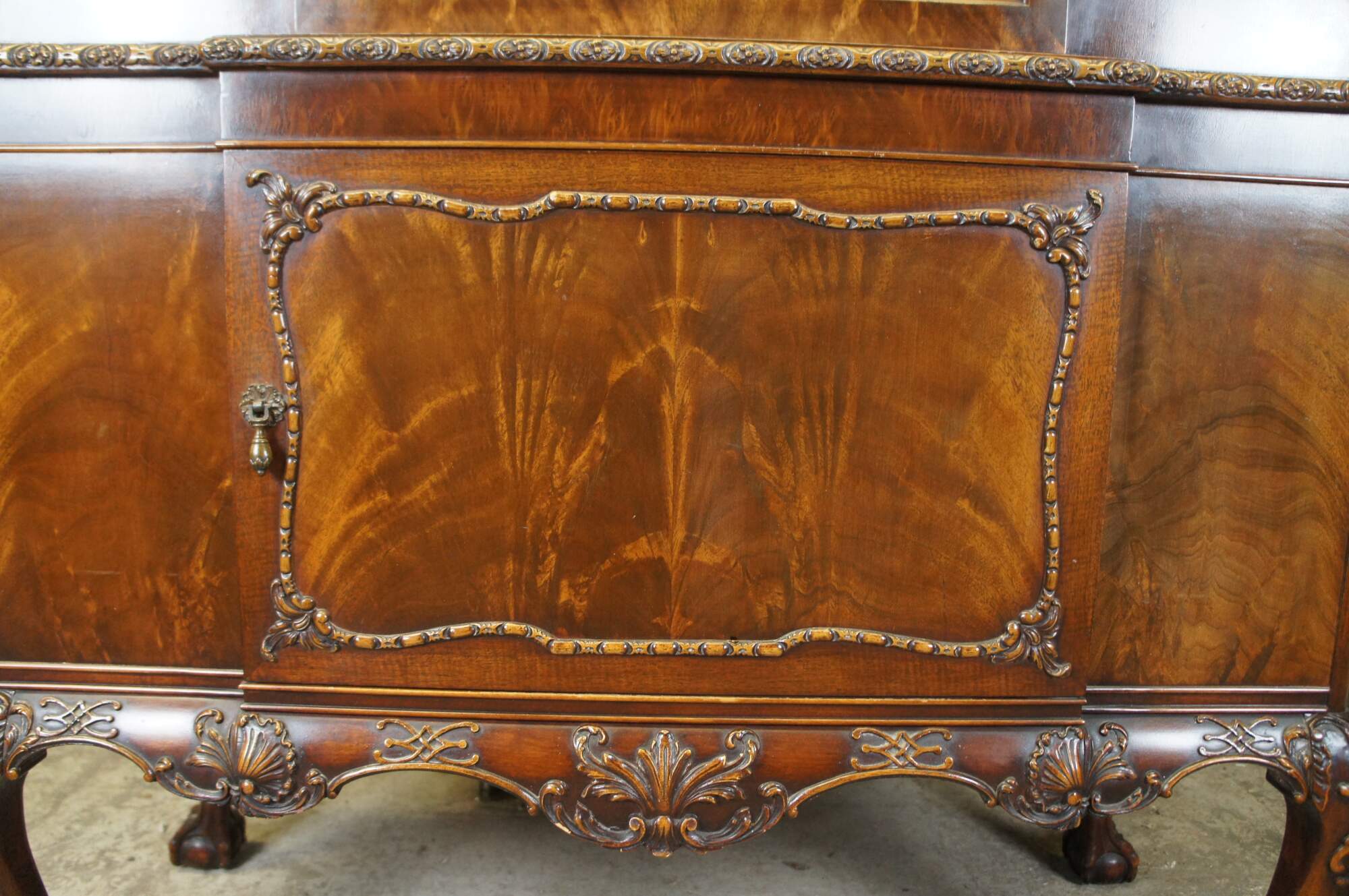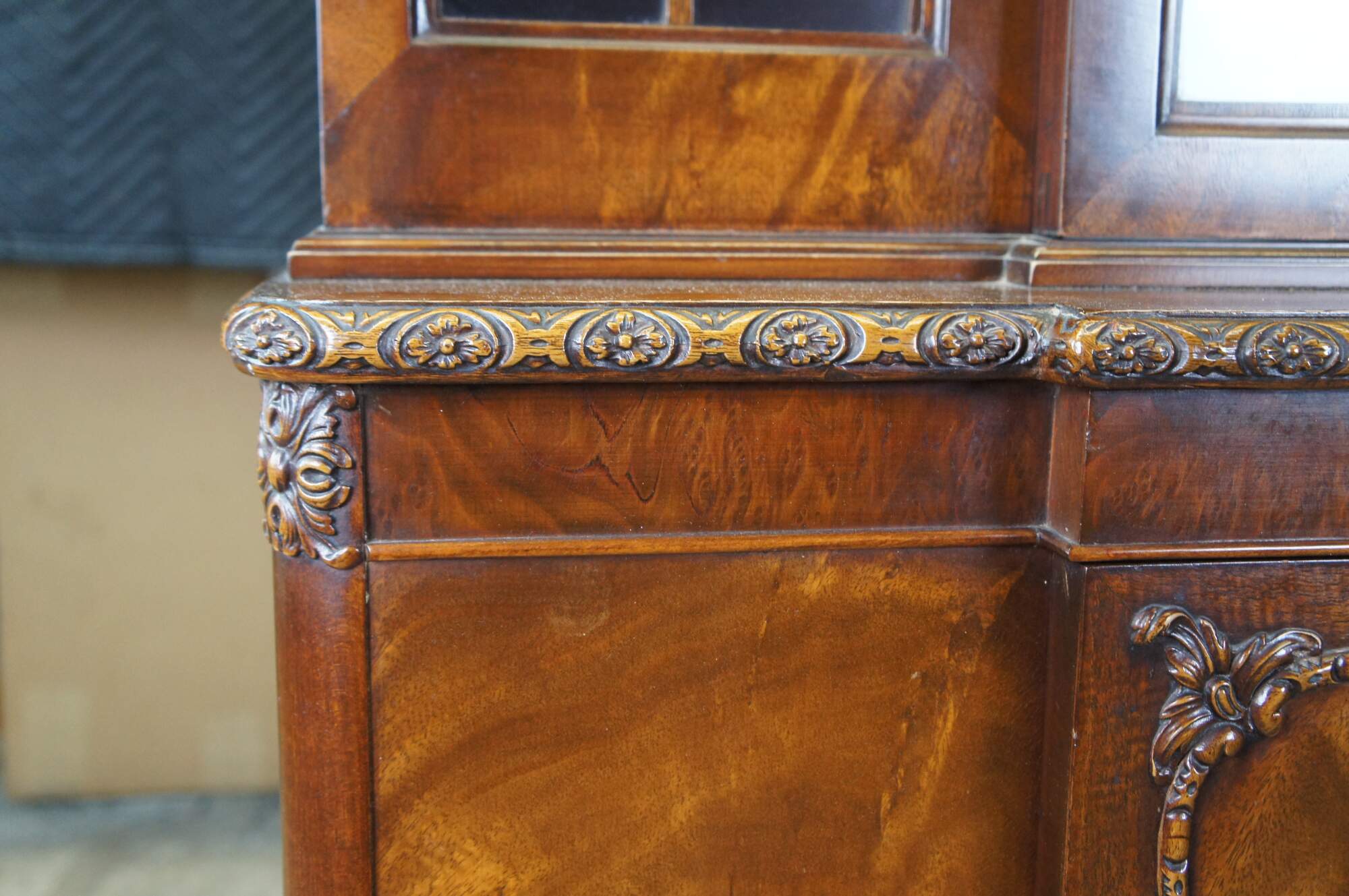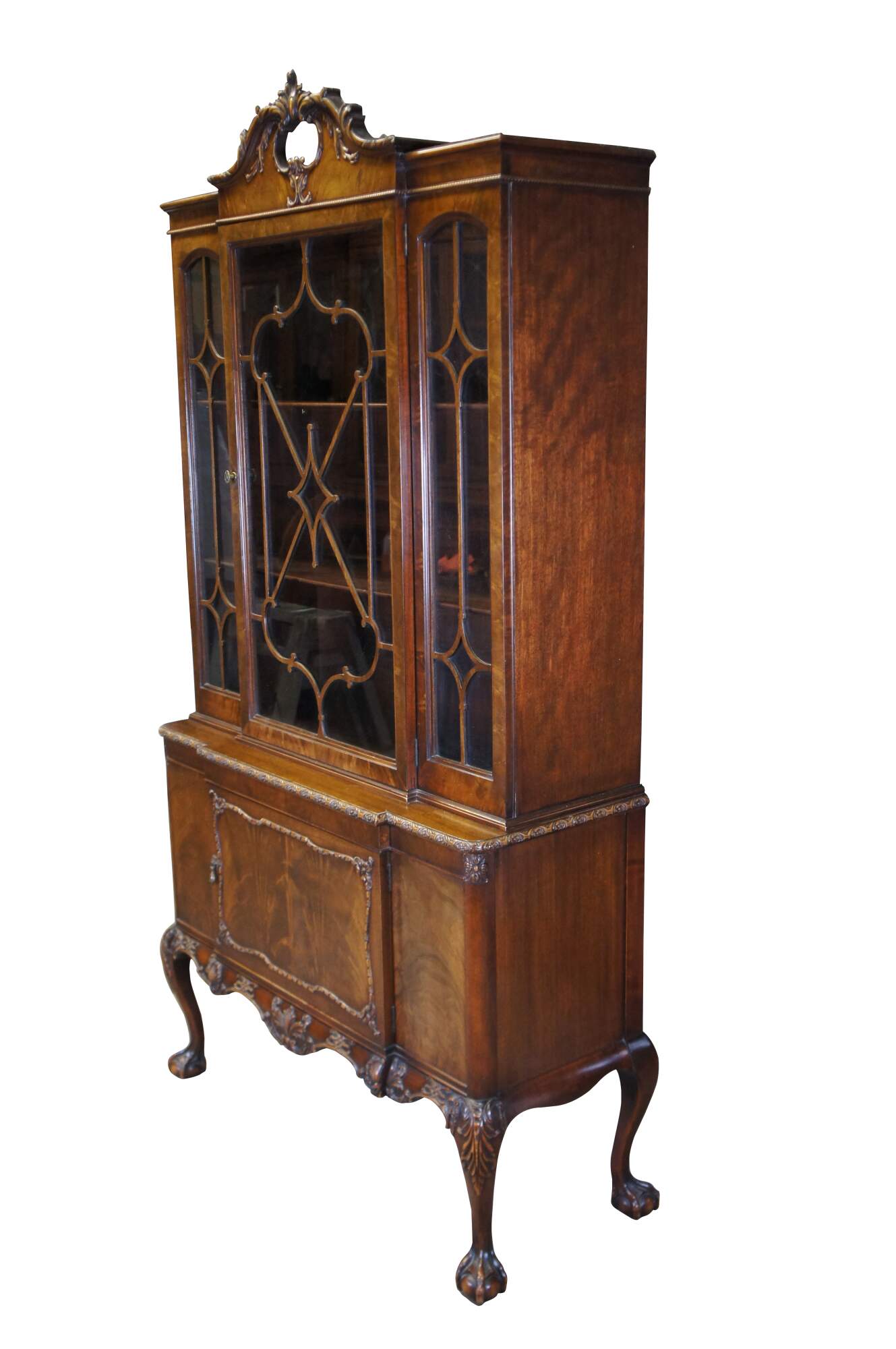 Early 20th Century English Chippendale / Georgian style China Hutch / Curio / Display Cabinet by Romweber Industries. Circa 1920s. Made from crotch mahogany with a graceful breakfront form featuring carved and scalloped aprons. The cabinet is supported by cabriole legs with acanthus carved knees over ball and claw feet. Upper hutch has two shelves with plate grooves while lower buffet portion opens to a large area for storage of china or collectibles. The crown showcases an oppen cartouche with foliate and canthus carved detail.