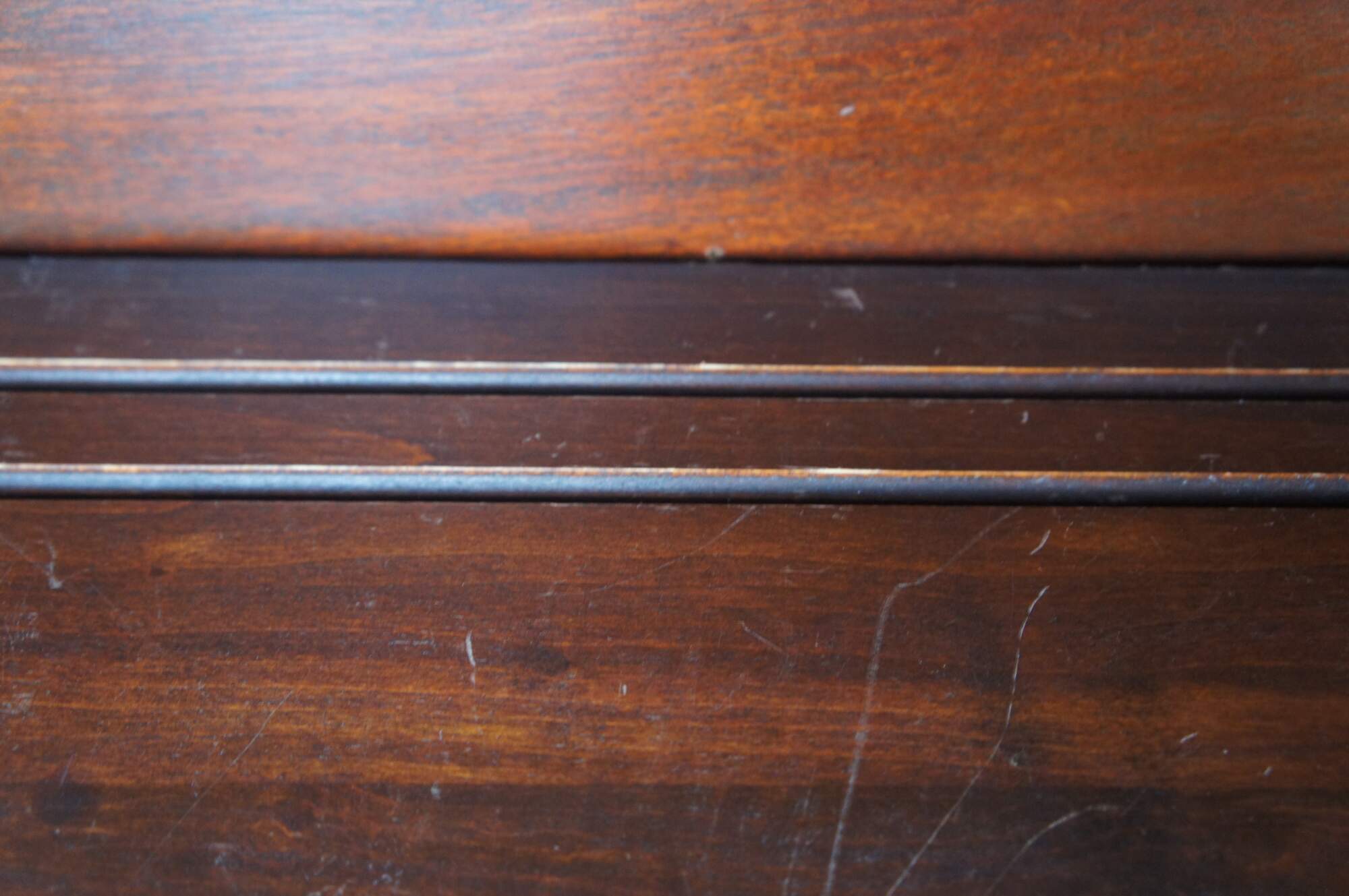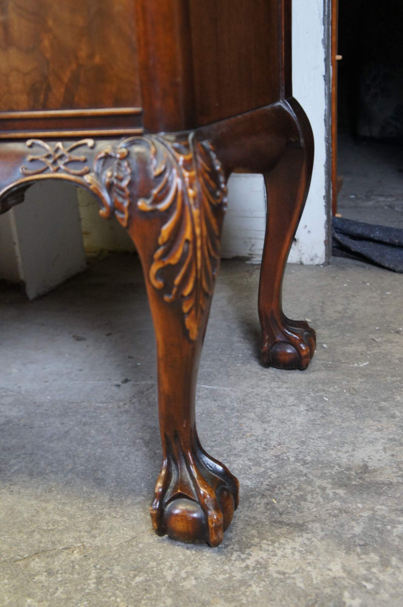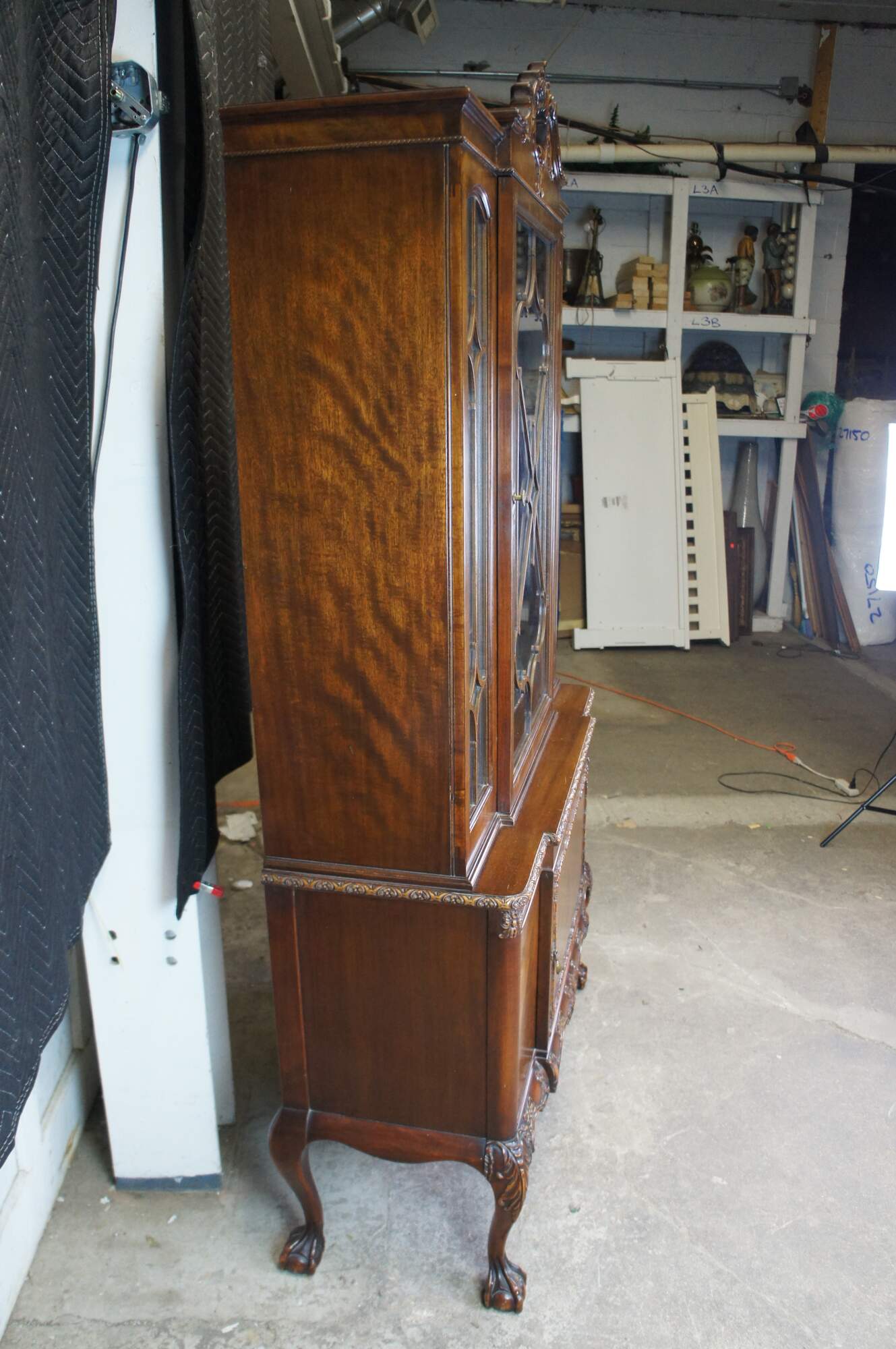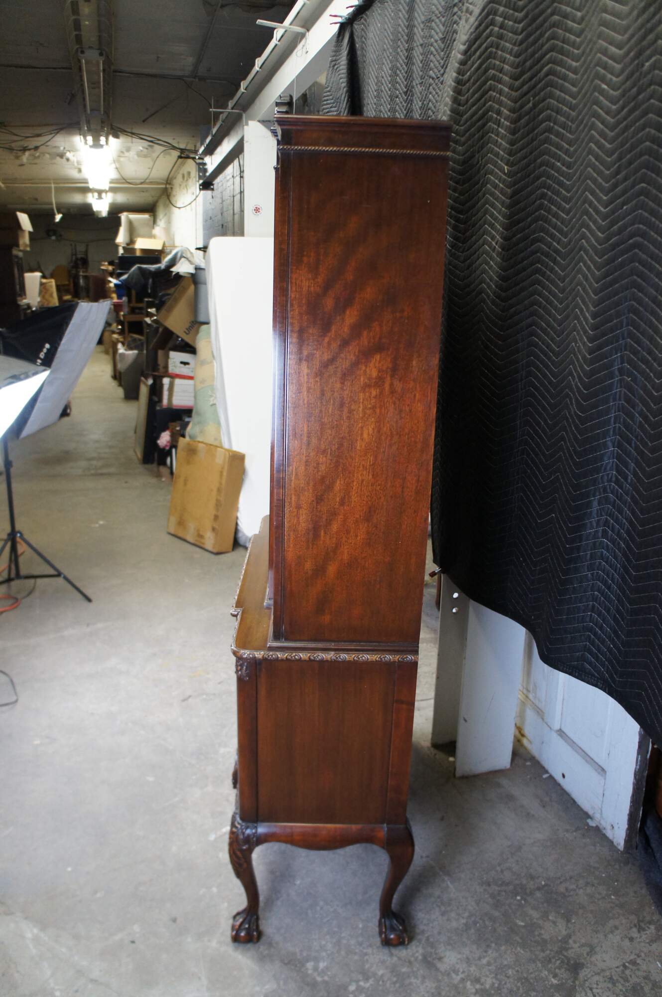 Early 20th Century English Chippendale / Georgian style China Hutch / Curio / Display Cabinet by Romweber Industries. Circa 1920s. Made from crotch mahogany with a graceful breakfront form featuring carved and scalloped aprons. The cabinet is supported by cabriole legs with acanthus carved knees over ball and claw feet. Upper hutch has two shelves with plate grooves while lower buffet portion opens to a large area for storage of china or collectibles. The crown showcases an oppen cartouche with foliate and canthus carved detail.