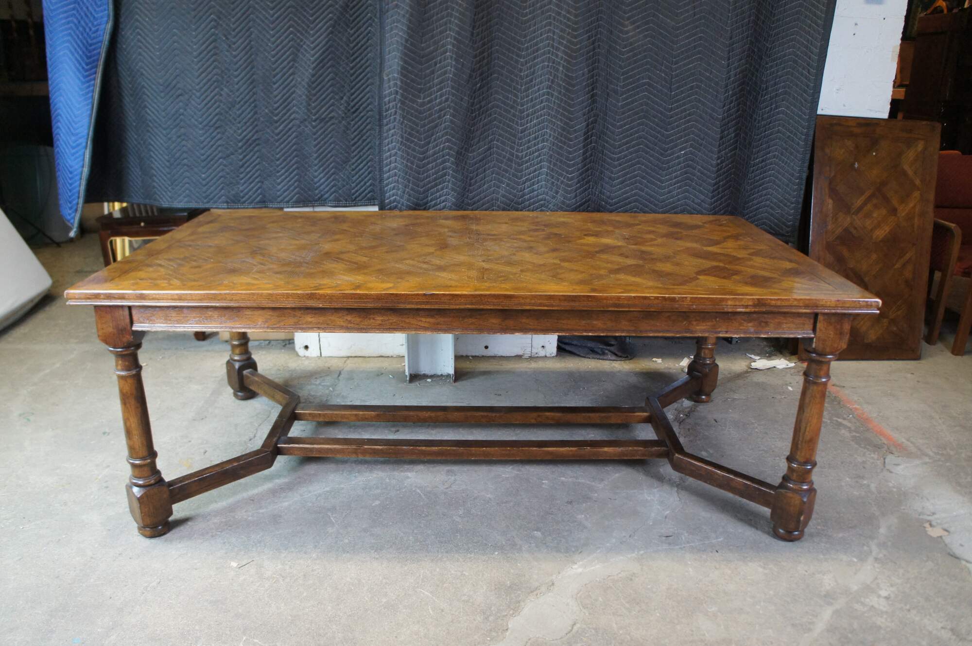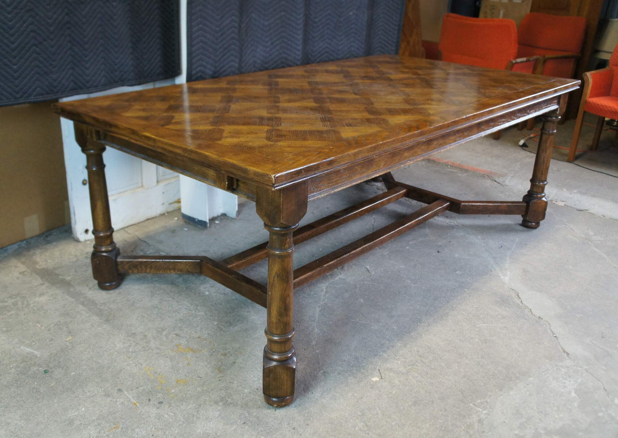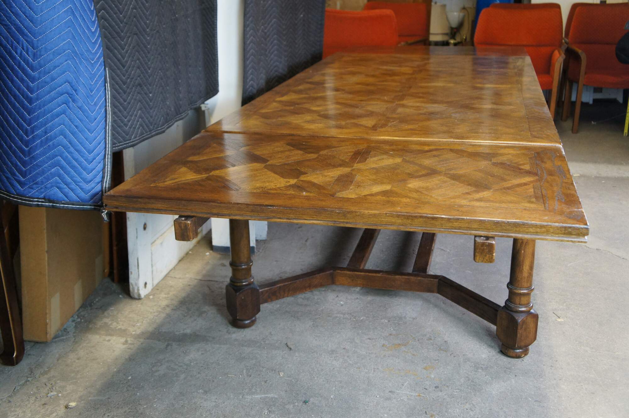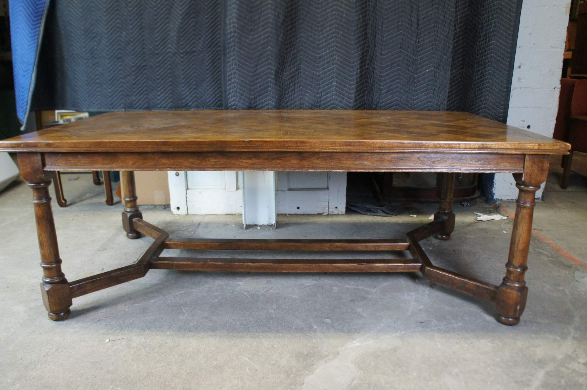 Monumental Vintage English 17th Century Style / William & Mary style refectory farmhouse dining table, circa 1960s. Features a rectangular form made from oak with a beautiful parquetry top over turned legs with blocked bun feet connected by a trestle base. The table extends via a draw leaf style mechanish allowing for placement of two large leaves and extension to 11 feet. Great for use in a large dining setting or as an office conference room table. The tables large stature and length makes it unparalleled to other examples.