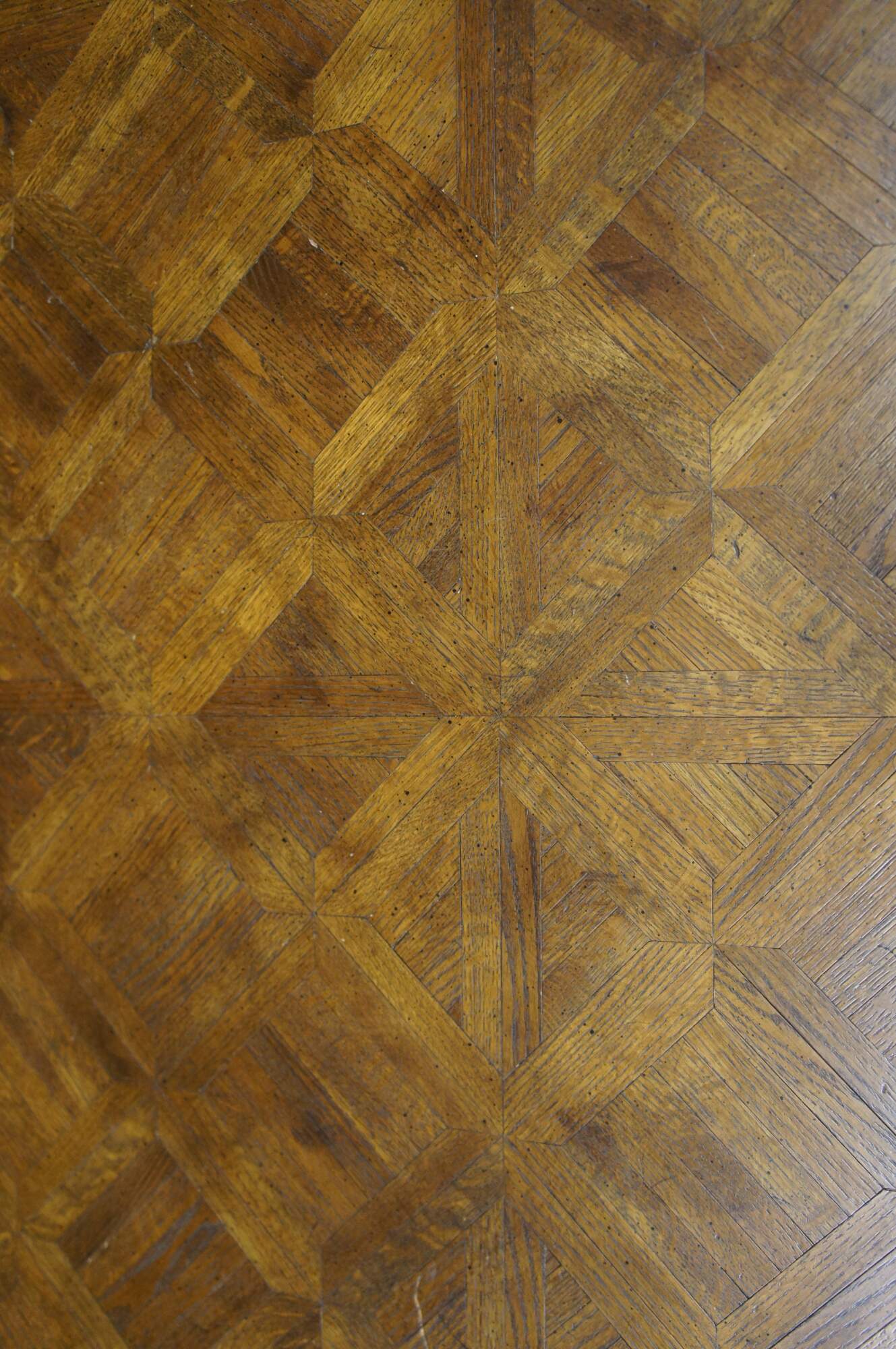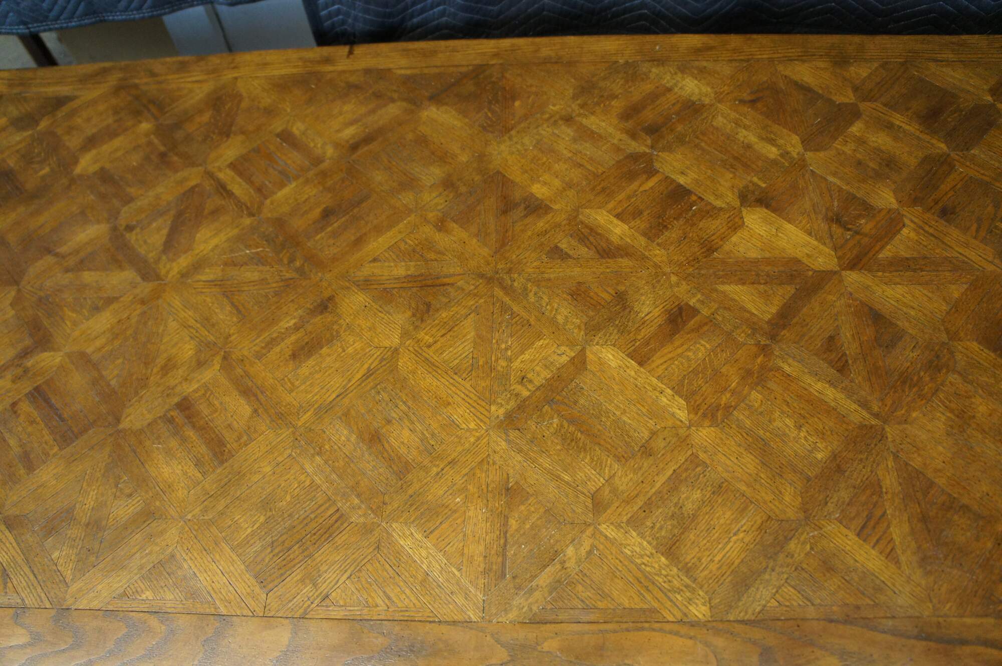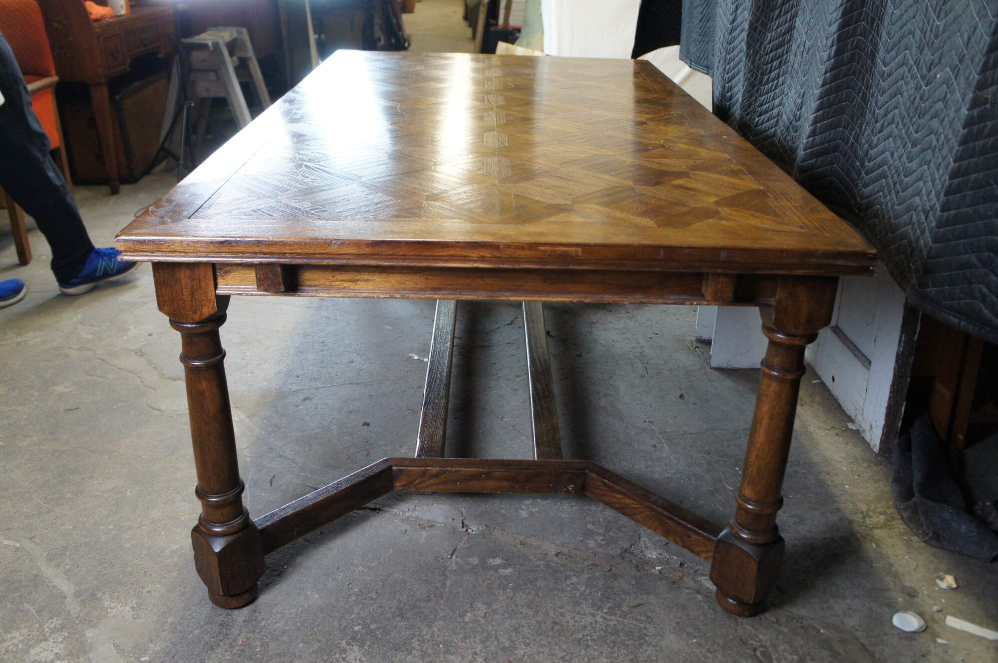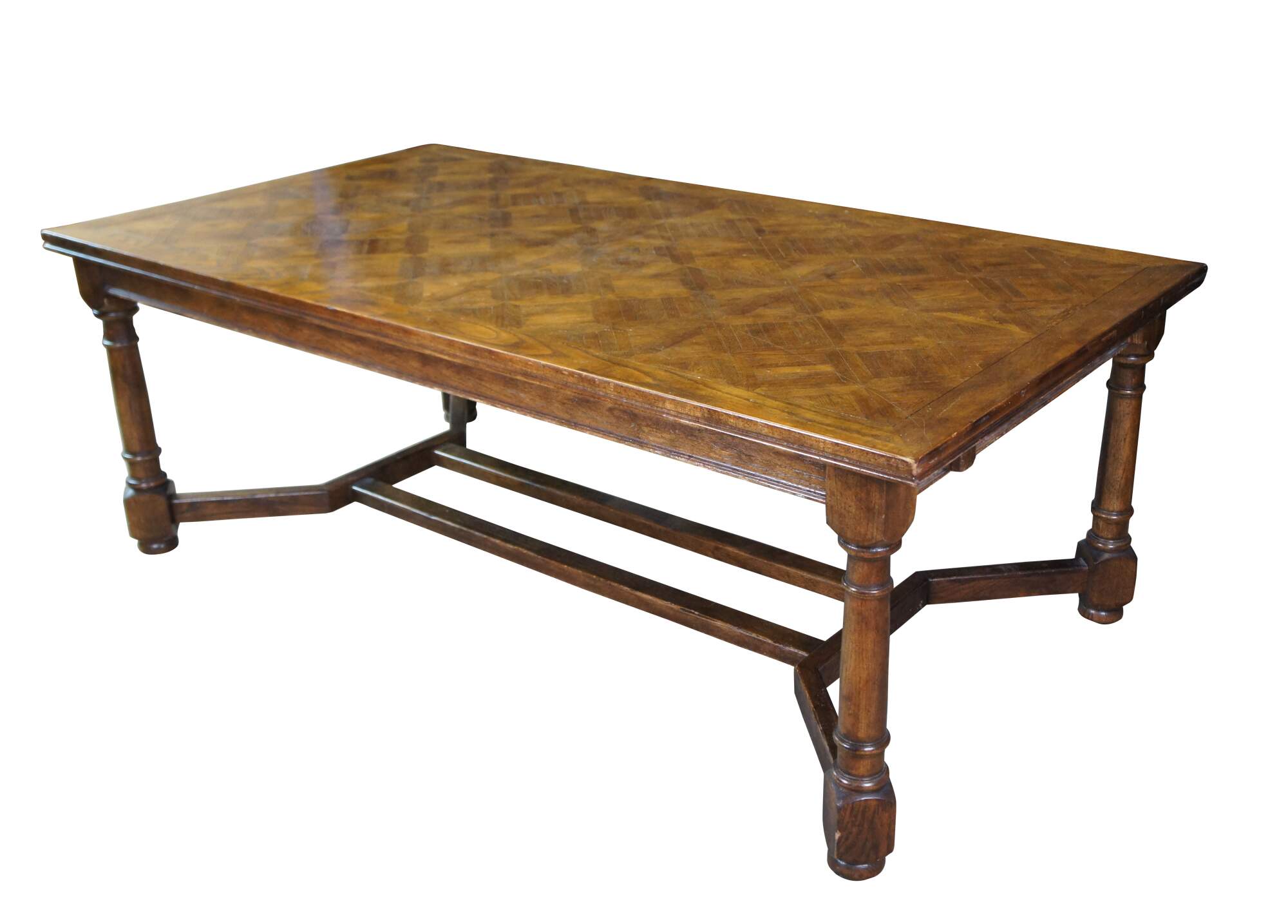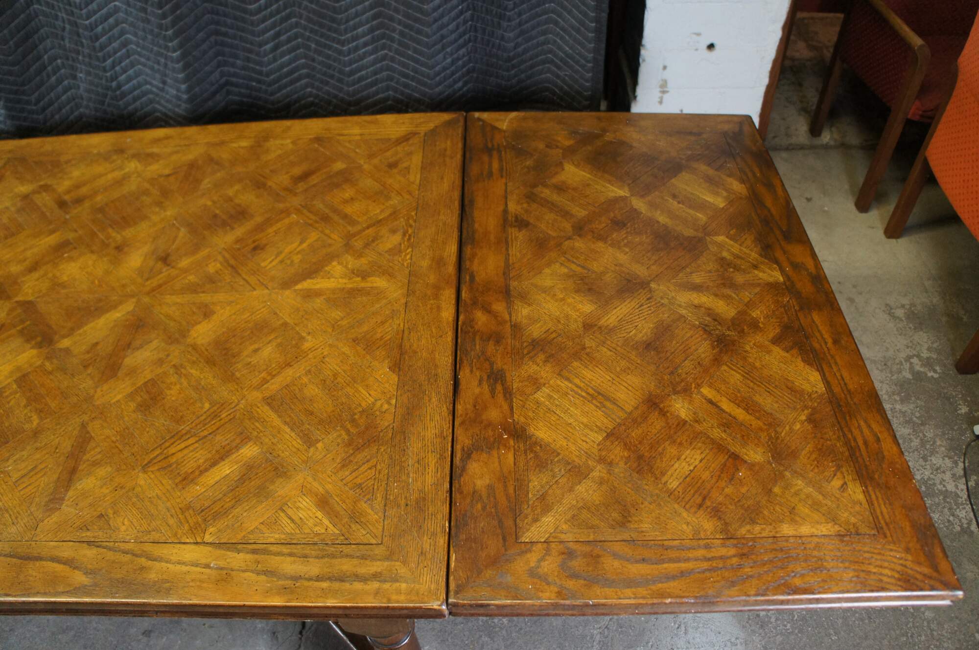 Monumental Vintage English 17th Century Style / William & Mary style refectory farmhouse dining table, circa 1960s. Features a rectangular form made from oak with a beautiful parquetry top over turned legs with blocked bun feet connected by a trestle base. The table extends via a draw leaf style mechanish allowing for placement of two large leaves and extension to 11 feet. Great for use in a large dining setting or as an office conference room table. The tables large stature and length makes it unparalleled to other examples.