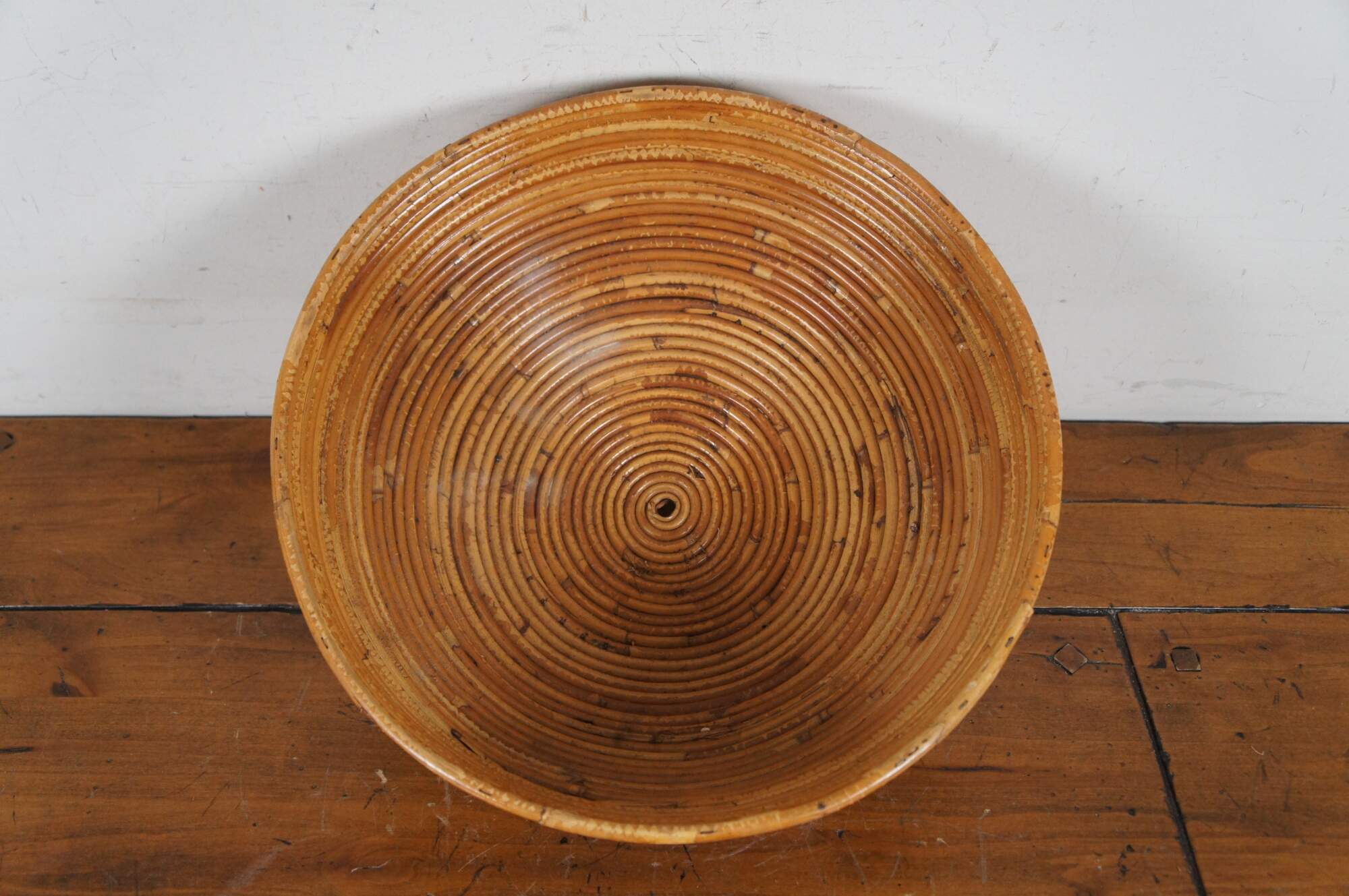 Very nice example of a large Italian mid-century modern pencil reed farmhouse centerpiece bowl or planter. Made of tightly coiled stalks of bamboo, rattan, or reed with a lightly distressed two-tone finish.