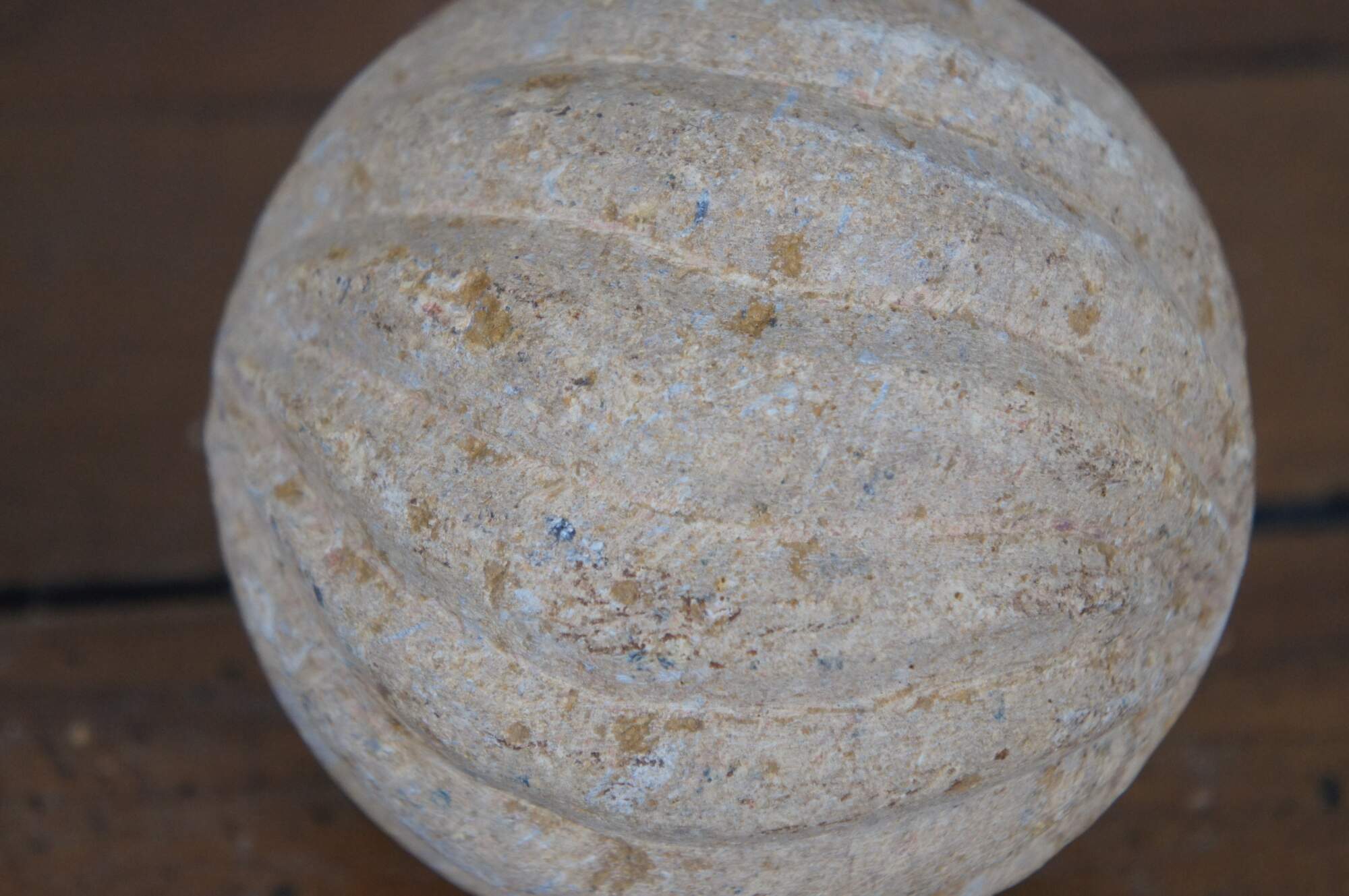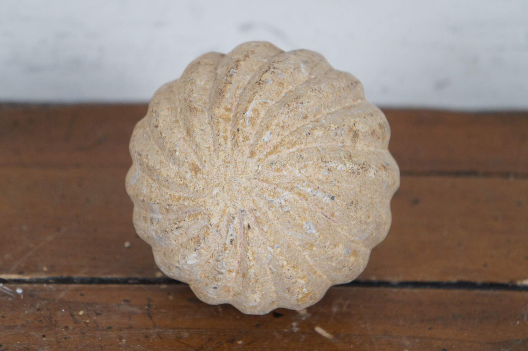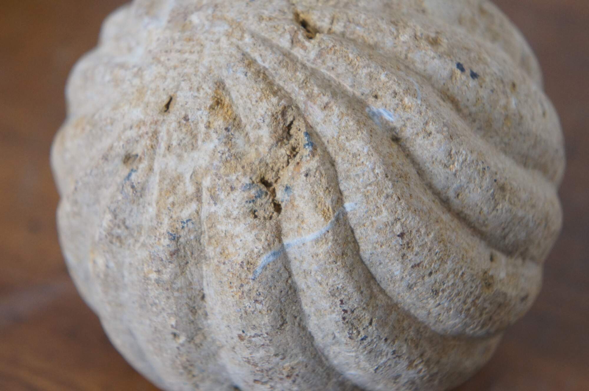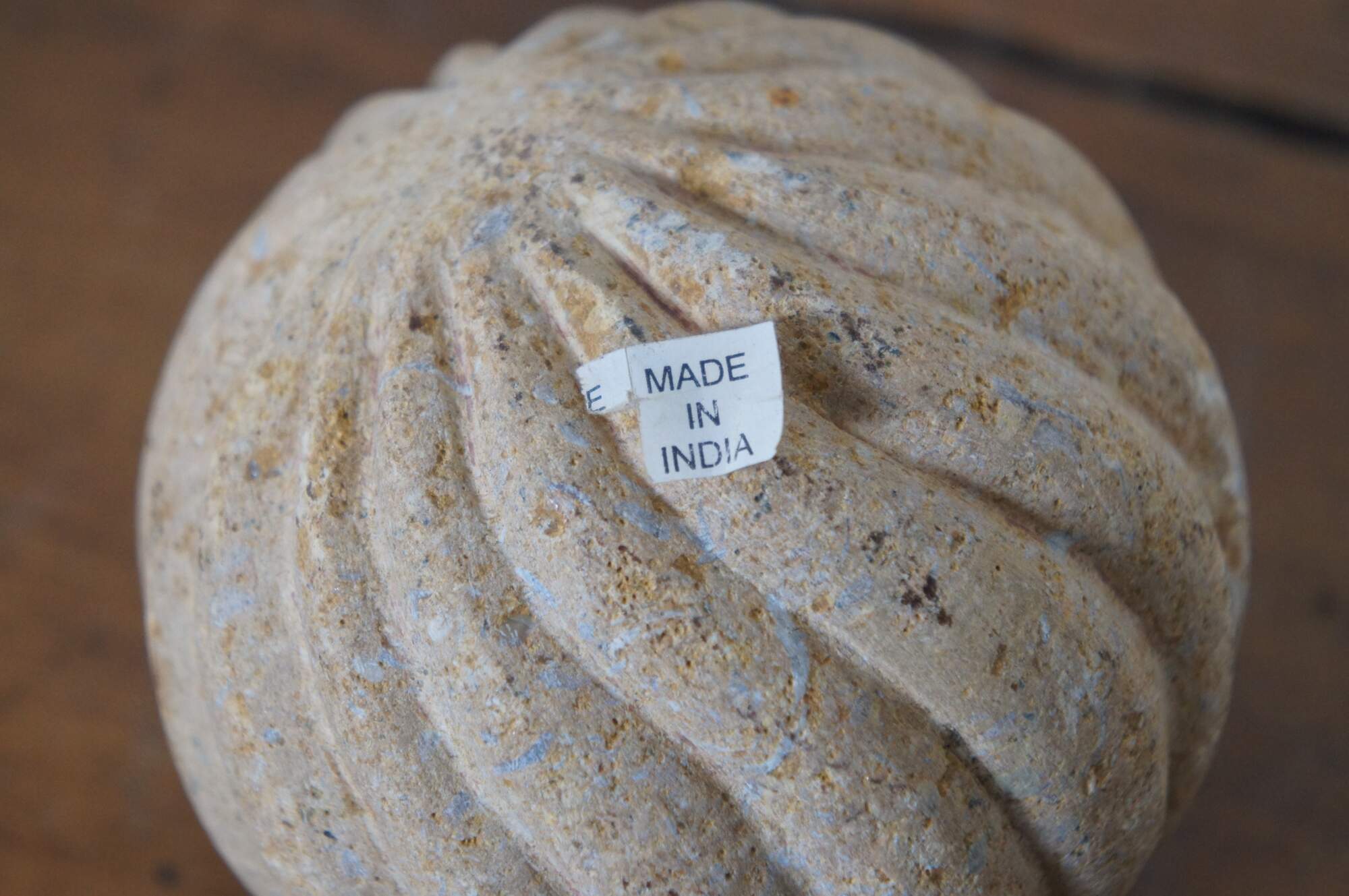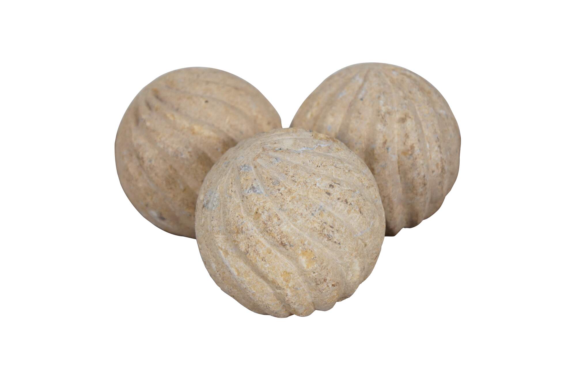 Set of three decorative, unpolished light brown stone balls / spheres / orbs, carved with slightly swirling ridges. Garden, Paperweight.