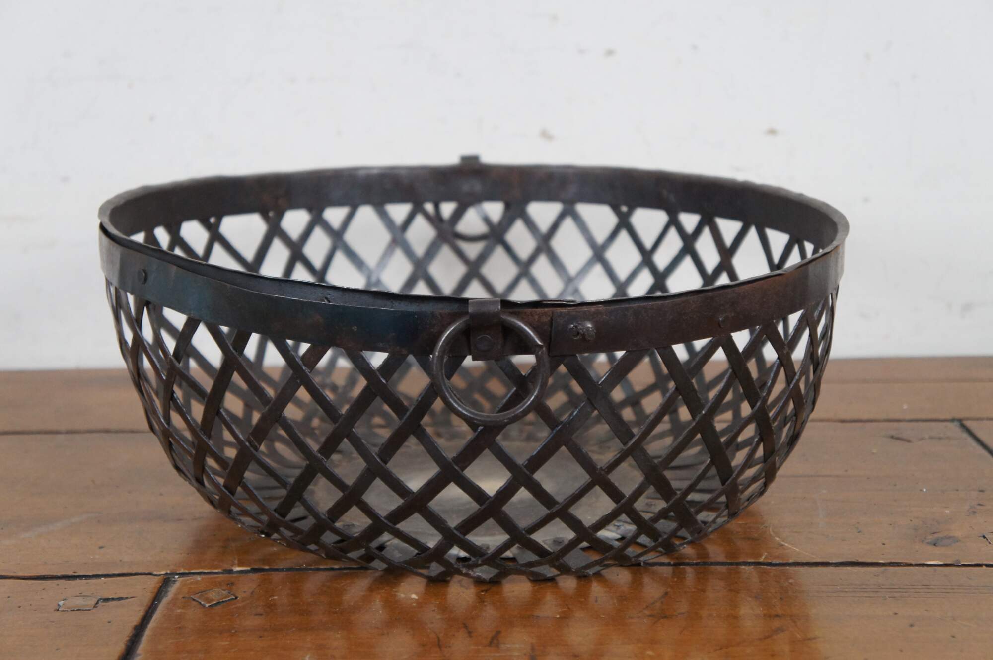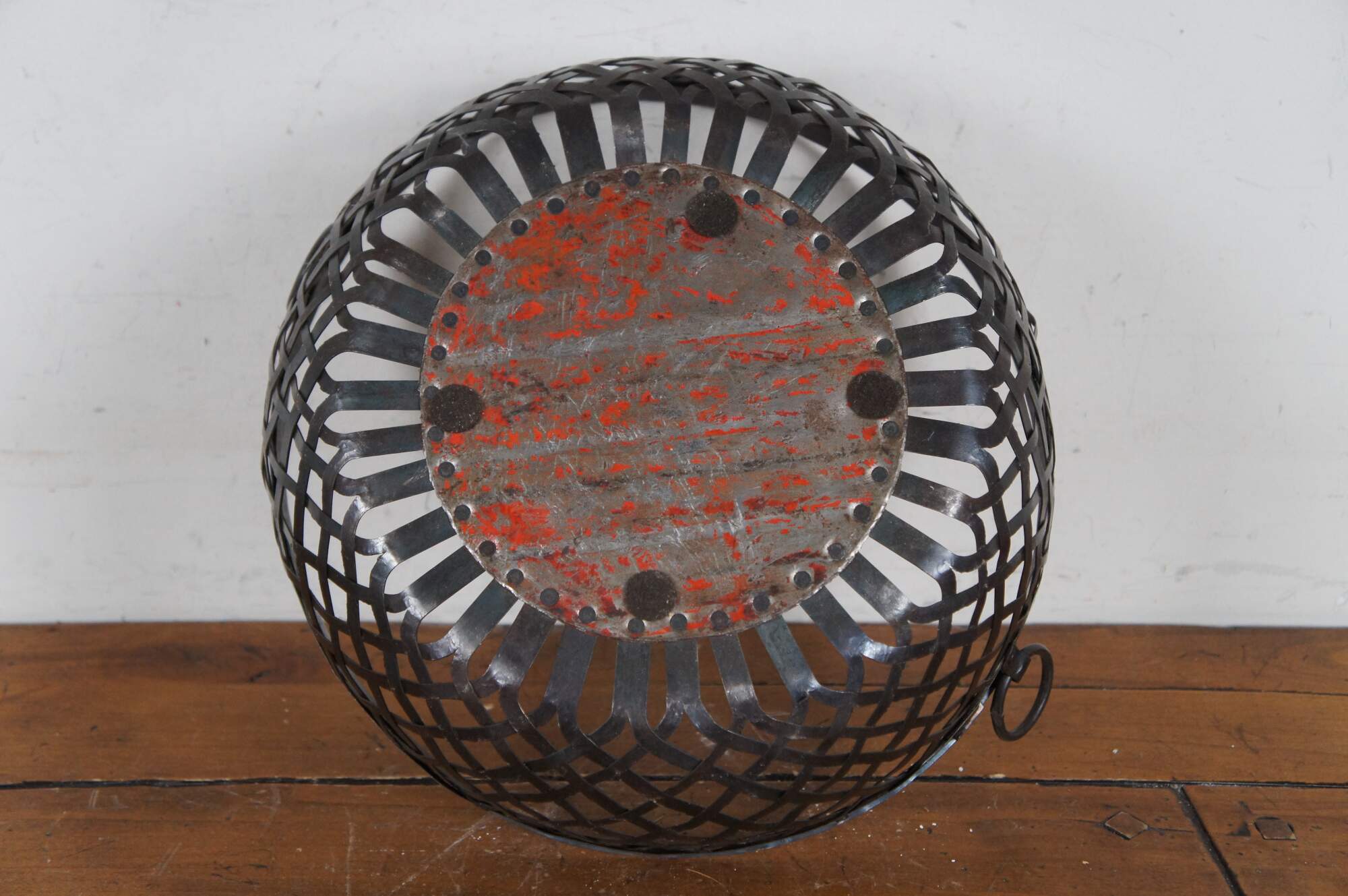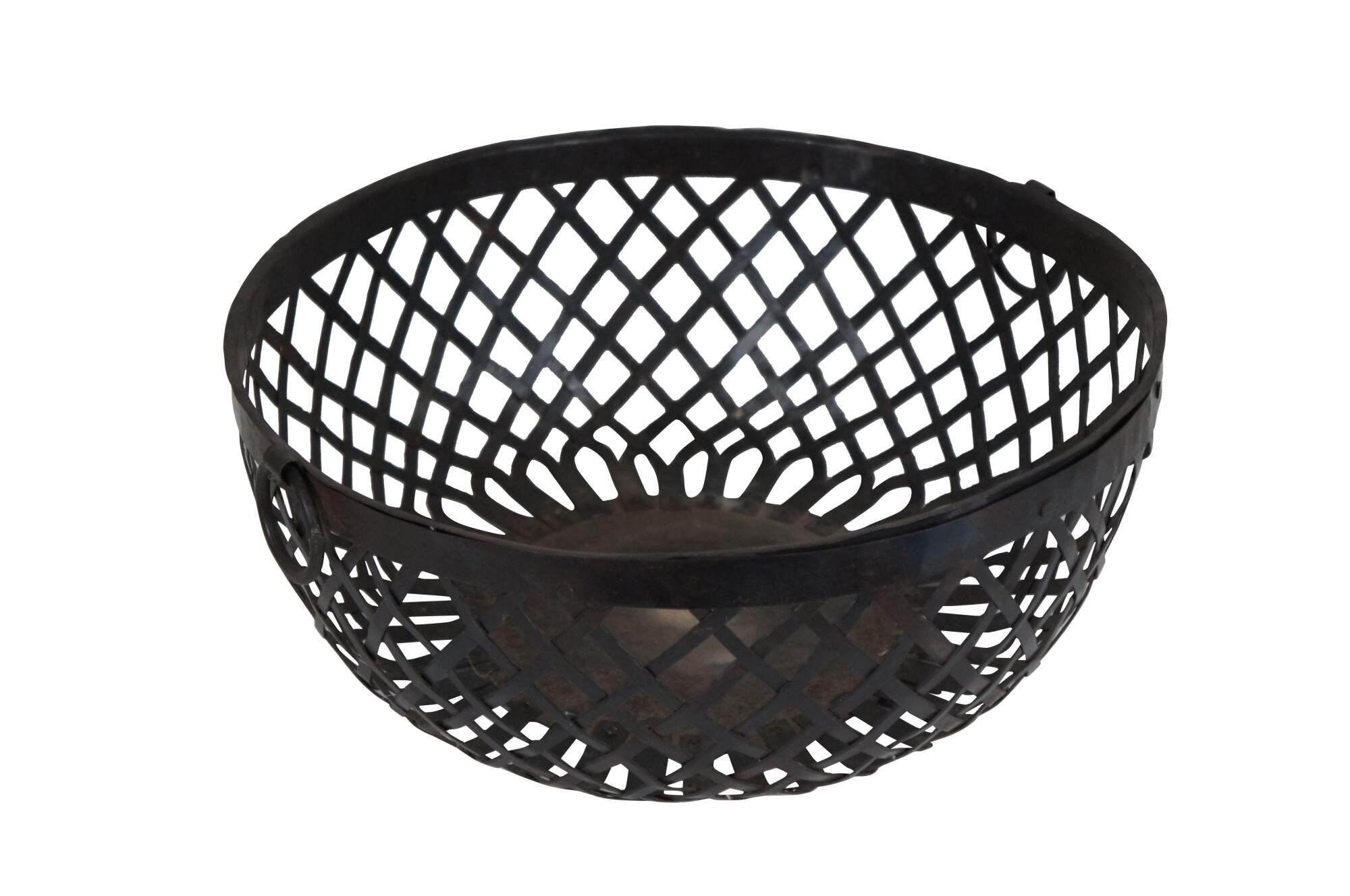 Late 20th century woven metal / iron centerpiece or fruit basket. Round Brutalist form with flat base and two hanging rings / handles on either side. Made in India.