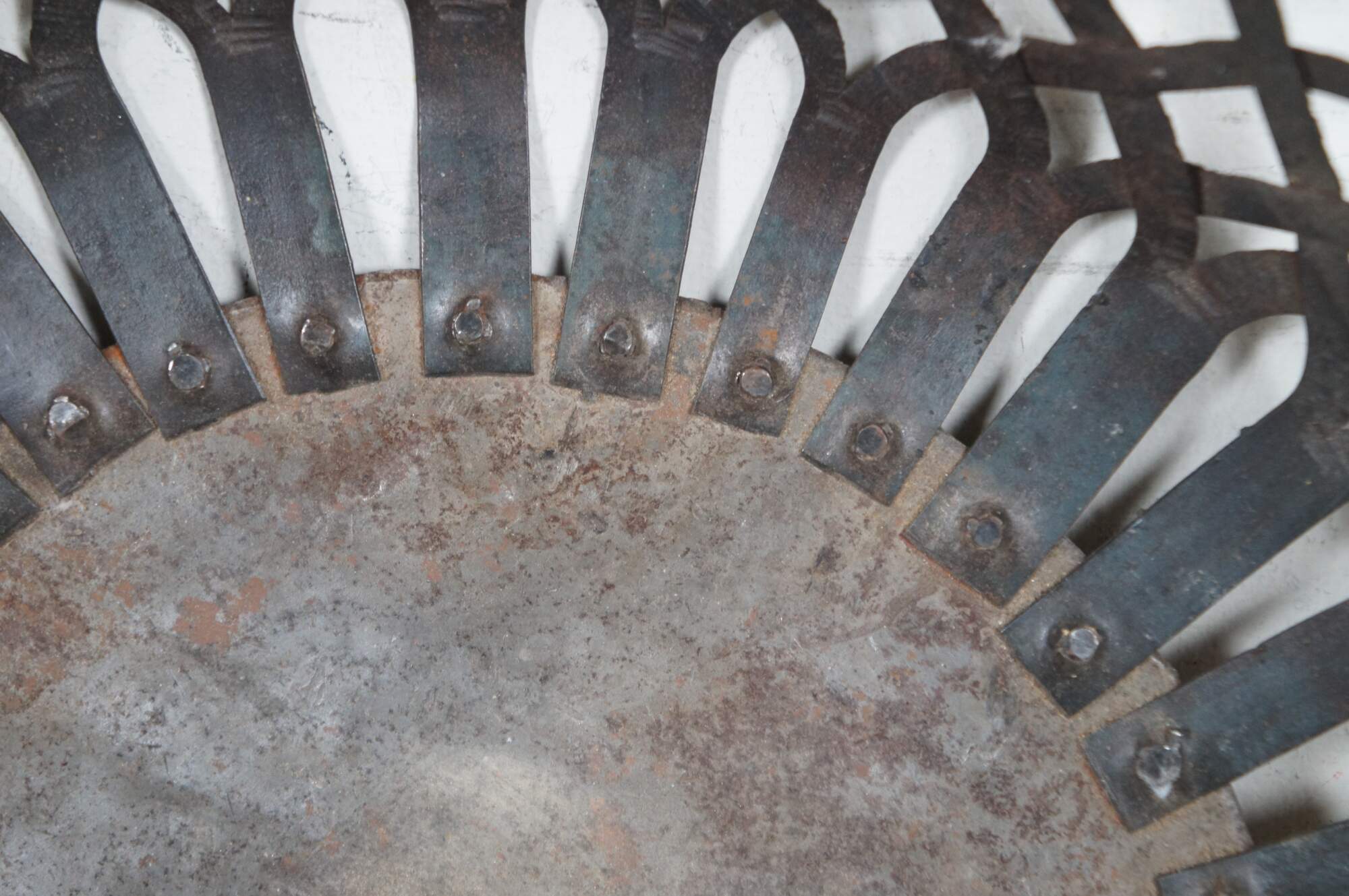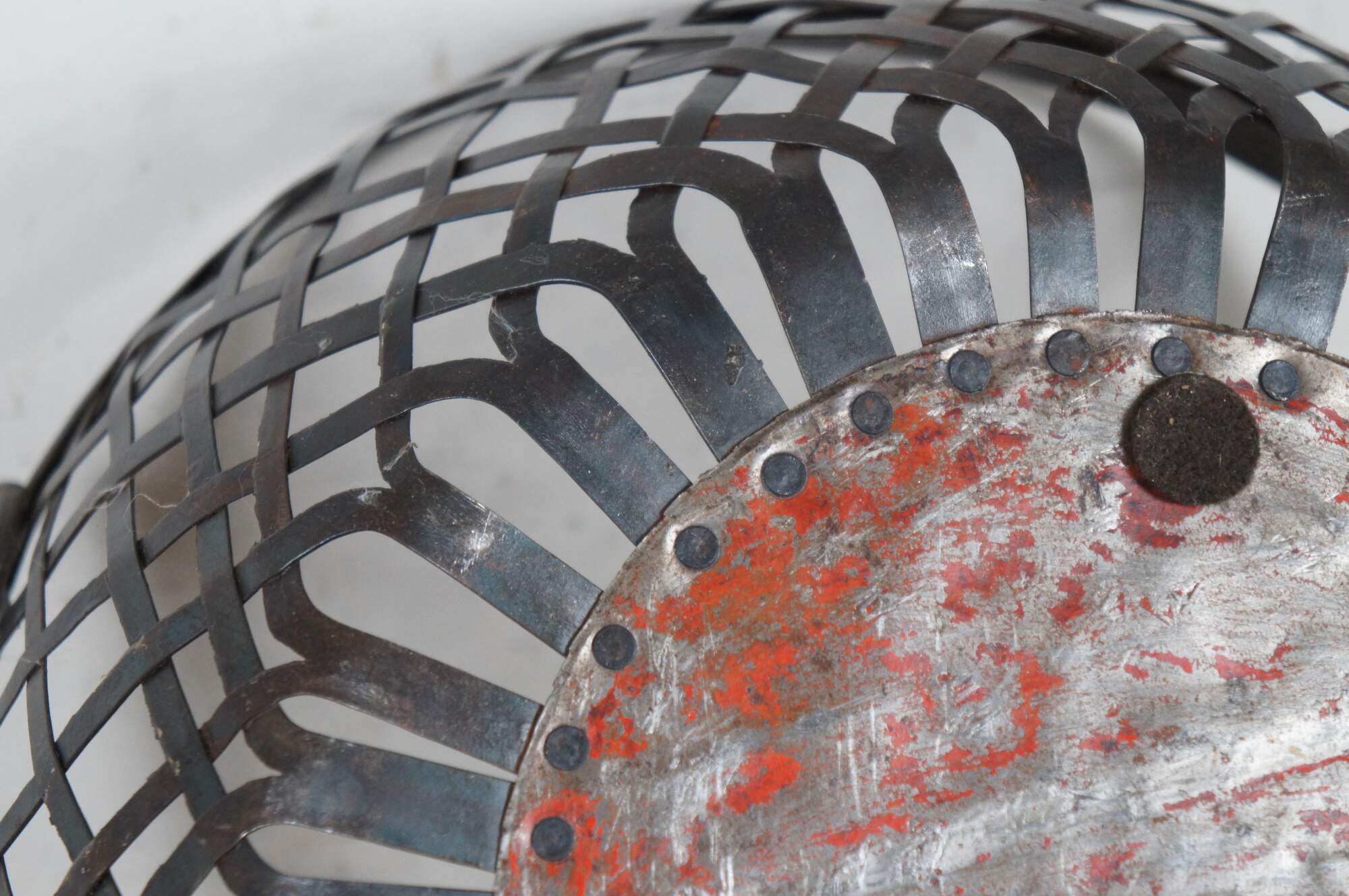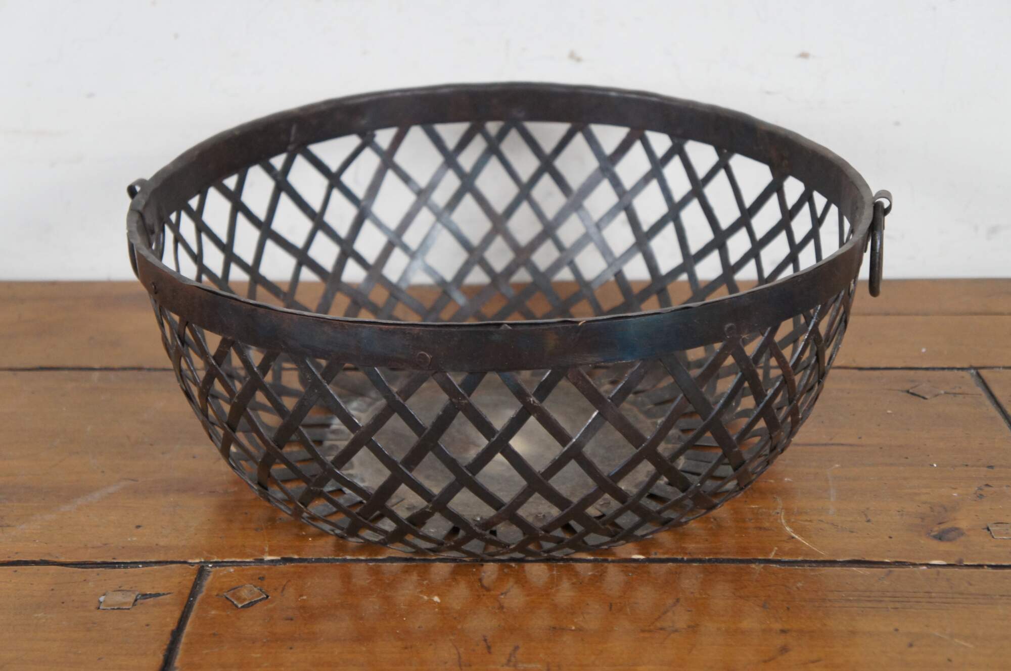 Late 20th century woven metal / iron centerpiece or fruit basket. Round Brutalist form with flat base and two hanging rings / handles on either side. Made in India.