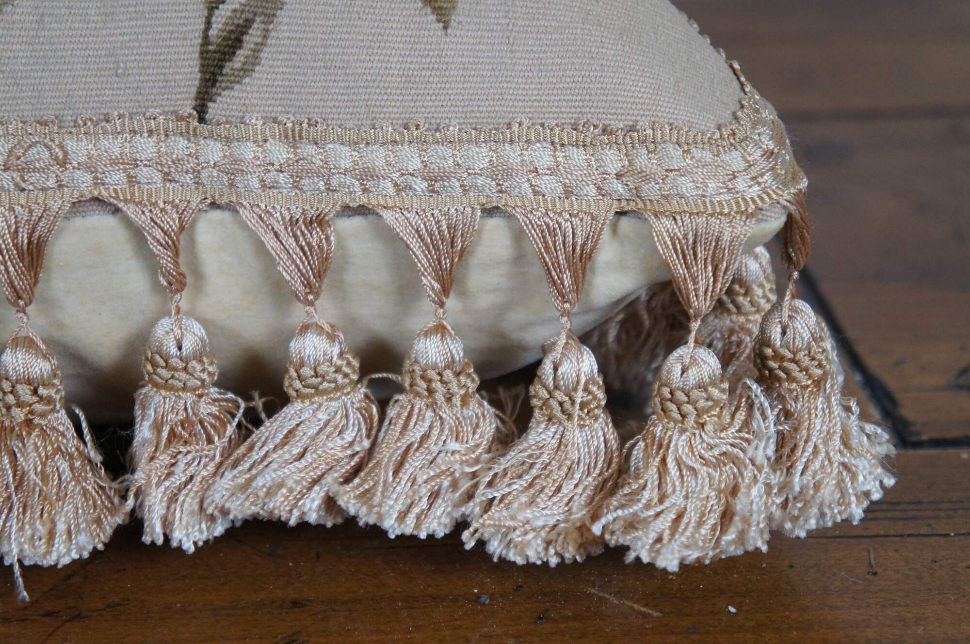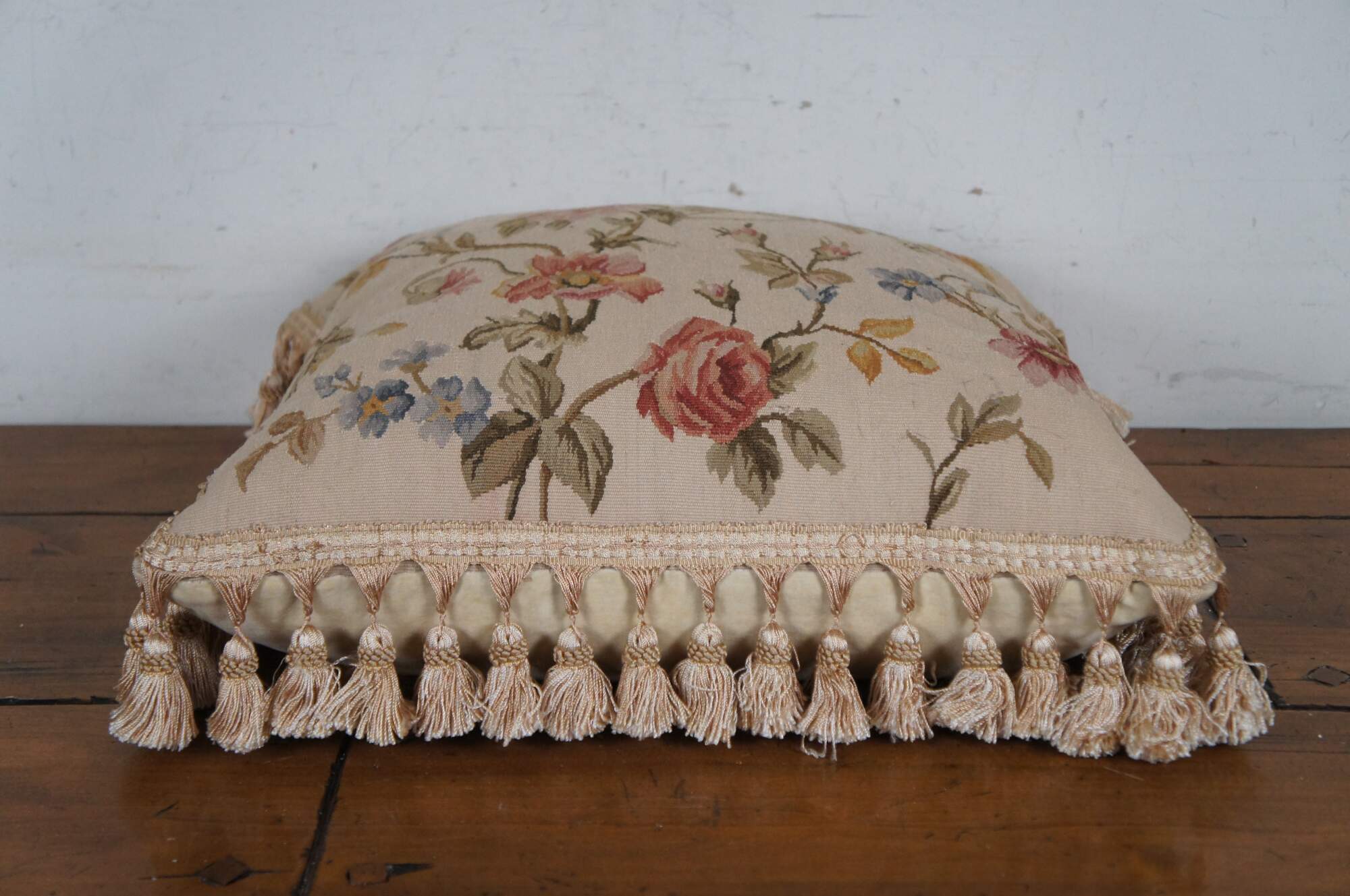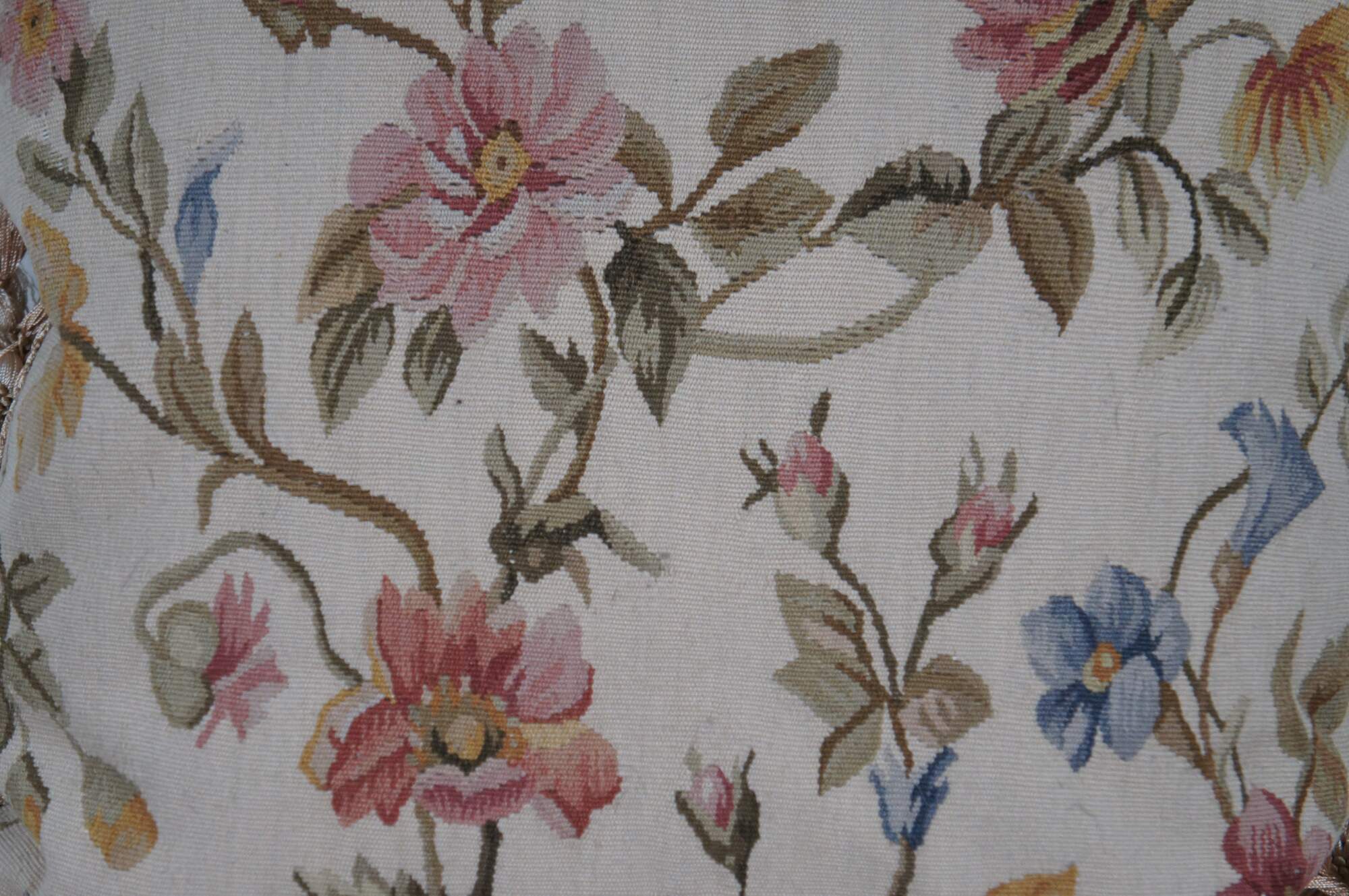 20th century square throw pillow, machine embroidered with green stems of pink and blue flowers on a beige background. Beige tassel trim. Beige velour back with zipper closure. Down filled.