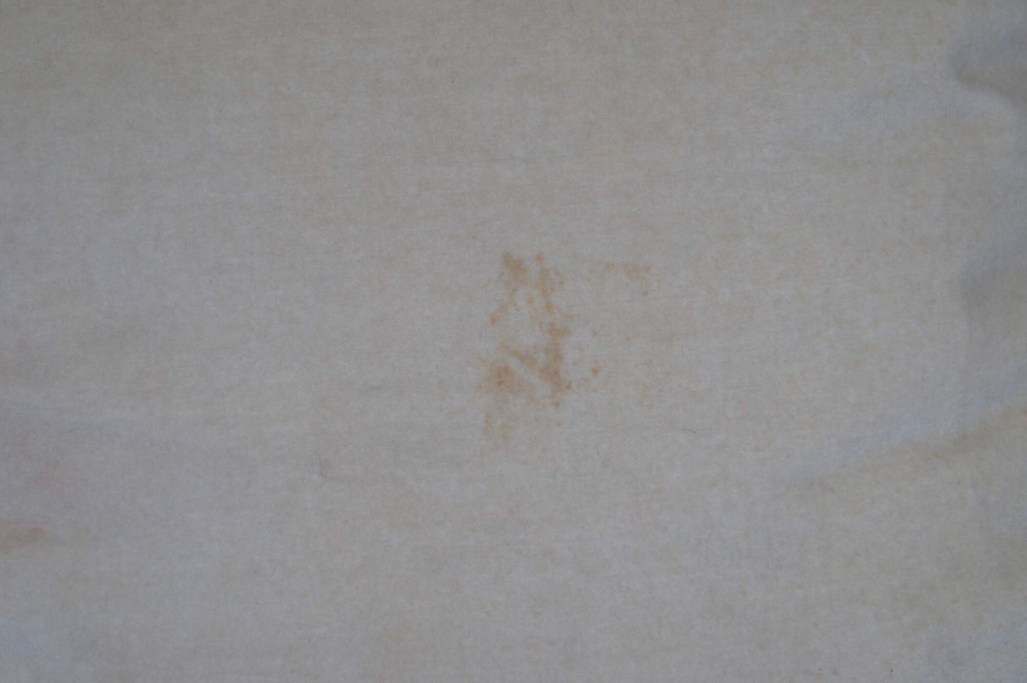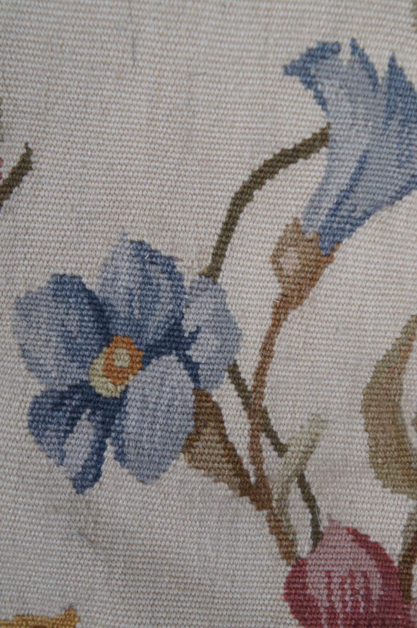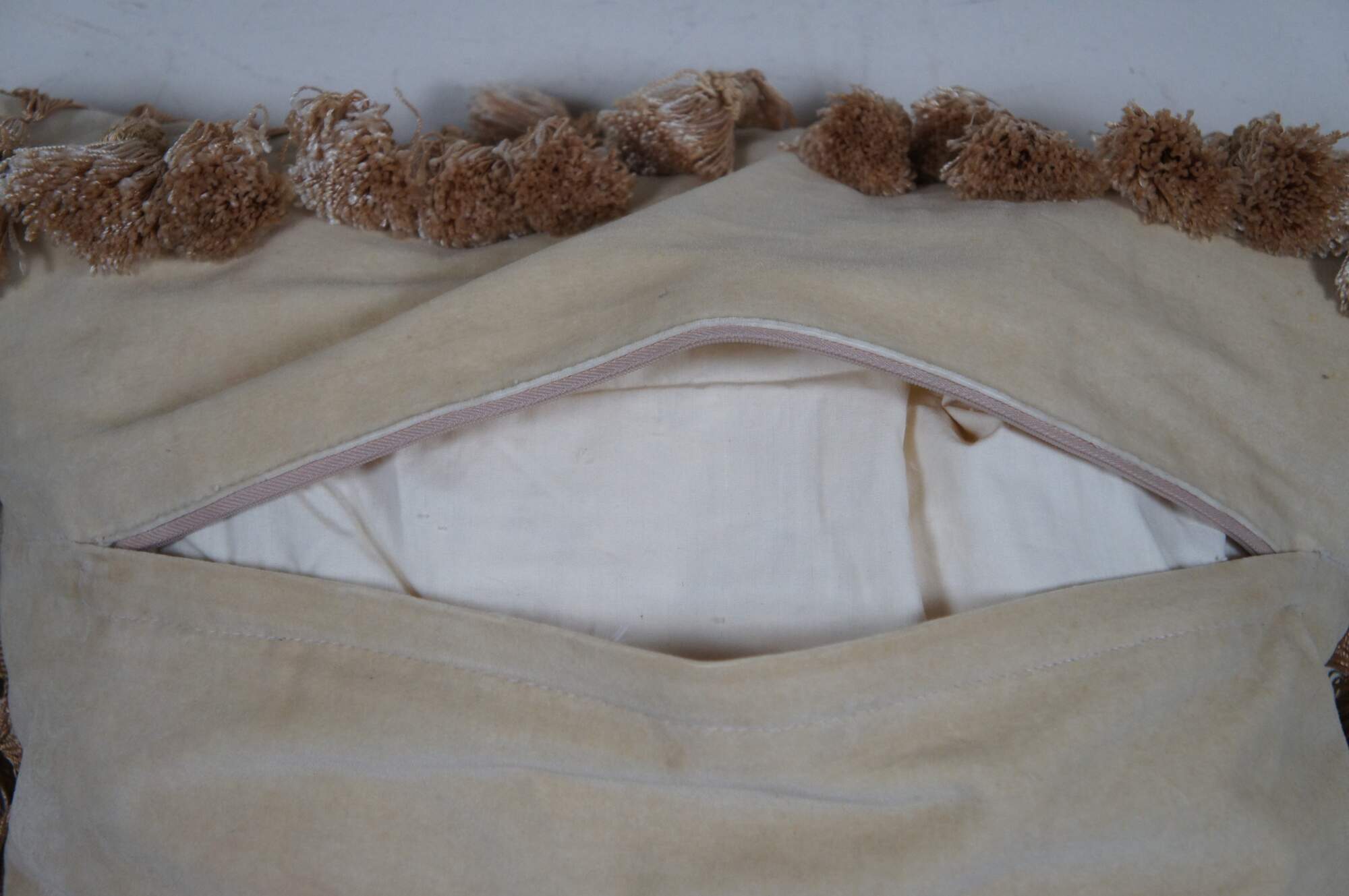 20th century square throw pillow, machine embroidered with green stems of pink and blue flowers on a beige background. Beige tassel trim. Beige velour back with zipper closure. Down filled.