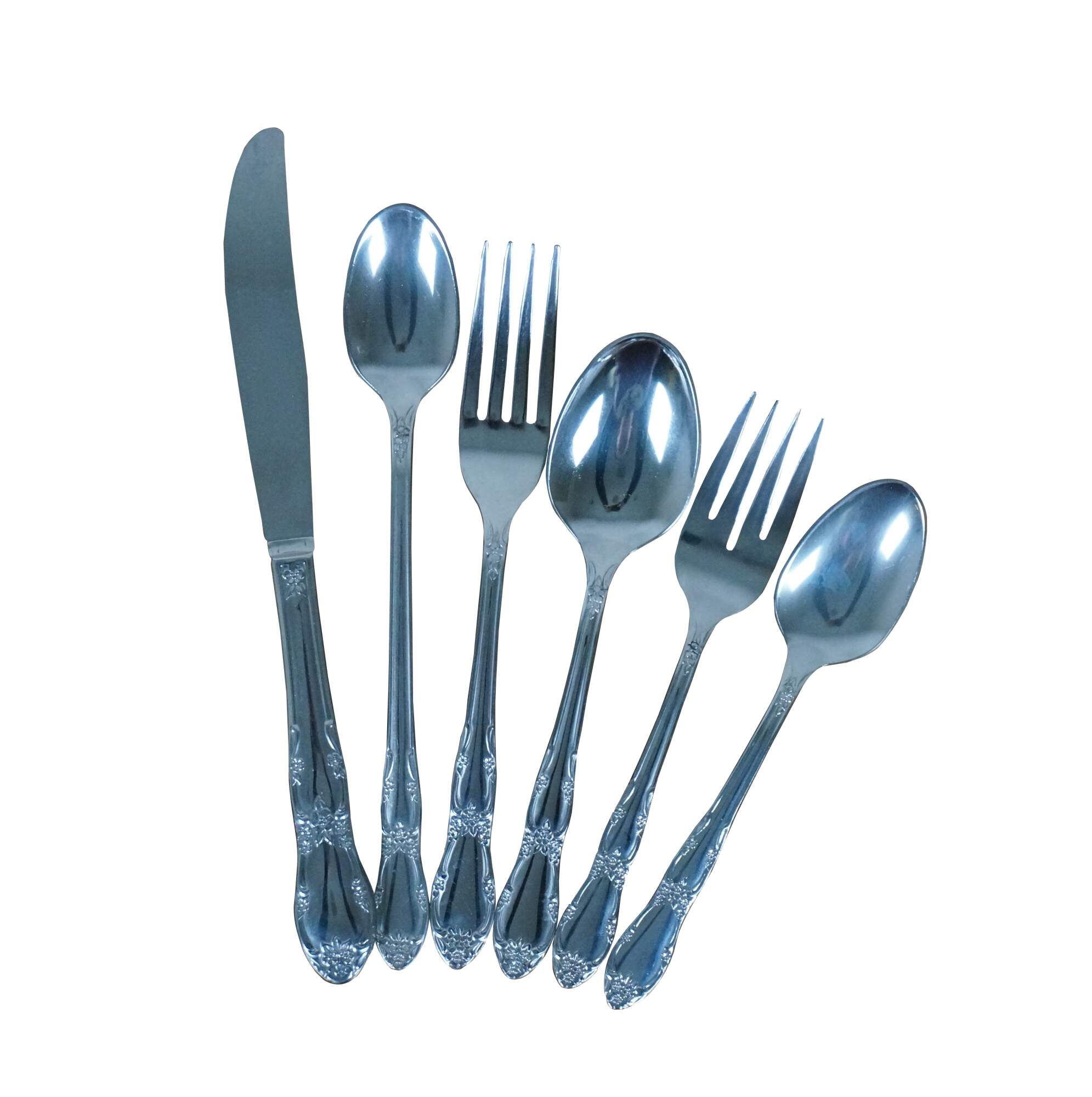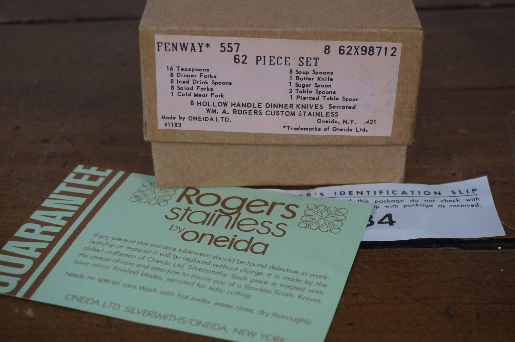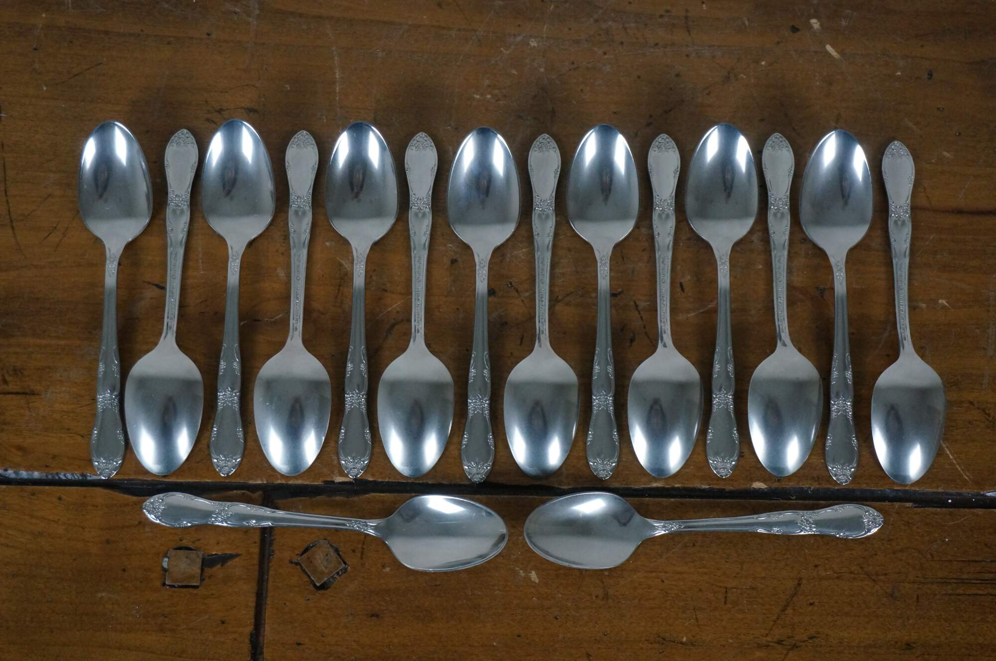 Vintage 48 piece set of Wm. A. Rogers / Oneida Ltd stainless steel flatware / utensils in the Fenway Daydream pattern. Originally a set of 62 pieces. Set currently includes: 16 Teaspoons, 1 Dinner Fork, 1 Iced Tea Spoon, 8 Salad Forks, 1 Cold Meat Fork, 8 Soup (Table) Spoons, 1 Butter Knife, 1 Sugar Spoon, 2 Table (Serving) Spoons, 1 Pierced Table (Serving) Spoon, 8 Dinner Knives.